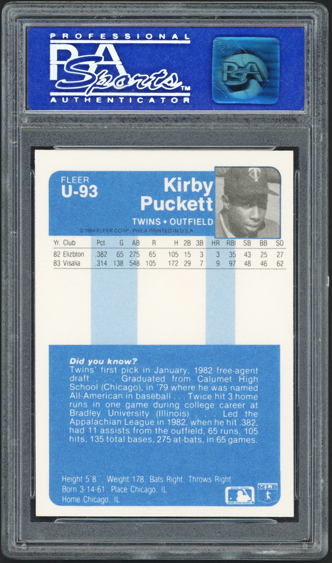 1984 Fleer Update U93 Kirby Puckett (R) card. The card has been graded and encapsulated by PSA Gem Mint 10. It has a clear image of Puckett kneeling with his bat set against a field backdrop. The edges appear crisp while all four corners are sharp. Centering is near perfect. The reverse is bright and clean. According to the population report, 652 examples have achieved this grade.