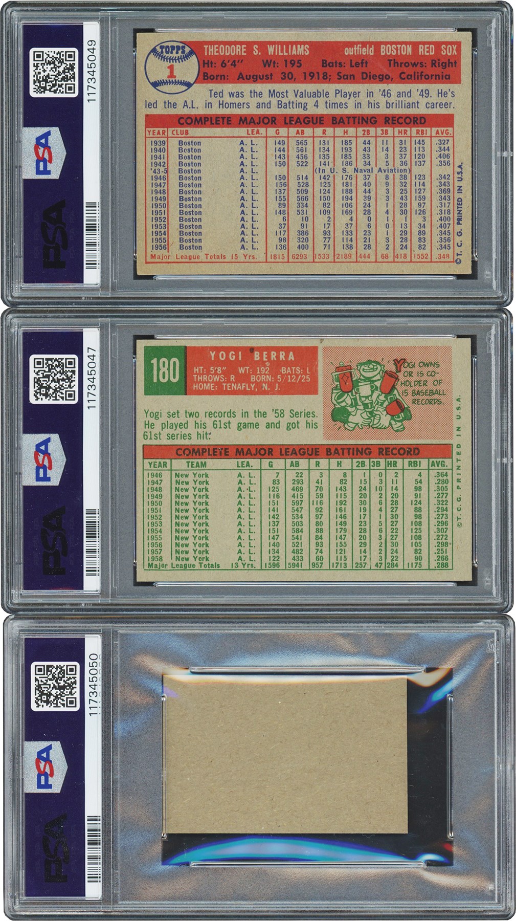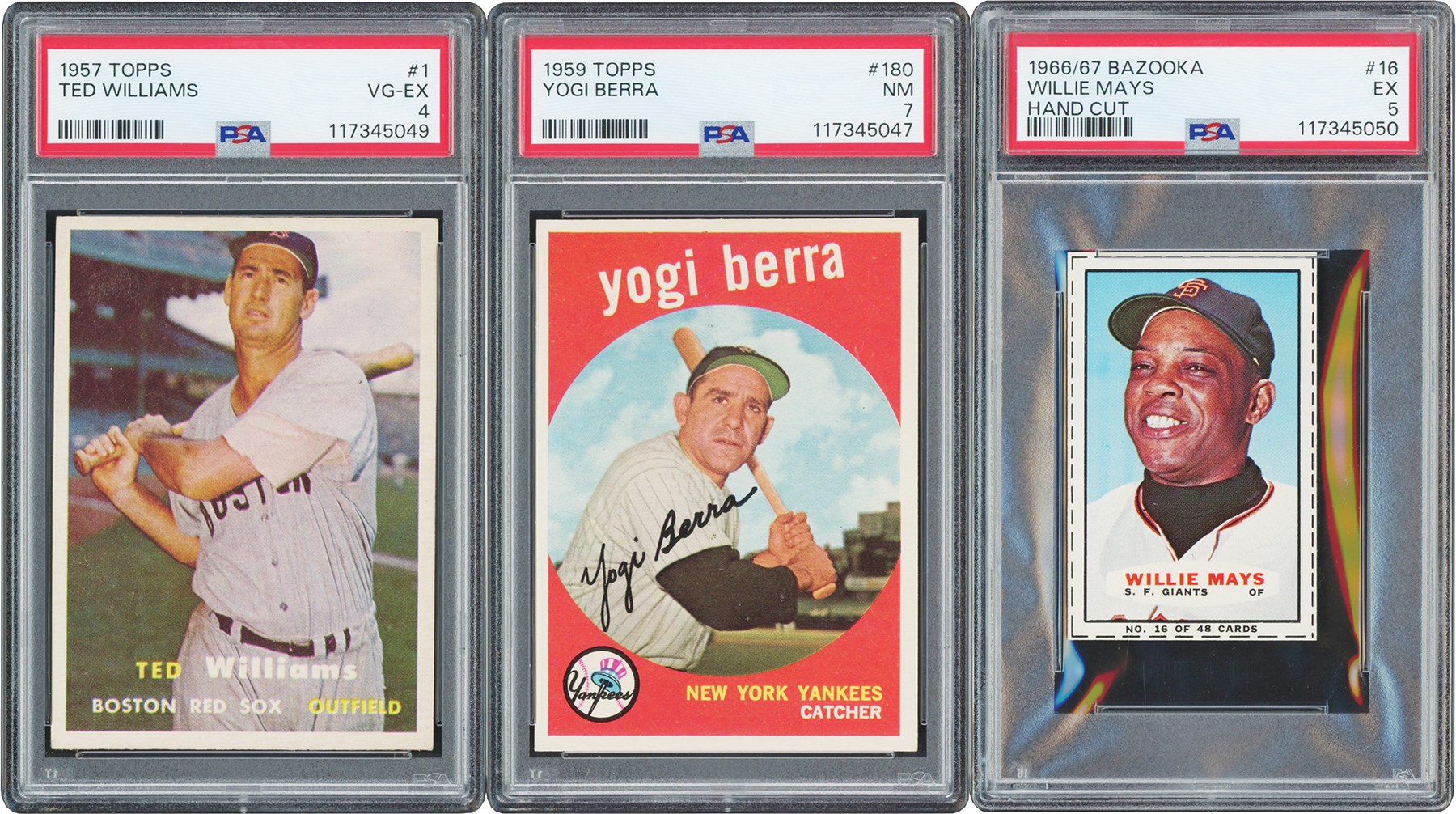1957-66 Topps and Bazooka Baseball collection of (3) cards. All of the cards have been graded and encapsulated by PSA with: 1957 Topps 1 Ted Williams VG-EX 4; 1959 Topps 180 Yogi Berra NM 7; 1966-67 Bazooka 16 Willie Mays EX 5-hand cut.