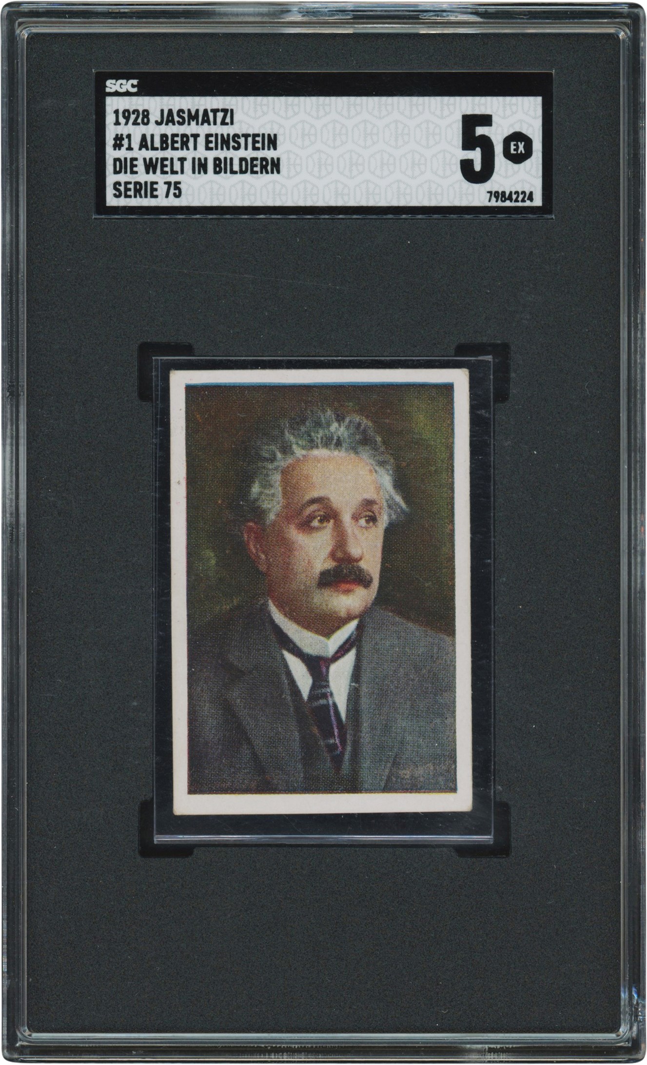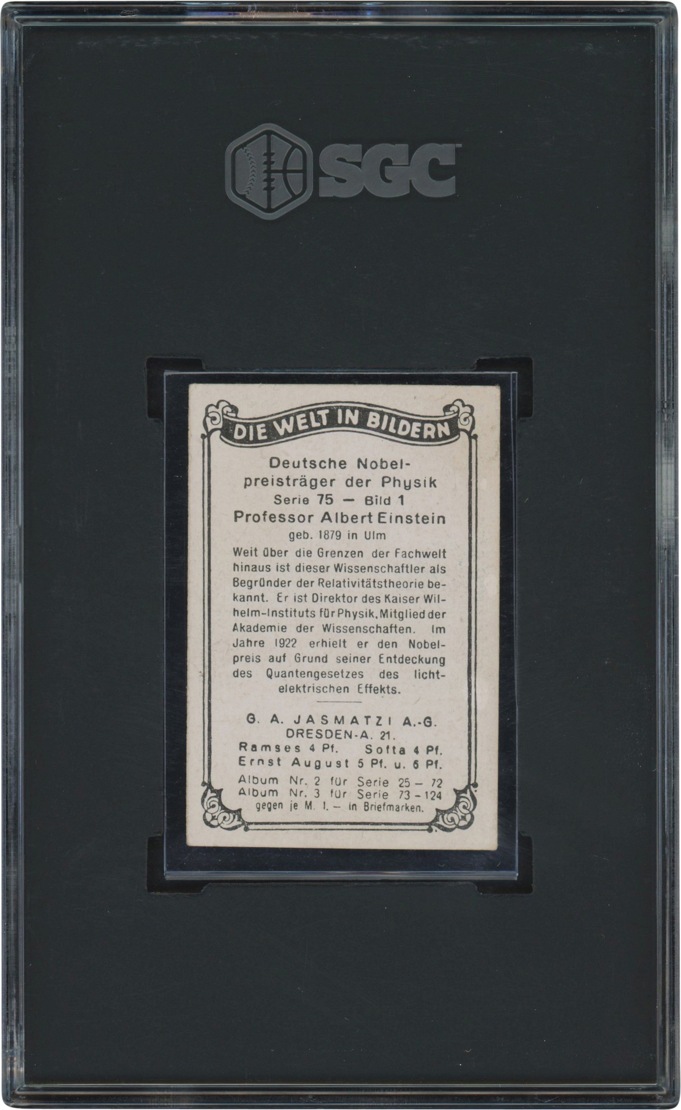1928 Jasmatzi #1 Albert Einstein Die WeltIn Bildern Serie 75 card. The card has been graded and encapsulated by SGC EX 5. It has a clear portrait image of Einstein set against a dark background. The borders remain white while the edges exhibit very light roughness. Centering is slightly off top to bottom. All four corners have light wear. The reverse is bright and clean.