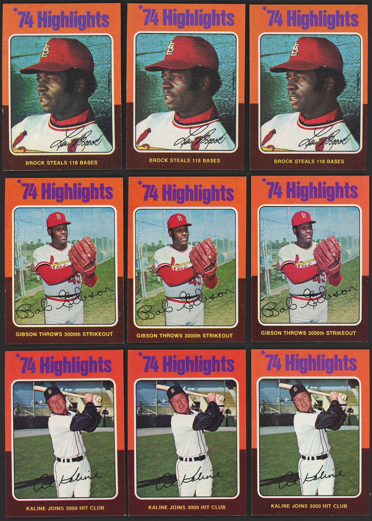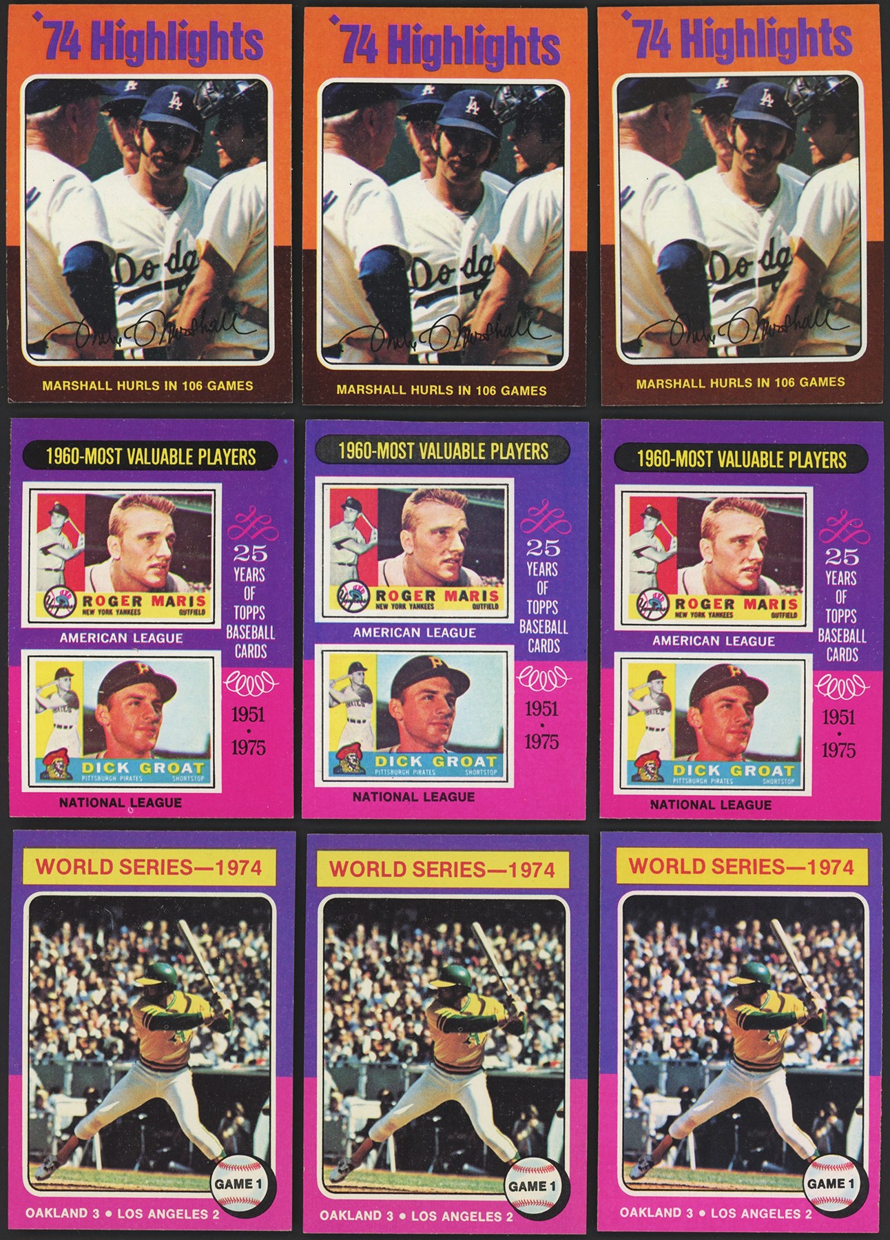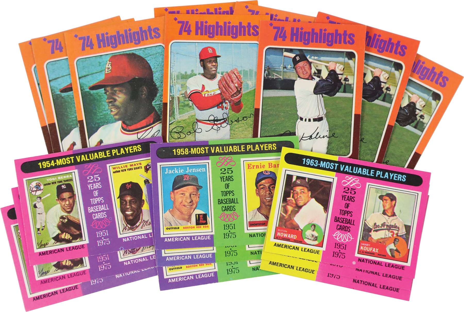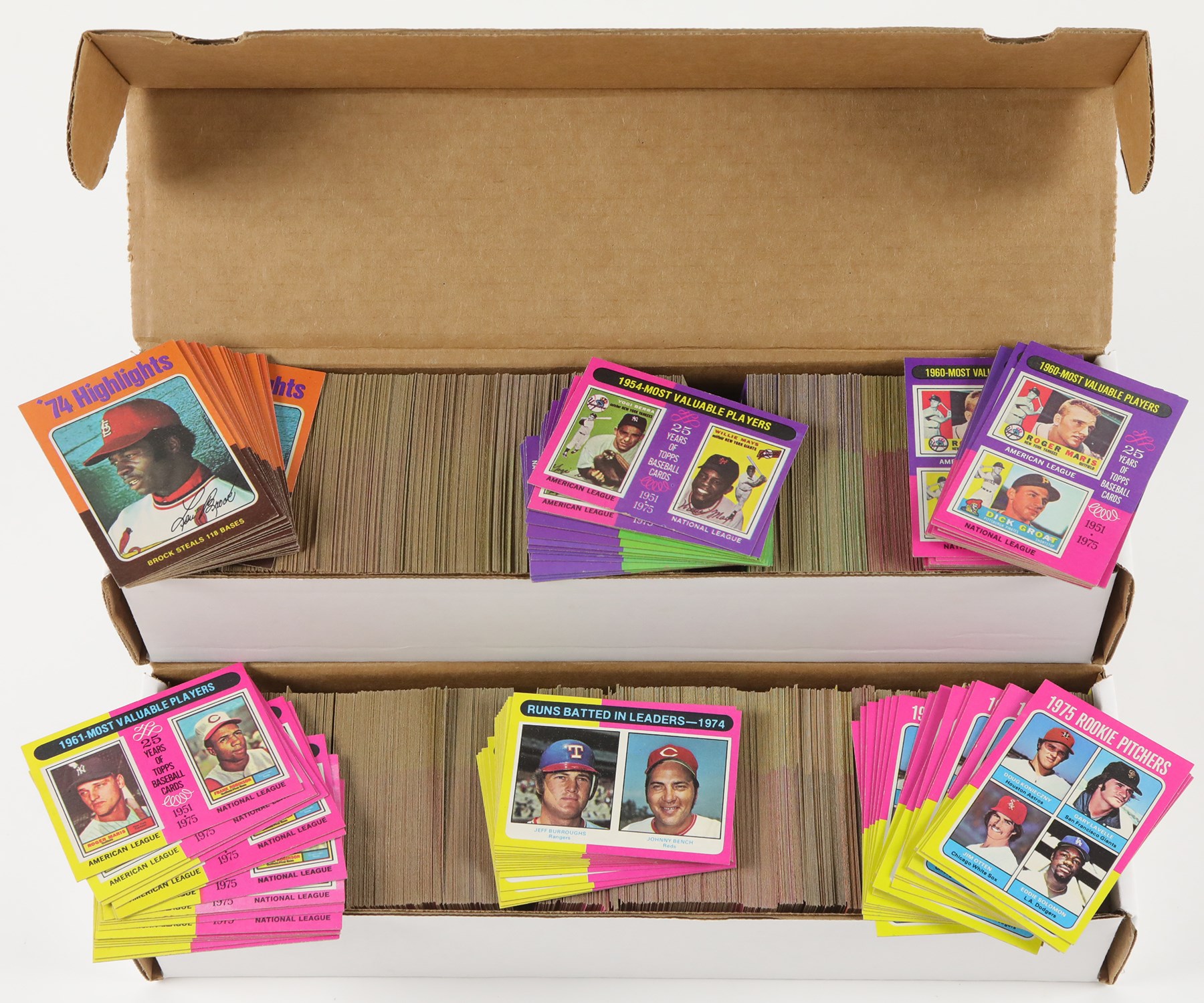 1975 Topps Baseball Specialty Collection (1,645). All the cards in this lot are either, Highlights, Team Cards, MVP's, Leaders, or 4 in 1 Rookies. There is heavy duplication of every card included. The lot includes: (27) #2 Brock, (16) #3 Gibson, (28) #4 Kaline, (20) #6, (97) #46, (68) #189, (68) #190, (64) #191, (47) #192 w/Mays, (56) #193, (91) #196 w/Banks, (105) #197 w/Banks, (112) #198 w/Maris, (120) #199 w/Maris & Frank Robinson, (129) #201 w/Koufax, (71) #306 w/Carew, (23) #307, (46) #308 w/Bench, (44) #309 w/Brock, (115) #310, (22) #461, (69) #462, (31) #463, (37) #621 w/Denny, (84) #624. The overwhelming majority of the cards in this group grade between EX and NM with some better and some worse.