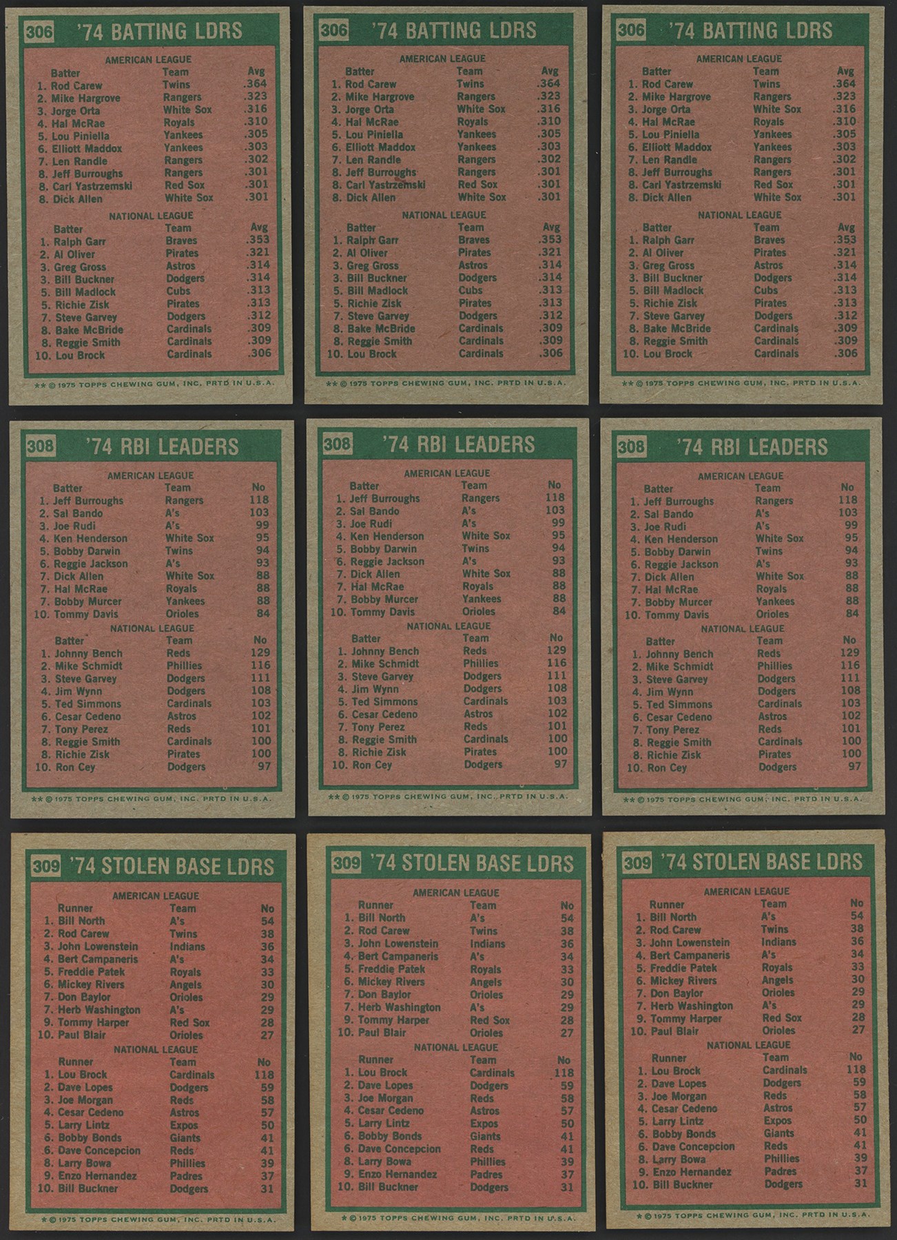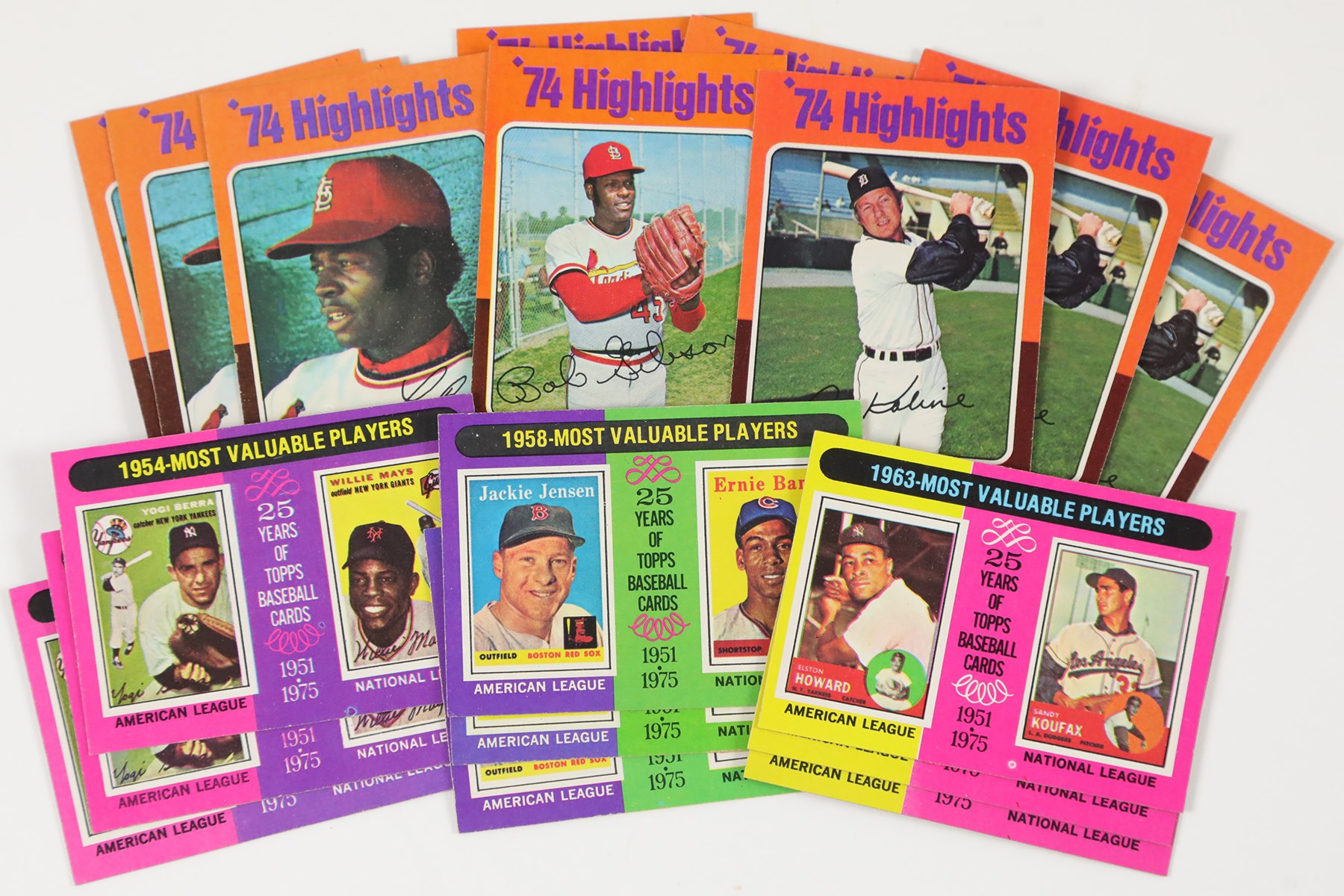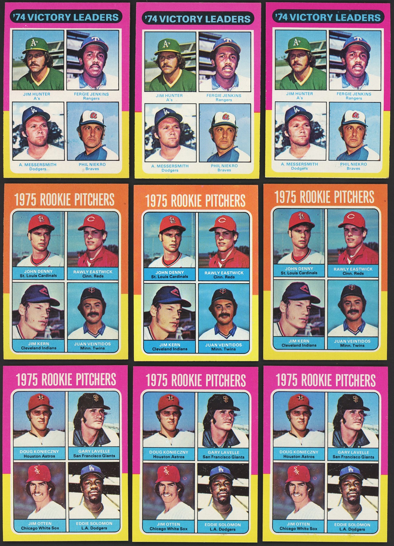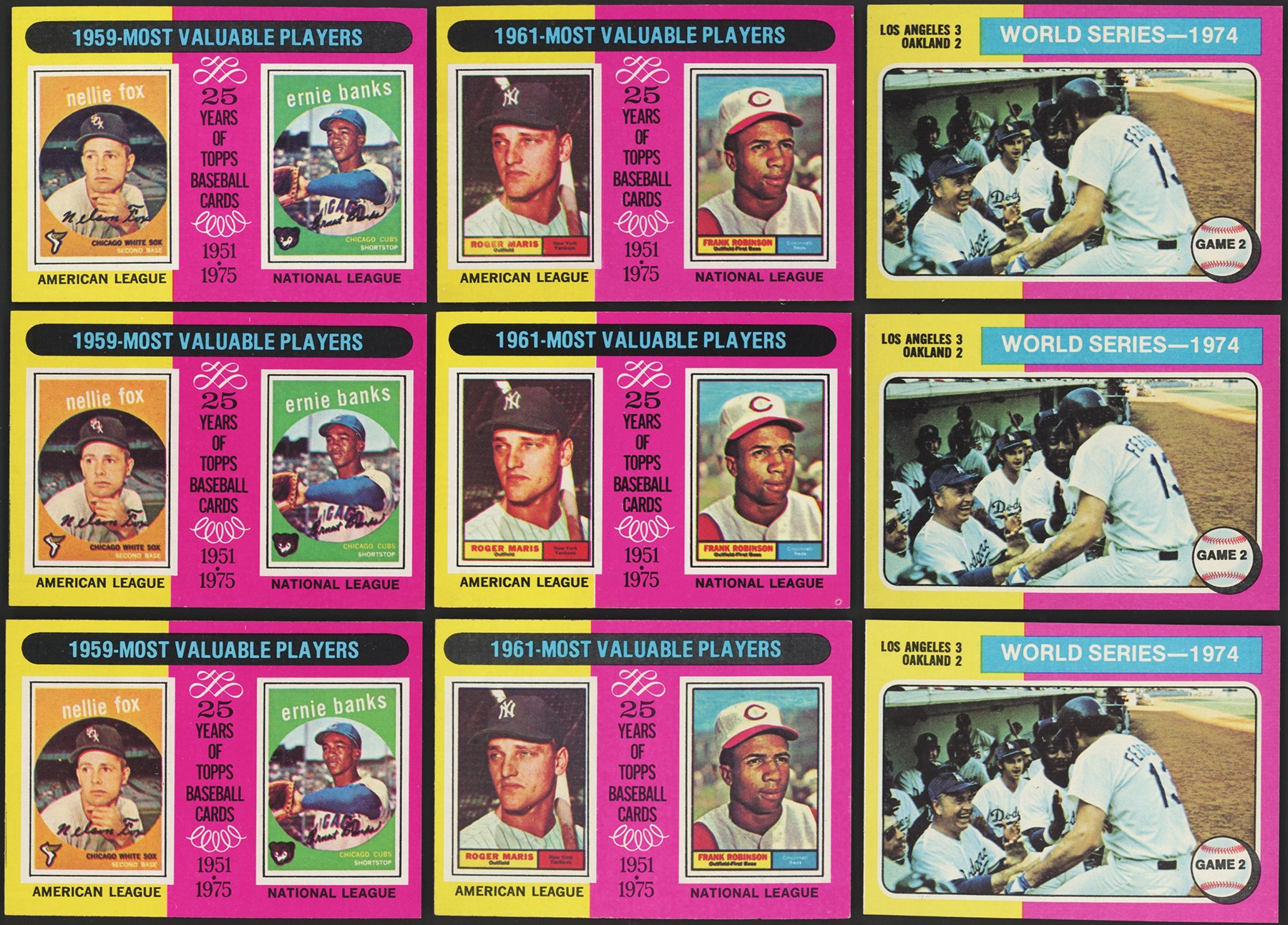 1975 Topps Baseball Specialty Collection (1,645). All the cards in this lot are either, Highlights, Team Cards, MVP's, Leaders, or 4 in 1 Rookies. There is heavy duplication of every card included. The lot includes: (27) #2 Brock, (16) #3 Gibson, (28) #4 Kaline, (20) #6, (97) #46, (68) #189, (68) #190, (64) #191, (47) #192 w/Mays, (56) #193, (91) #196 w/Banks, (105) #197 w/Banks, (112) #198 w/Maris, (120) #199 w/Maris & Frank Robinson, (129) #201 w/Koufax, (71) #306 w/Carew, (23) #307, (46) #308 w/Bench, (44) #309 w/Brock, (115) #310, (22) #461, (69) #462, (31) #463, (37) #621 w/Denny, (84) #624. The overwhelming majority of the cards in this group grade between EX and NM with some better and some worse.