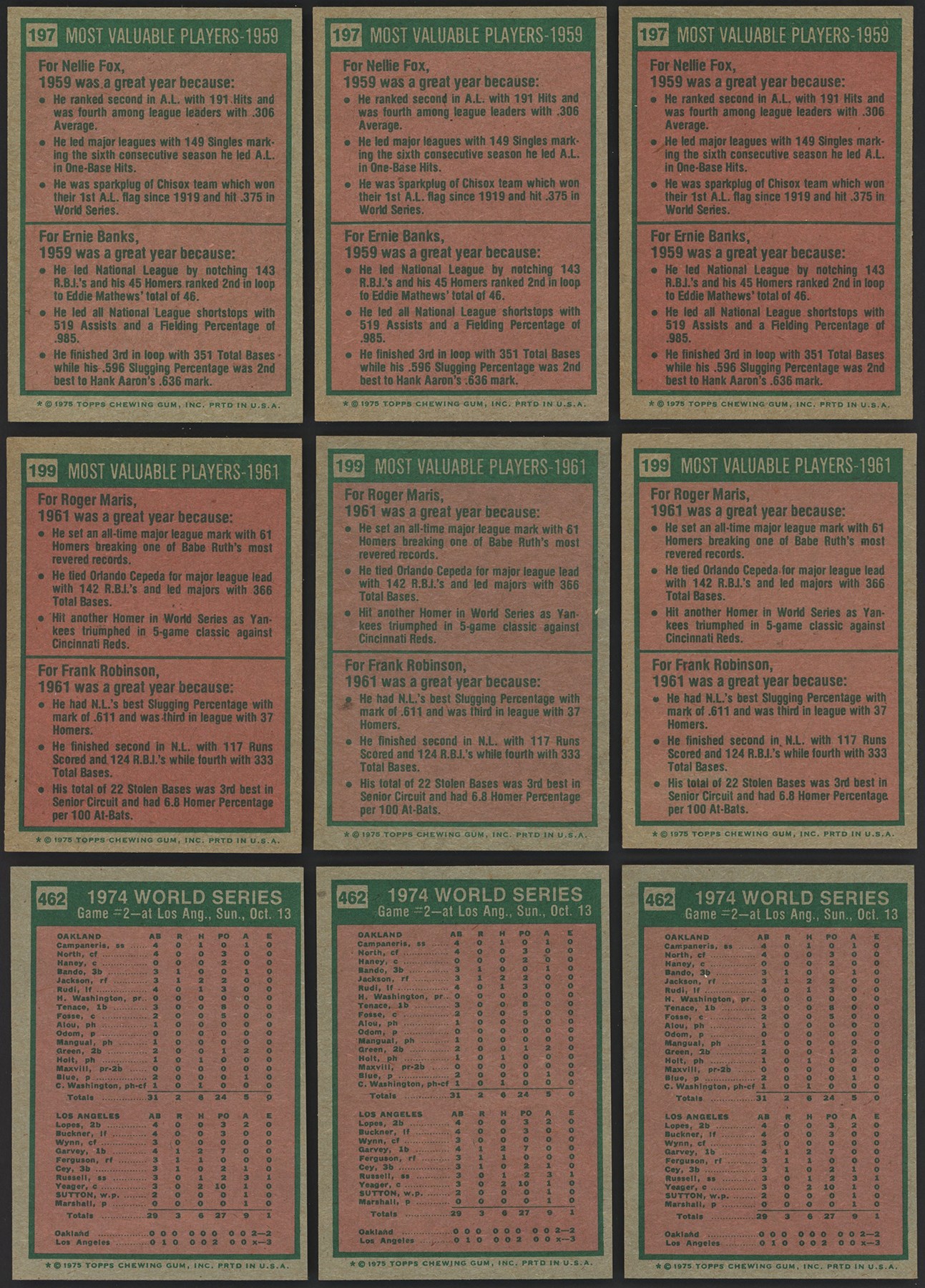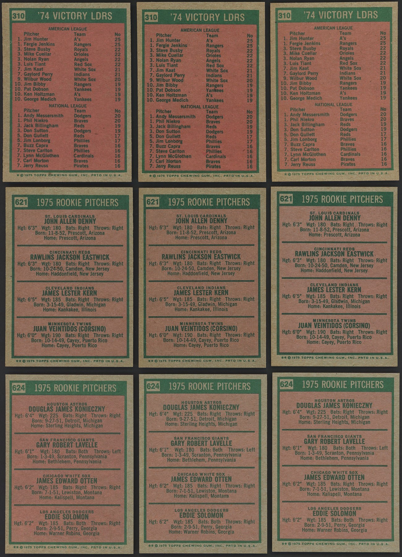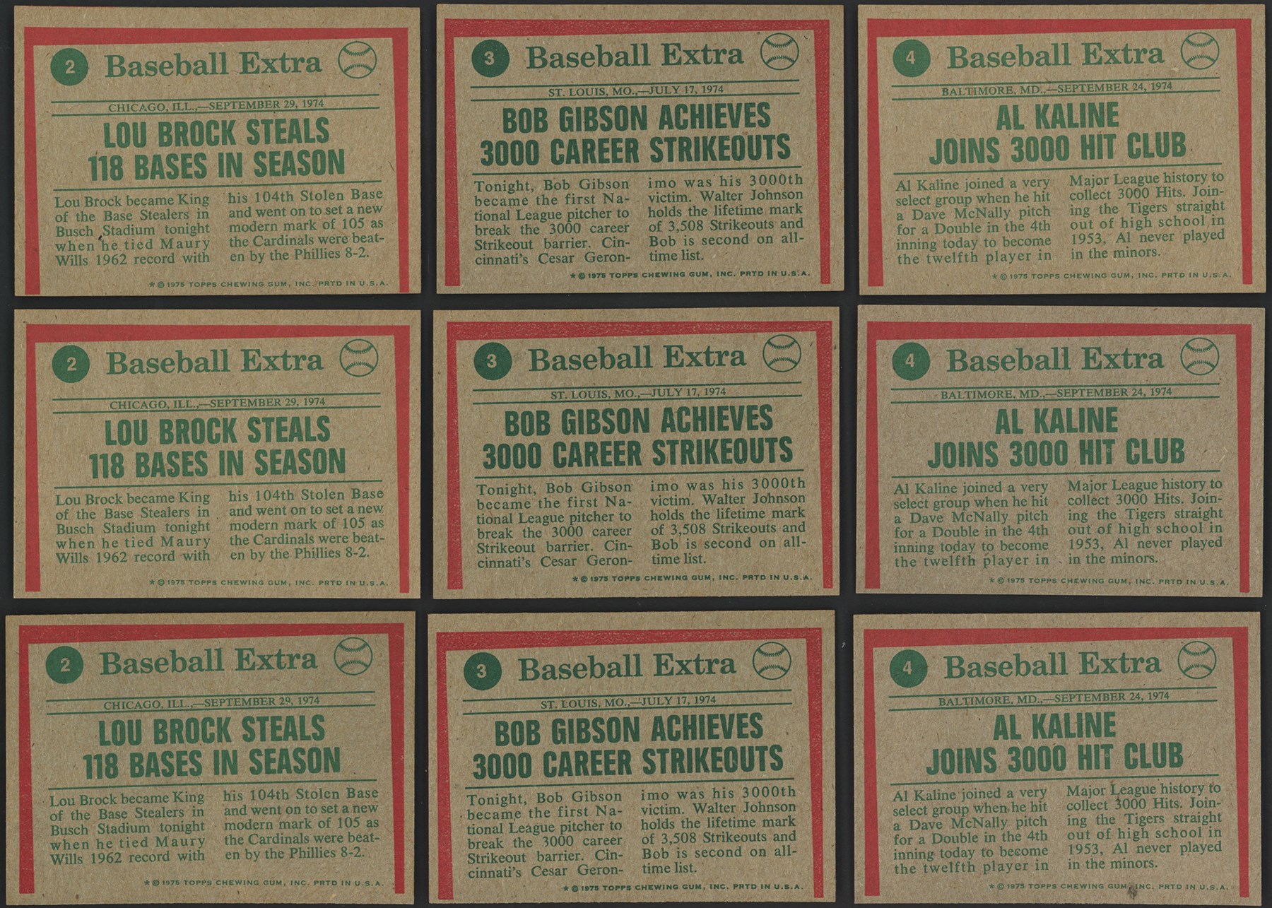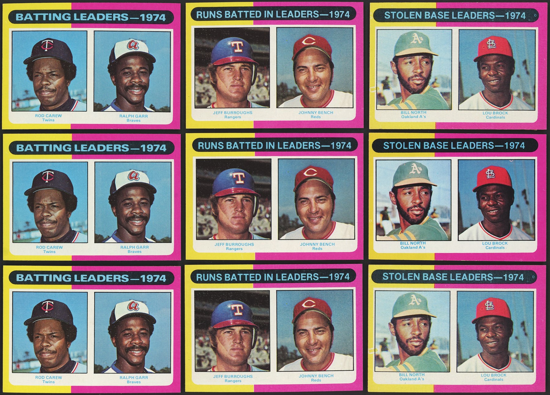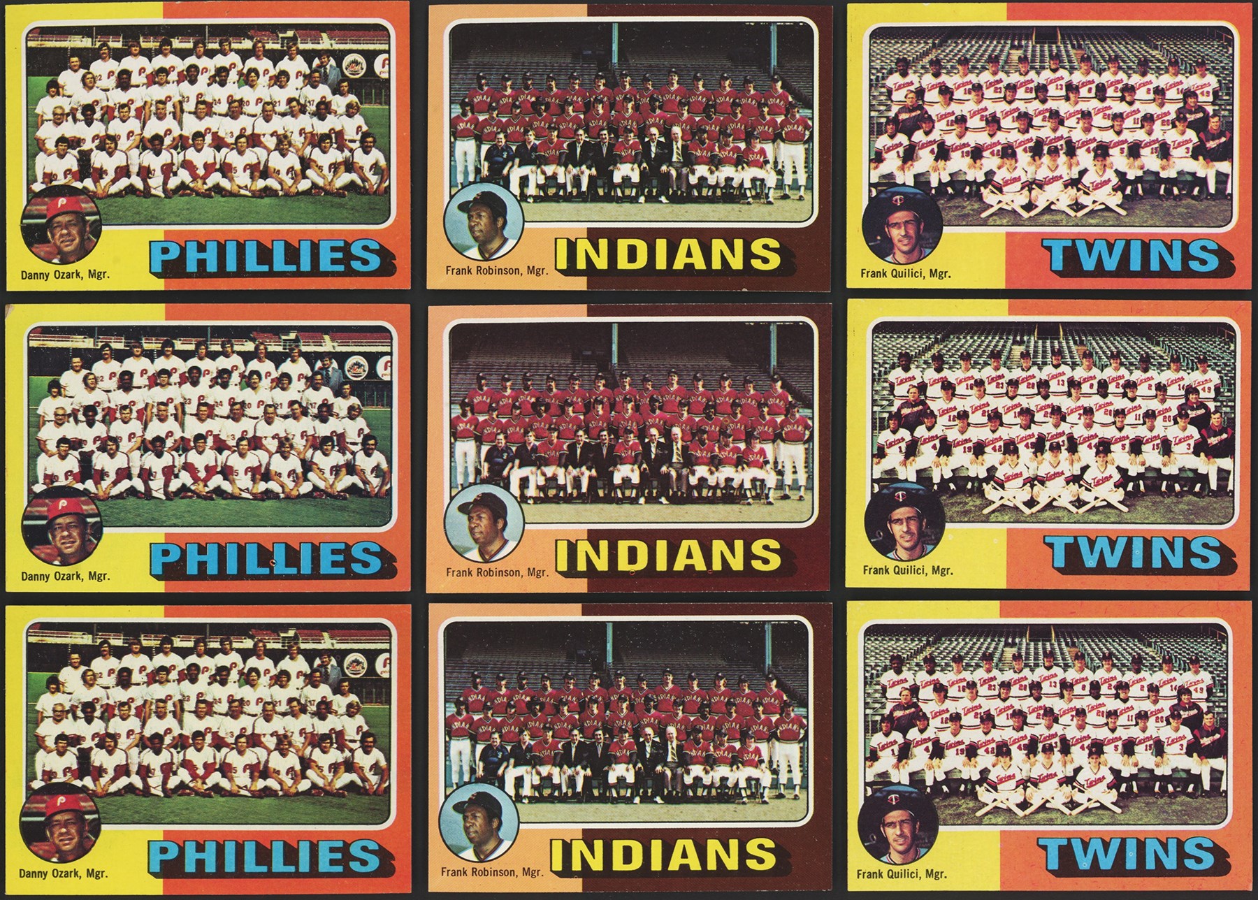 1975 Topps Baseball Specialty Collection (1,645). All the cards in this lot are either, Highlights, Team Cards, MVP's, Leaders, or 4 in 1 Rookies. There is heavy duplication of every card included. The lot includes: (27) #2 Brock, (16) #3 Gibson, (28) #4 Kaline, (20) #6, (97) #46, (68) #189, (68) #190, (64) #191, (47) #192 w/Mays, (56) #193, (91) #196 w/Banks, (105) #197 w/Banks, (112) #198 w/Maris, (120) #199 w/Maris & Frank Robinson, (129) #201 w/Koufax, (71) #306 w/Carew, (23) #307, (46) #308 w/Bench, (44) #309 w/Brock, (115) #310, (22) #461, (69) #462, (31) #463, (37) #621 w/Denny, (84) #624. The overwhelming majority of the cards in this group grade between EX and NM with some better and some worse.