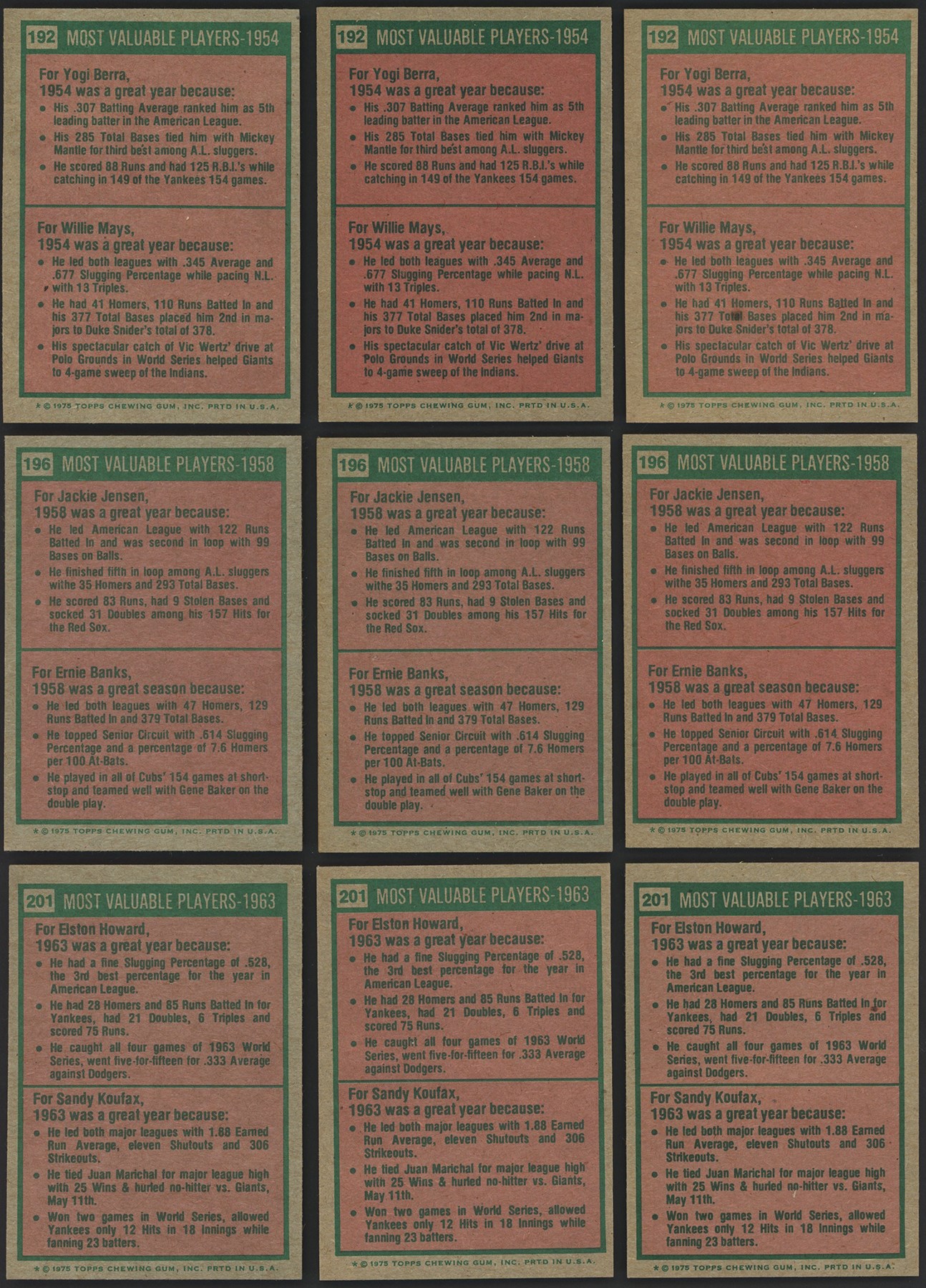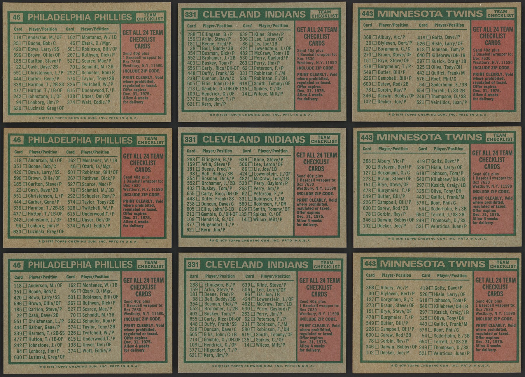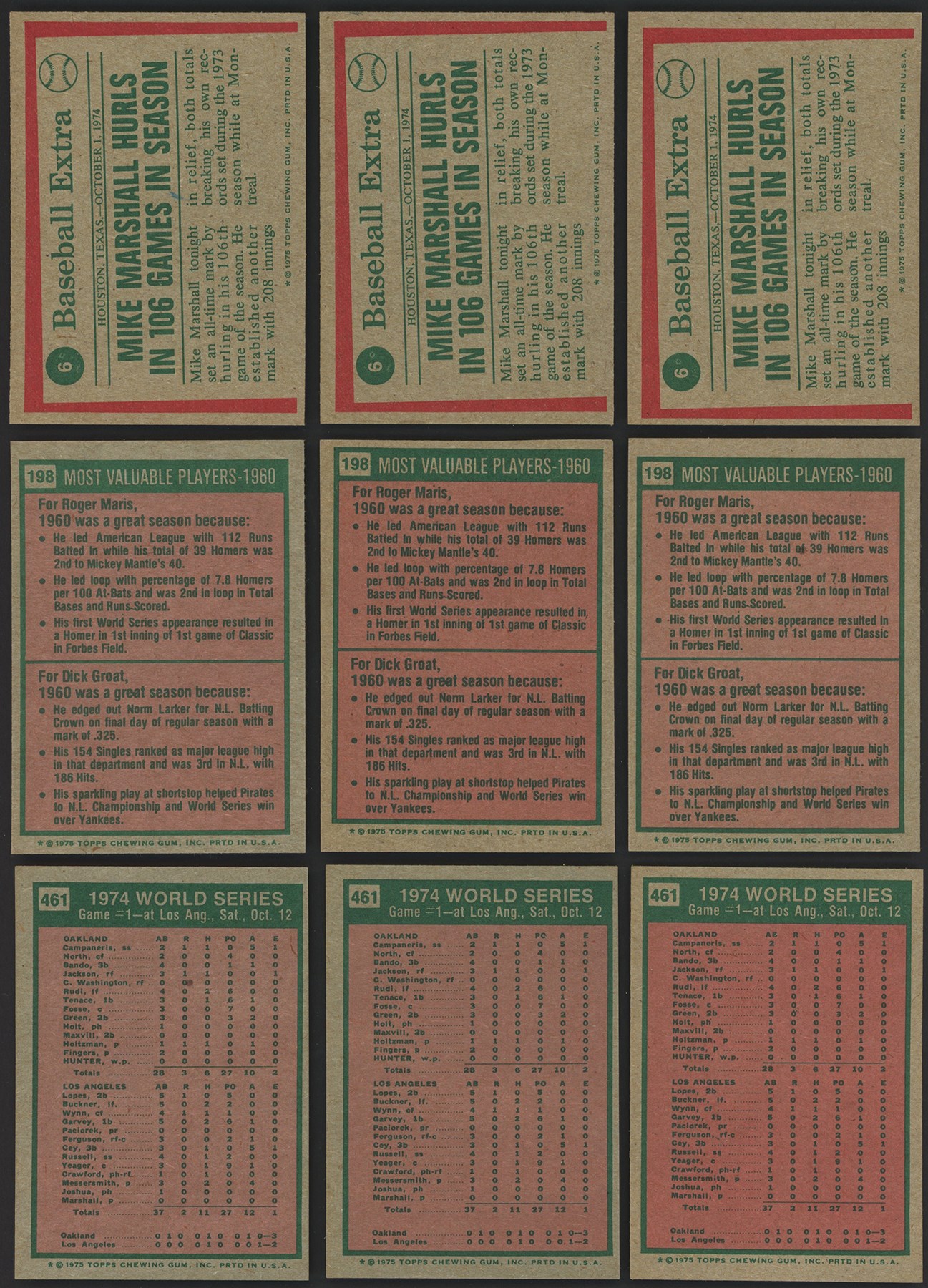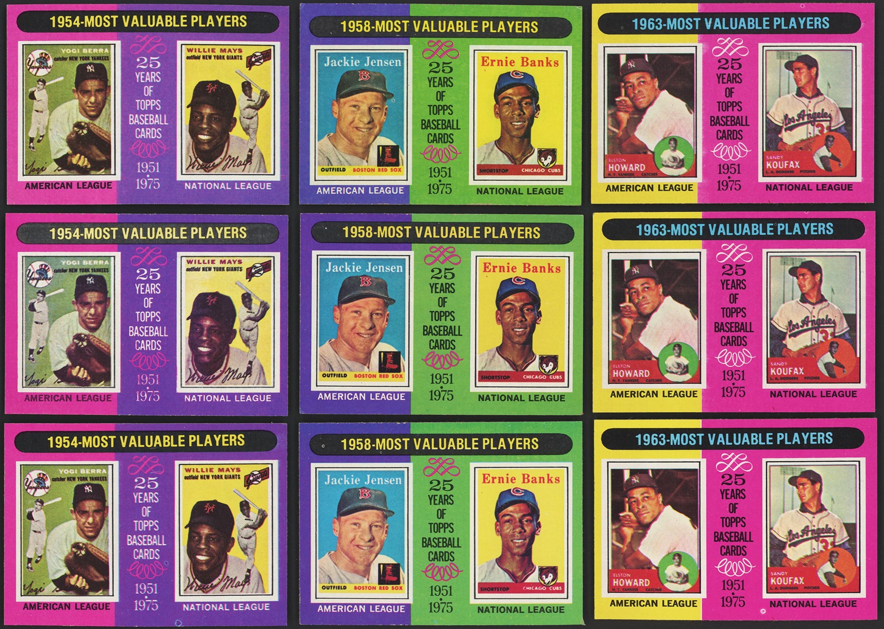 1975 Topps Baseball Specialty Collection (1,645). All the cards in this lot are either, Highlights, Team Cards, MVP's, Leaders, or 4 in 1 Rookies. There is heavy duplication of every card included. The lot includes: (27) #2 Brock, (16) #3 Gibson, (28) #4 Kaline, (20) #6, (97) #46, (68) #189, (68) #190, (64) #191, (47) #192 w/Mays, (56) #193, (91) #196 w/Banks, (105) #197 w/Banks, (112) #198 w/Maris, (120) #199 w/Maris & Frank Robinson, (129) #201 w/Koufax, (71) #306 w/Carew, (23) #307, (46) #308 w/Bench, (44) #309 w/Brock, (115) #310, (22) #461, (69) #462, (31) #463, (37) #621 w/Denny, (84) #624. The overwhelming majority of the cards in this group grade between EX and NM with some better and some worse.