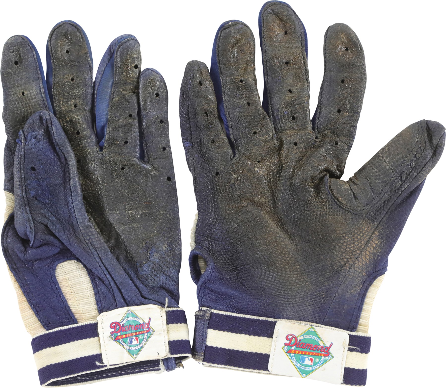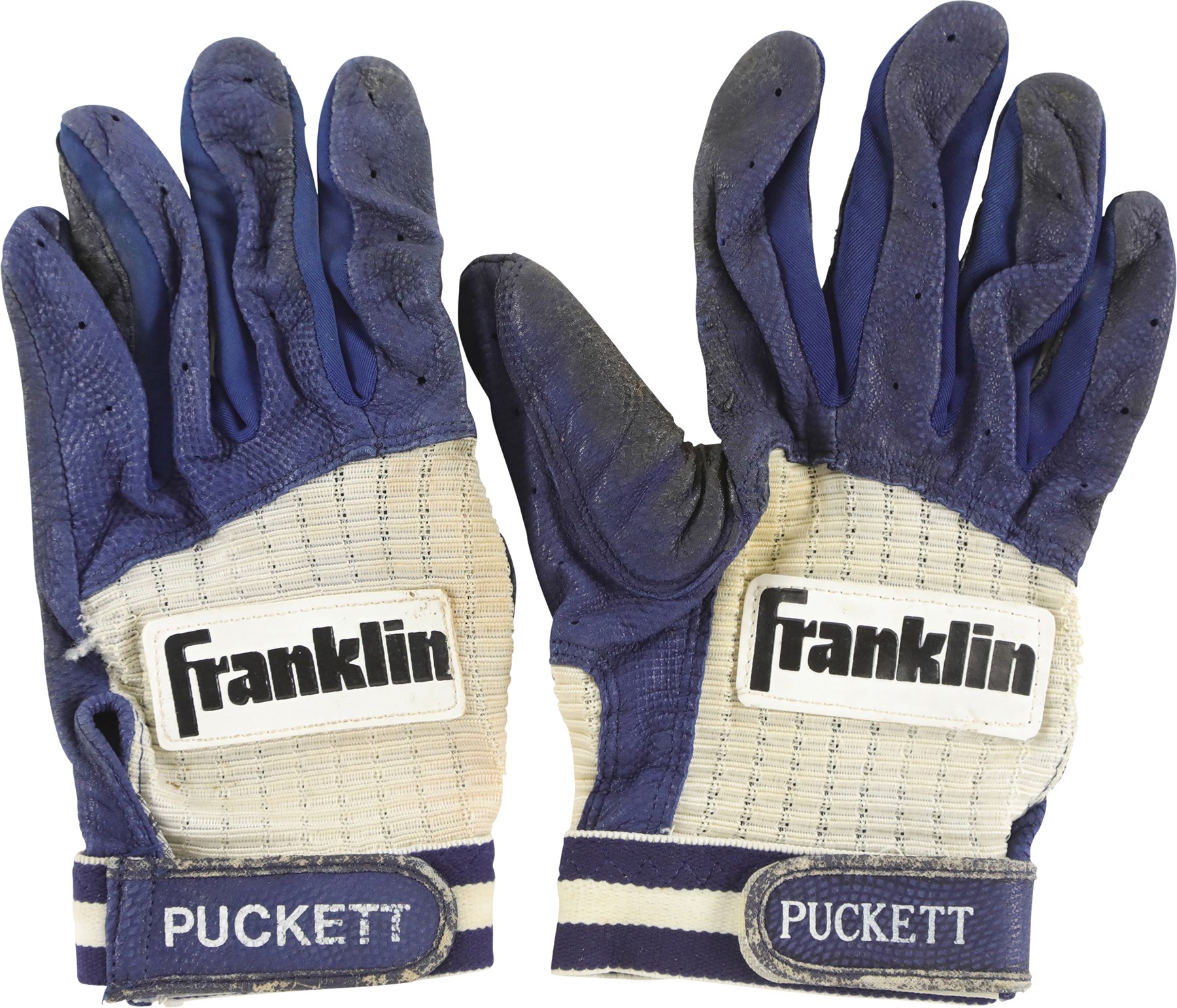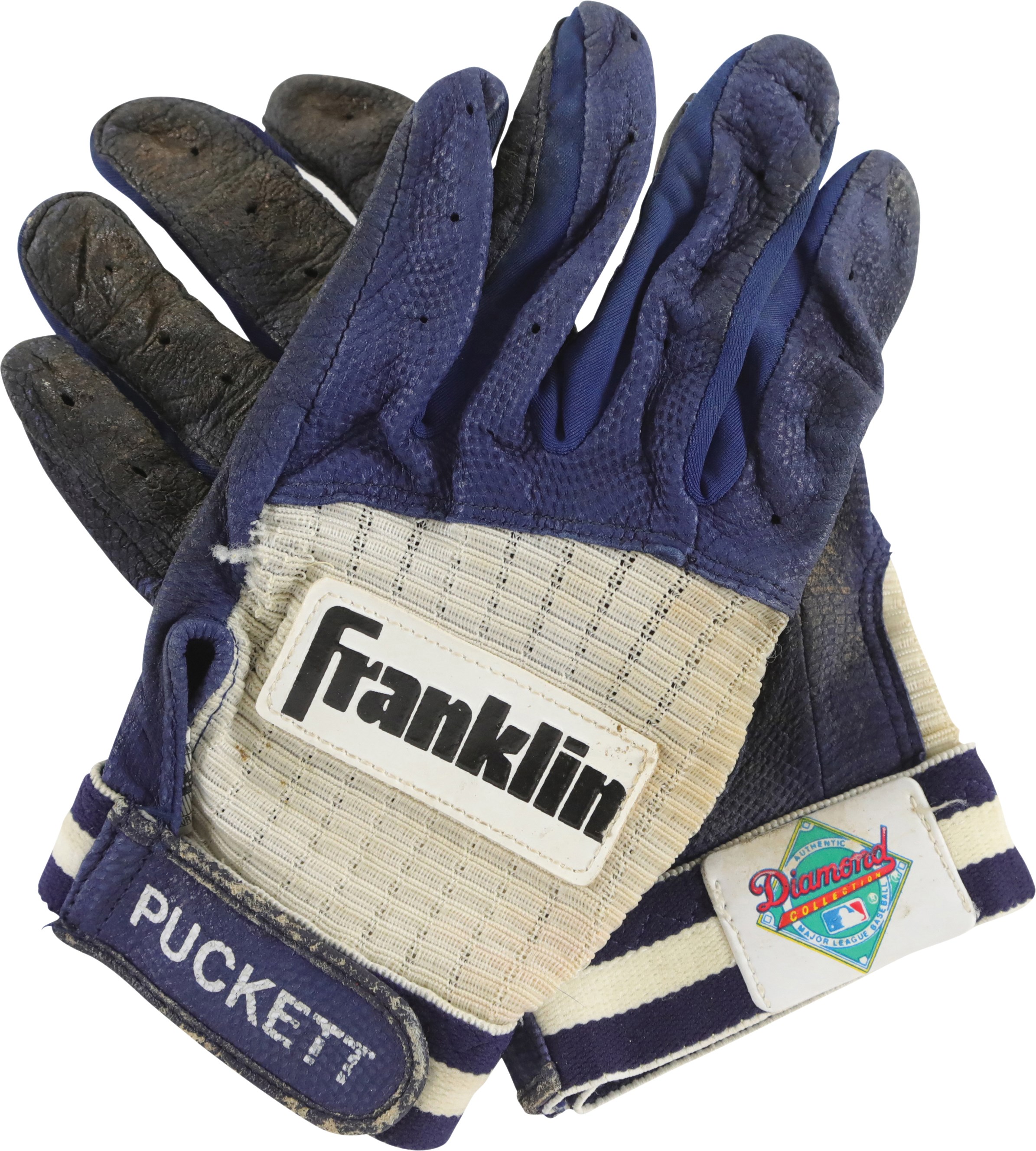 Kirby Puckett Minnesota Twins game used batting gloves. These blue and white Franklin gloves each have "PUCKETT" stamped on the wrist strap, and a Diamond Collection patch is sewn to each of the wrists. The gloves show outstanding signs of use and are covered in dirt and dried pine tar. Puckett was the face of the Twins from 1984 to 1995. He helped lead the Twins to World Series championships, in 1987 and 1991, and was inducted to the National Baseball Hall of Fame in 2001.