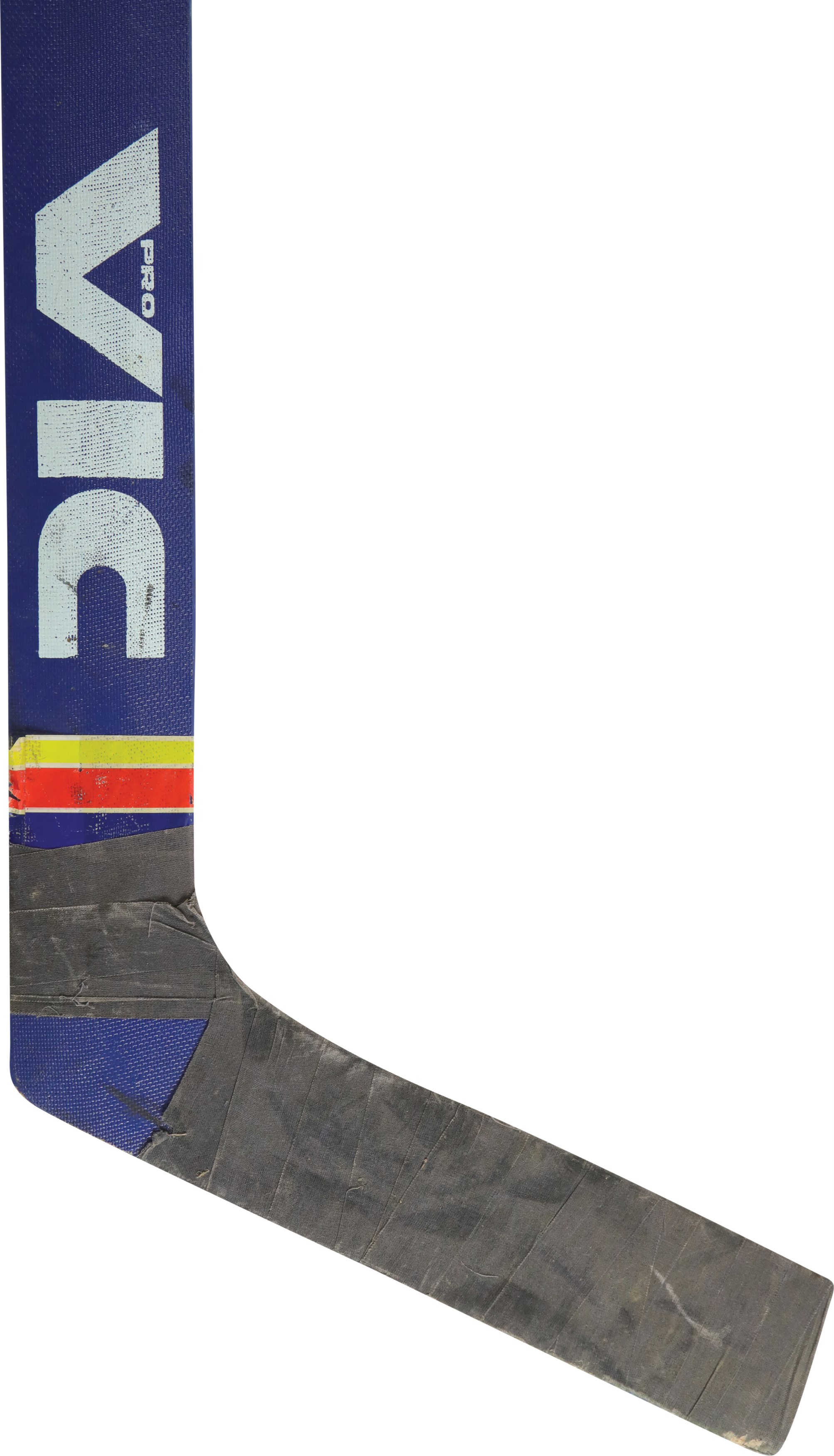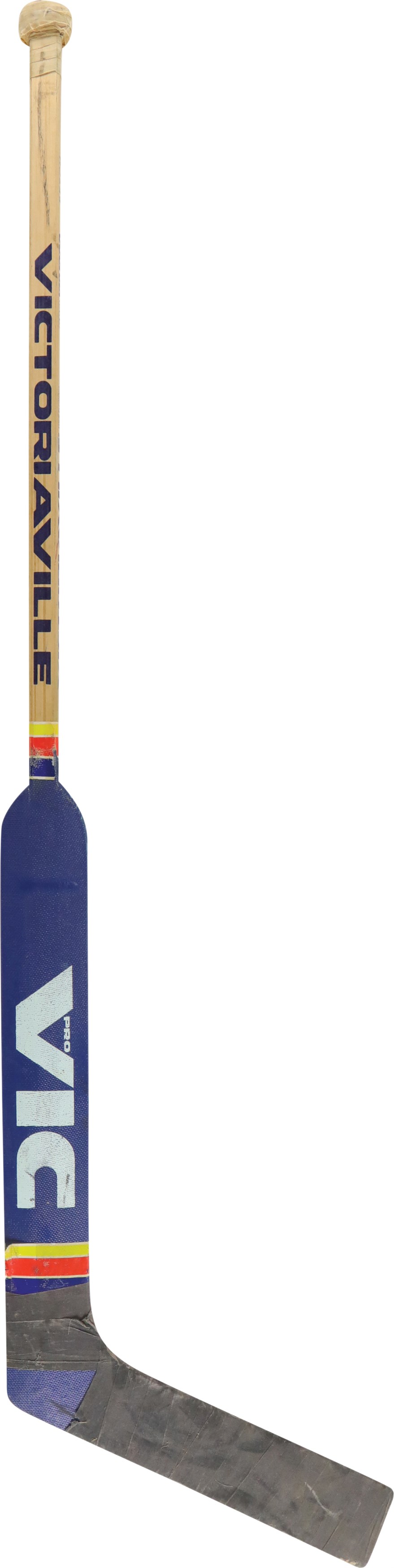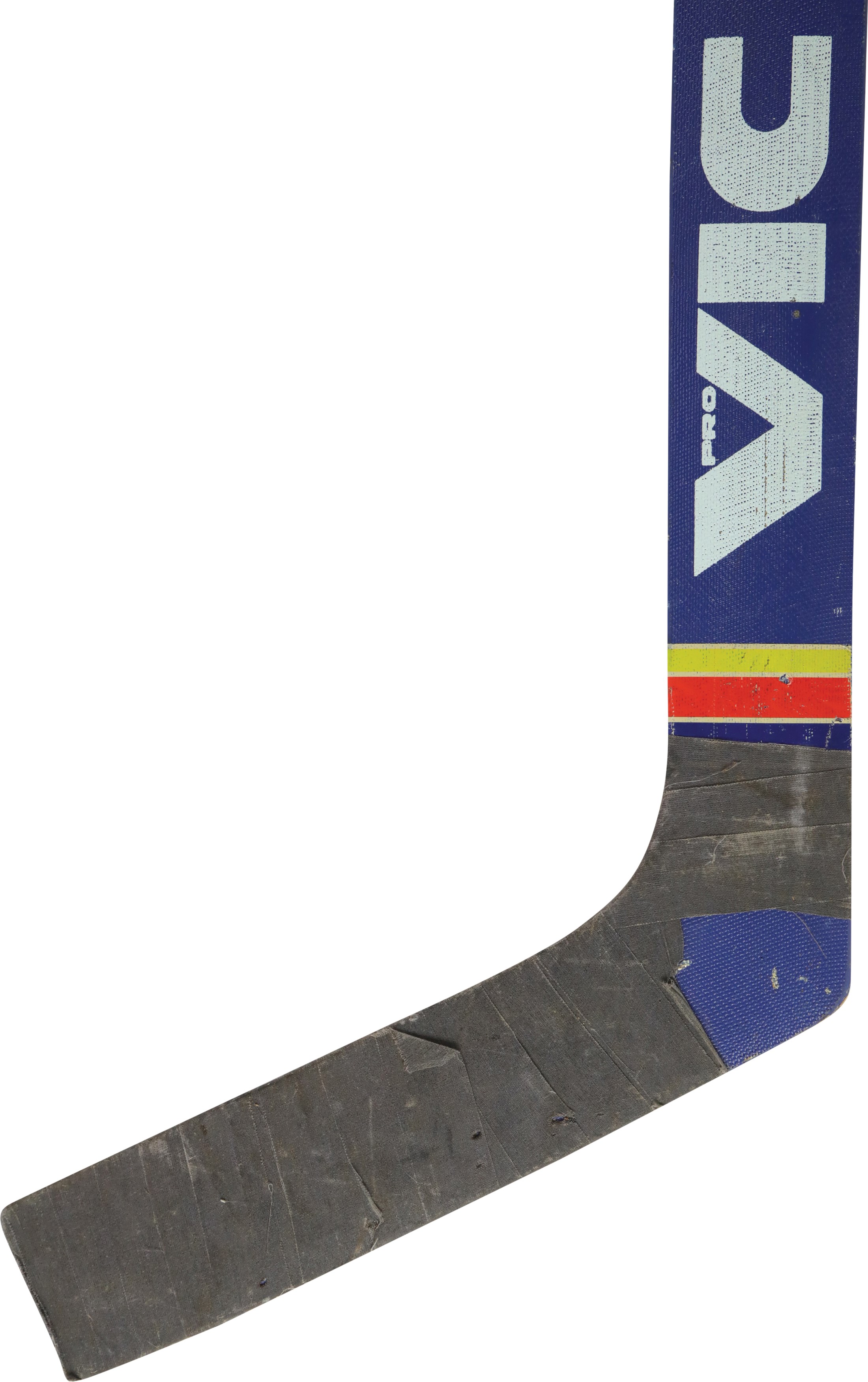 1980s Chico Resch game used hockey stick. Resch signed this Vic goalie stick on the shaft. He added a personalization with his signature. "RESCH" is stamped on the shaft of the stick in blue ink. Original tape is present on the blade and butt-cap, and the stick shows nice signs of use. Resch played in the NHL from 1973 to 1987. He won a Stanley Cup with the New York Islanders in 1979-80.