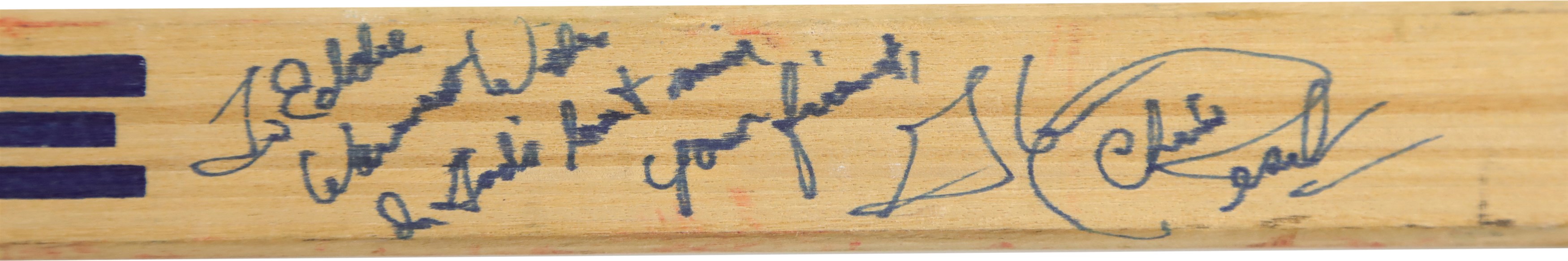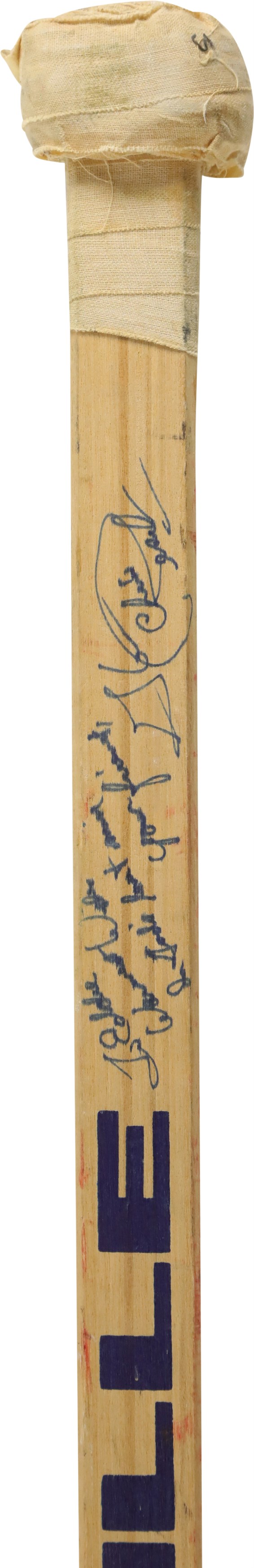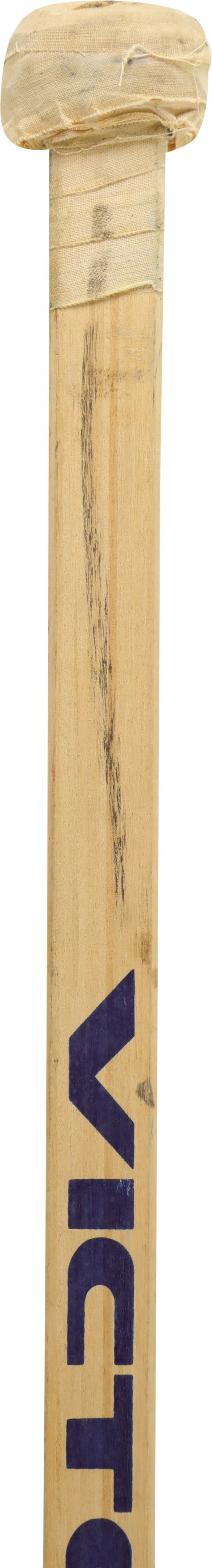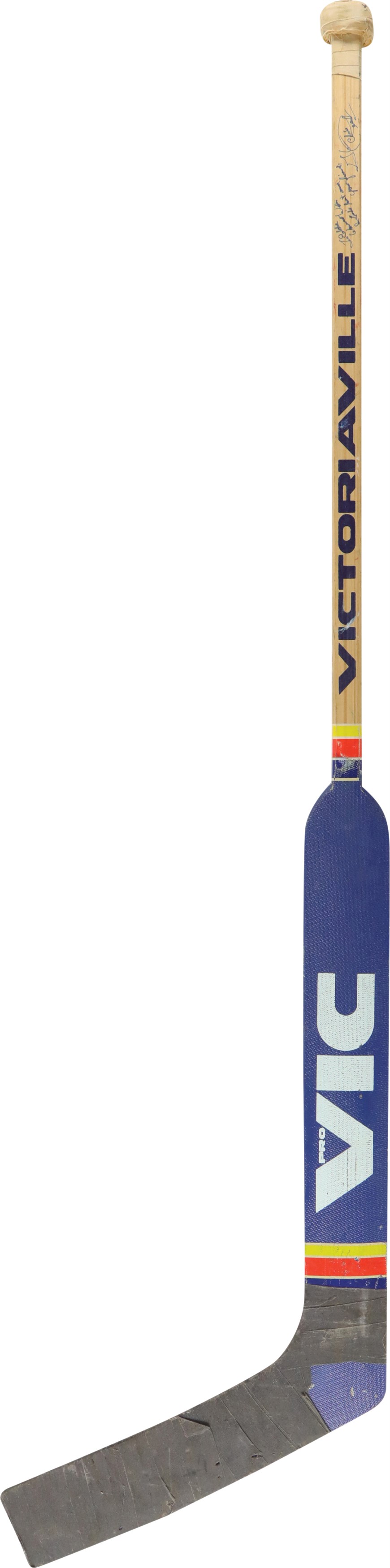 1980s Chico Resch game used hockey stick. Resch signed this Vic goalie stick on the shaft. He added a personalization with his signature. "RESCH" is stamped on the shaft of the stick in blue ink. Original tape is present on the blade and butt-cap, and the stick shows nice signs of use. Resch played in the NHL from 1973 to 1987. He won a Stanley Cup with the New York Islanders in 1979-80.