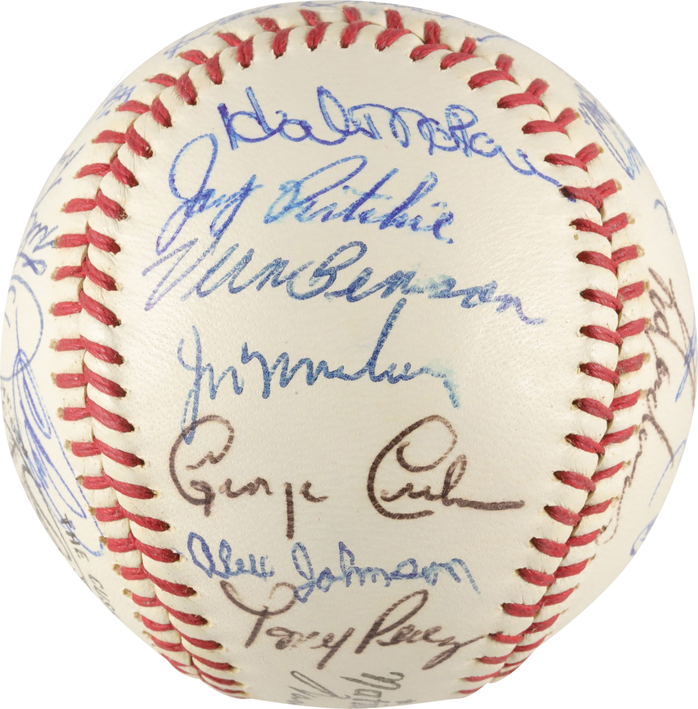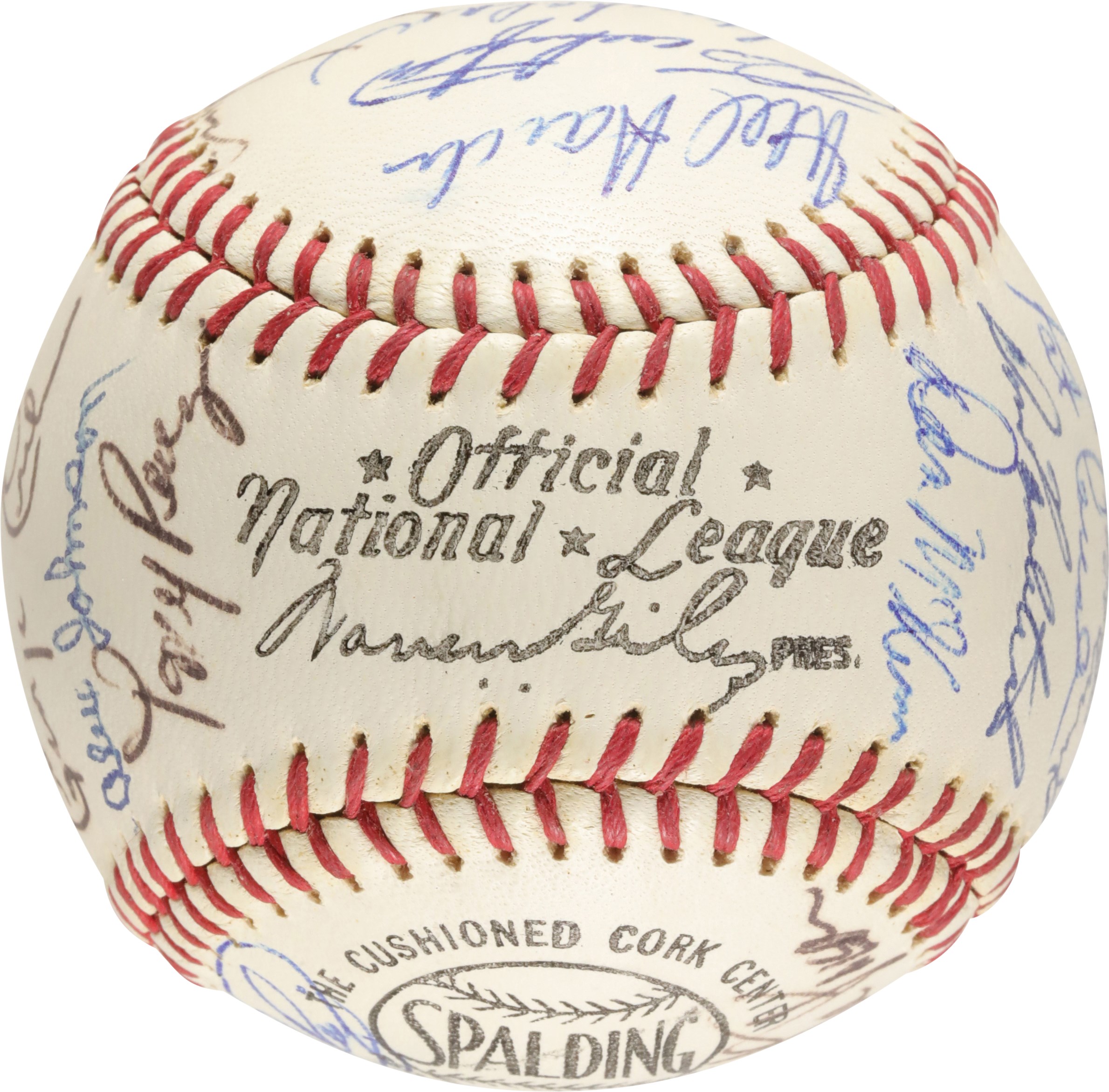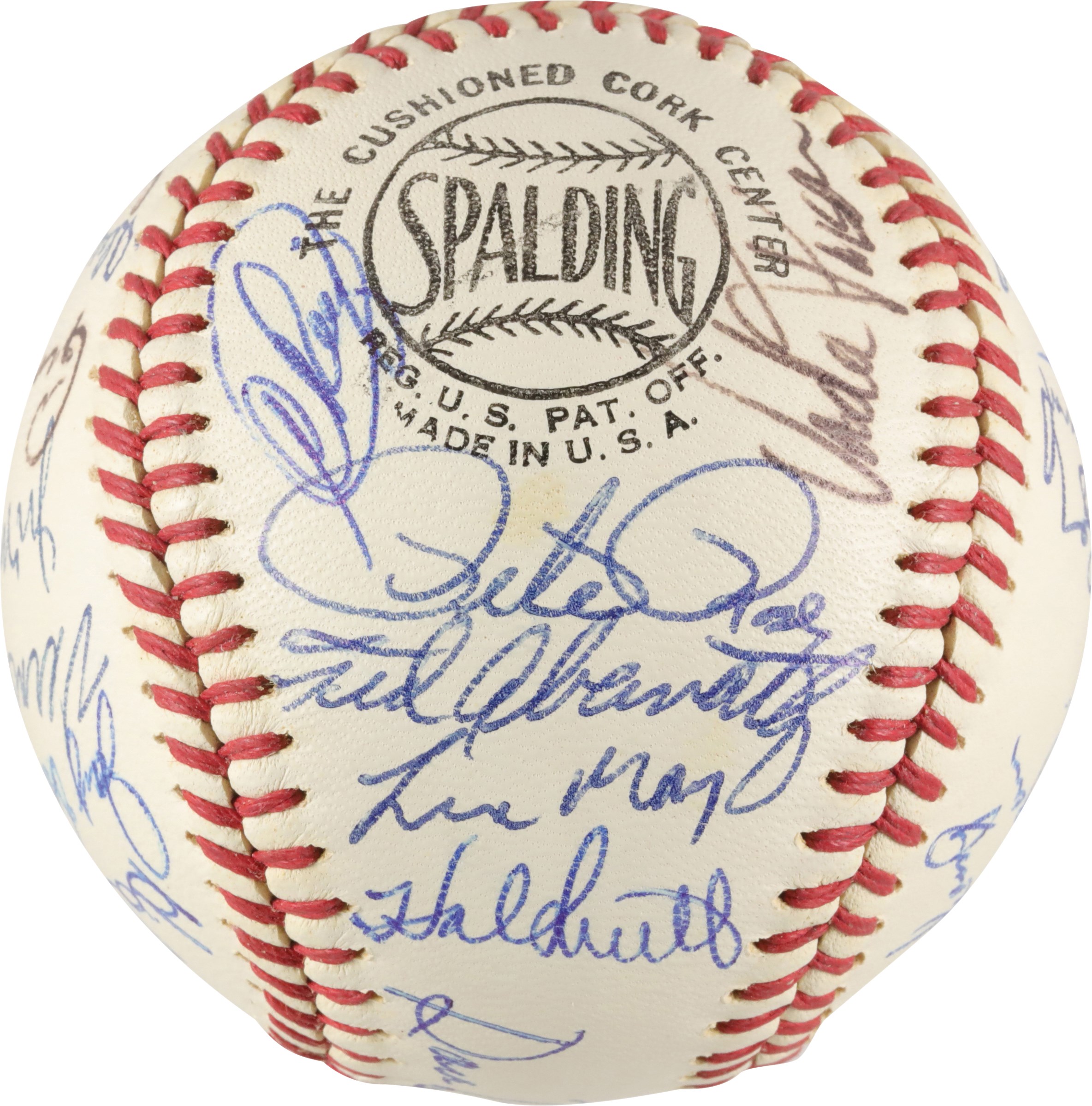 High Grade 1968 Cincinnati Reds team-signed baseball with Johnny Bench rookie signature. This near mint condition Official National League (Giles) ball has been signed by 30 members of the 1968 Reds team. Signatures include Pete Rose, Tony Perez, Vada Pinson, Dave Bristol, Tony Cloninger, Jim Beauchamp, Jimmy Bragan, Mel Queen, Woody Woodward, Pat Corrales, Don Pavletich, Dan McGinn, Hal McRae, Jay Ritchie, Vern Benson, Jim Maloney, George Culver, Alex Johnson, Chico Ruiz, Ted Abernathy, Hal Smith, Mel Harder, Fred Whitfield, Gary Nolan, Dan McGinn, Clay Carroll, Leo Cardenas, Bob Lee, Lee May, and Gerry Arrigo. The signatures rate 8/10 overall. Includes a full LOA from PSA.