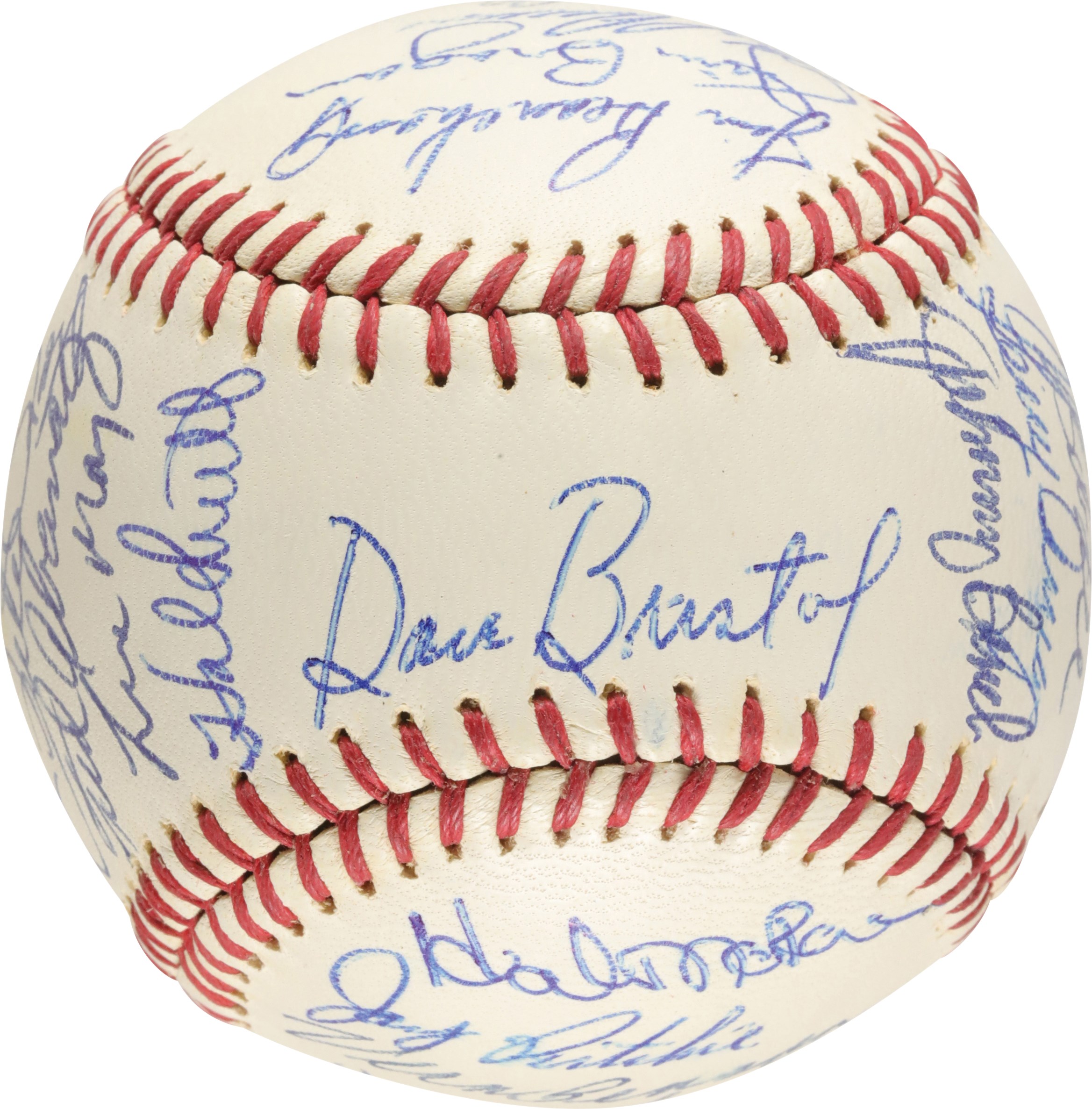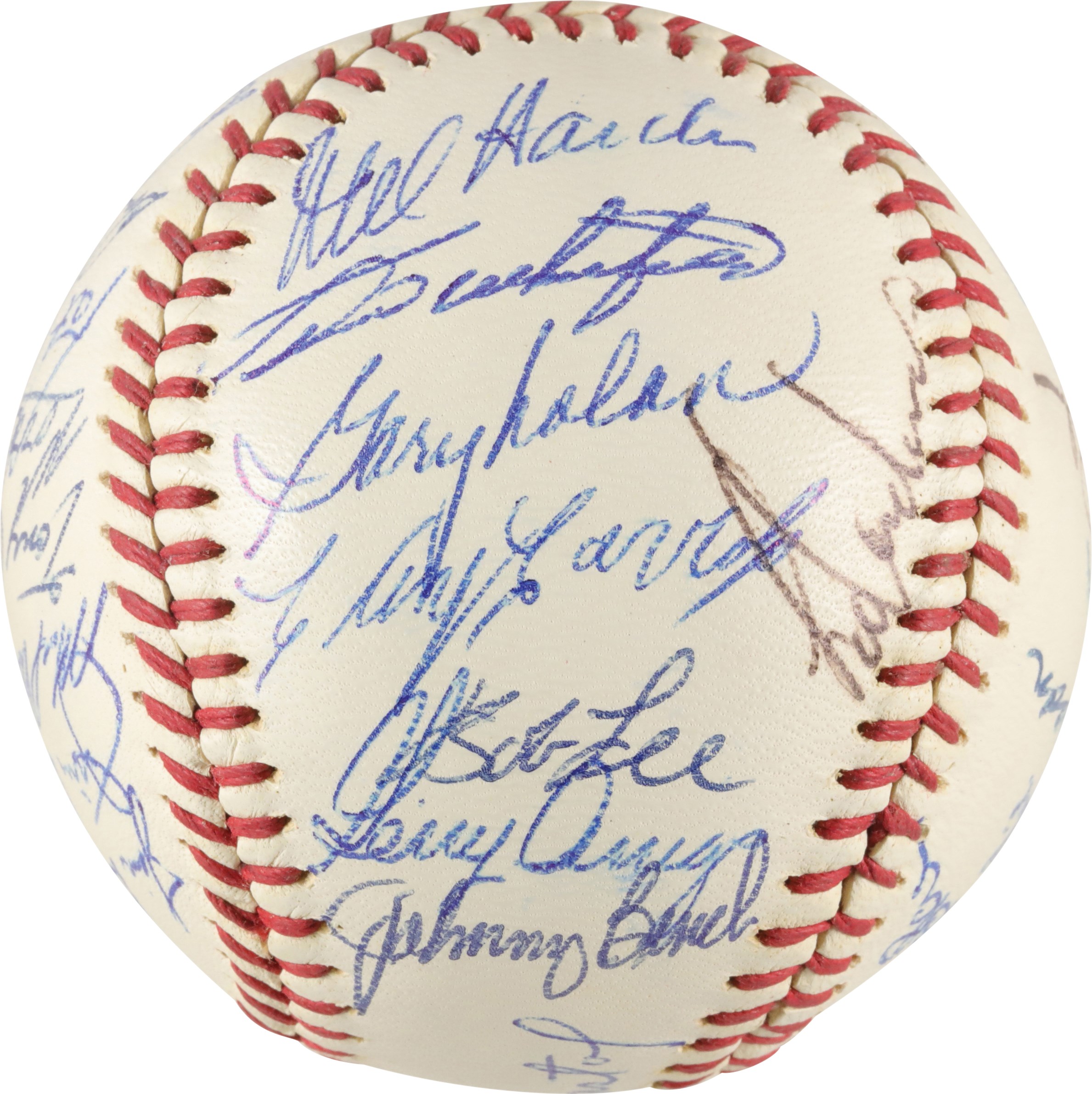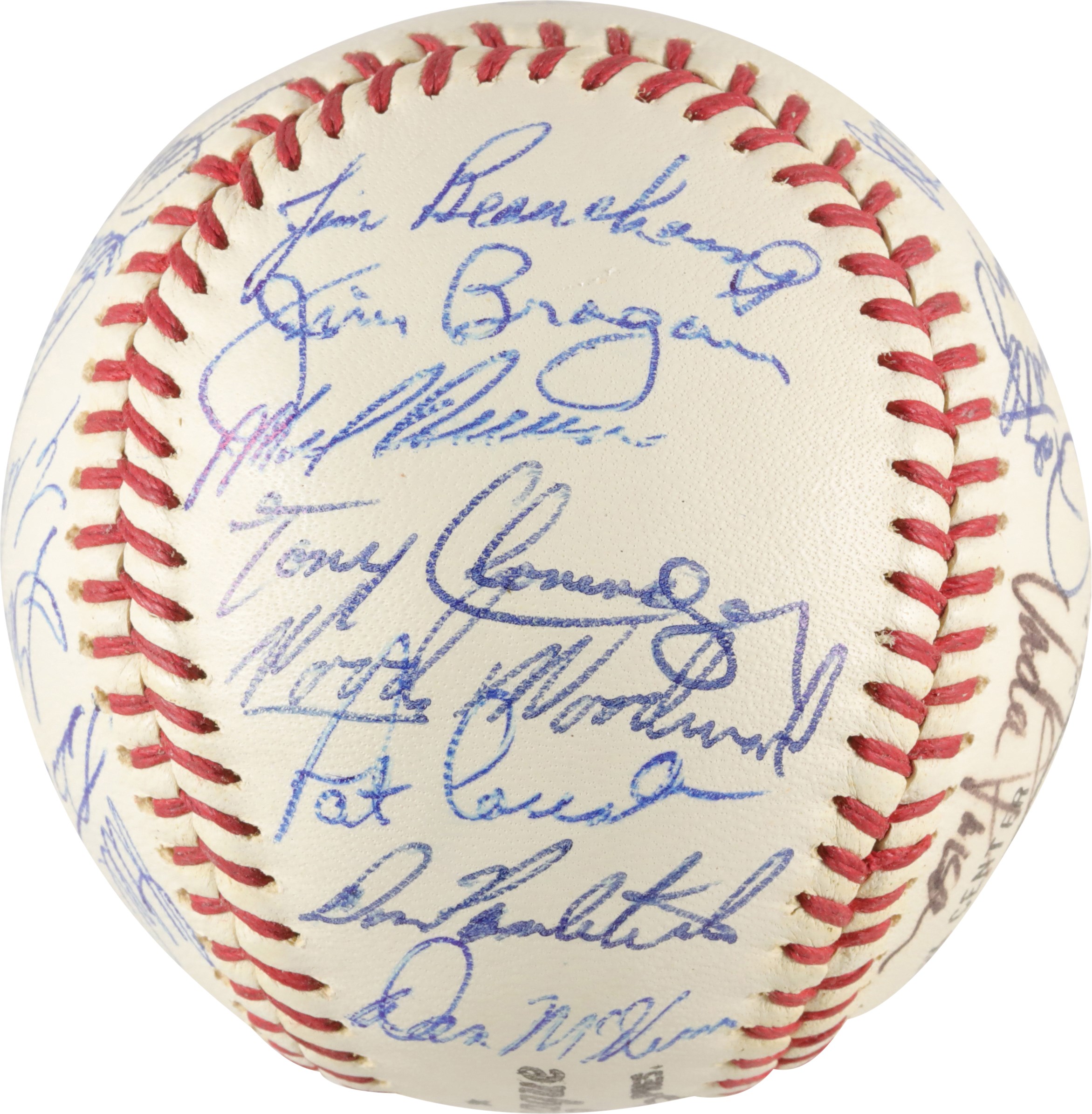 High Grade 1968 Cincinnati Reds team-signed baseball with Johnny Bench rookie signature. This near mint condition Official National League (Giles) ball has been signed by 30 members of the 1968 Reds team. Signatures include Pete Rose, Tony Perez, Vada Pinson, Dave Bristol, Tony Cloninger, Jim Beauchamp, Jimmy Bragan, Mel Queen, Woody Woodward, Pat Corrales, Don Pavletich, Dan McGinn, Hal McRae, Jay Ritchie, Vern Benson, Jim Maloney, George Culver, Alex Johnson, Chico Ruiz, Ted Abernathy, Hal Smith, Mel Harder, Fred Whitfield, Gary Nolan, Dan McGinn, Clay Carroll, Leo Cardenas, Bob Lee, Lee May, and Gerry Arrigo. The signatures rate 8/10 overall. Includes a full LOA from PSA.