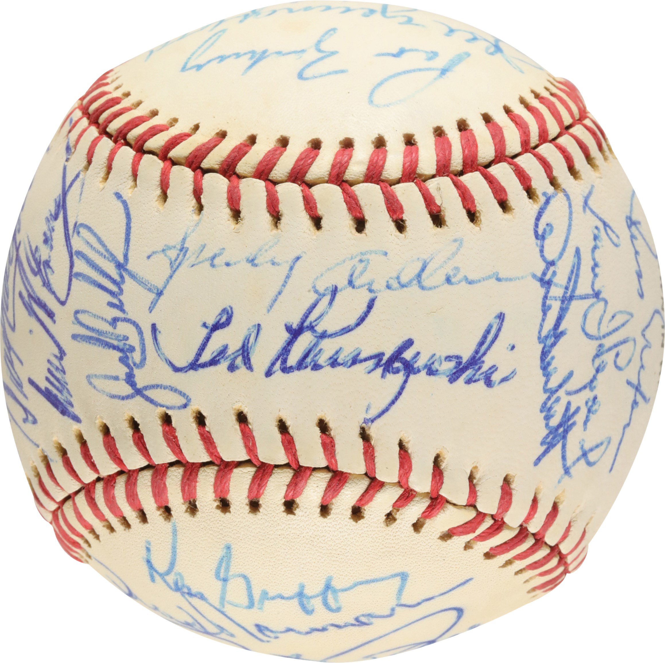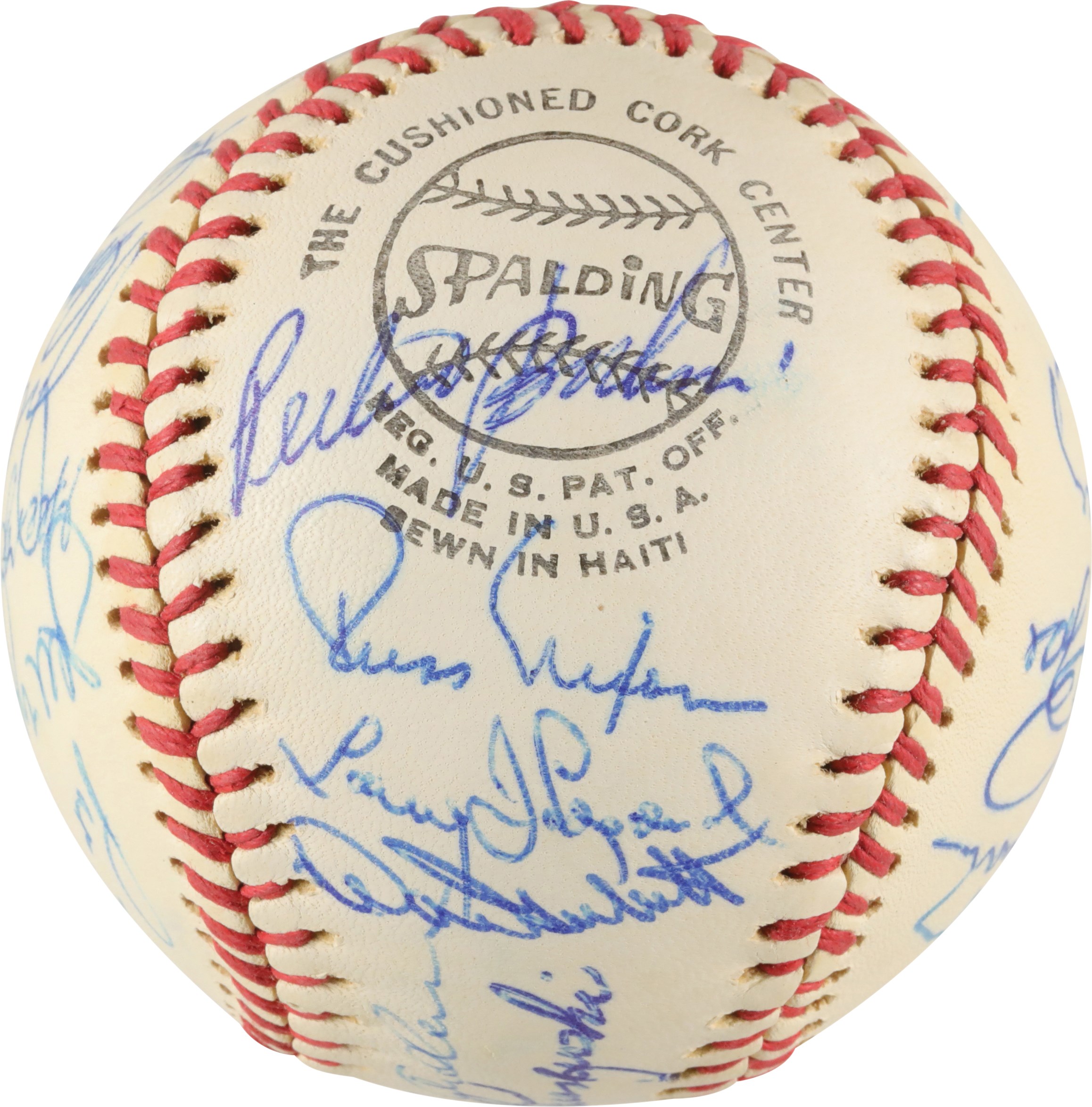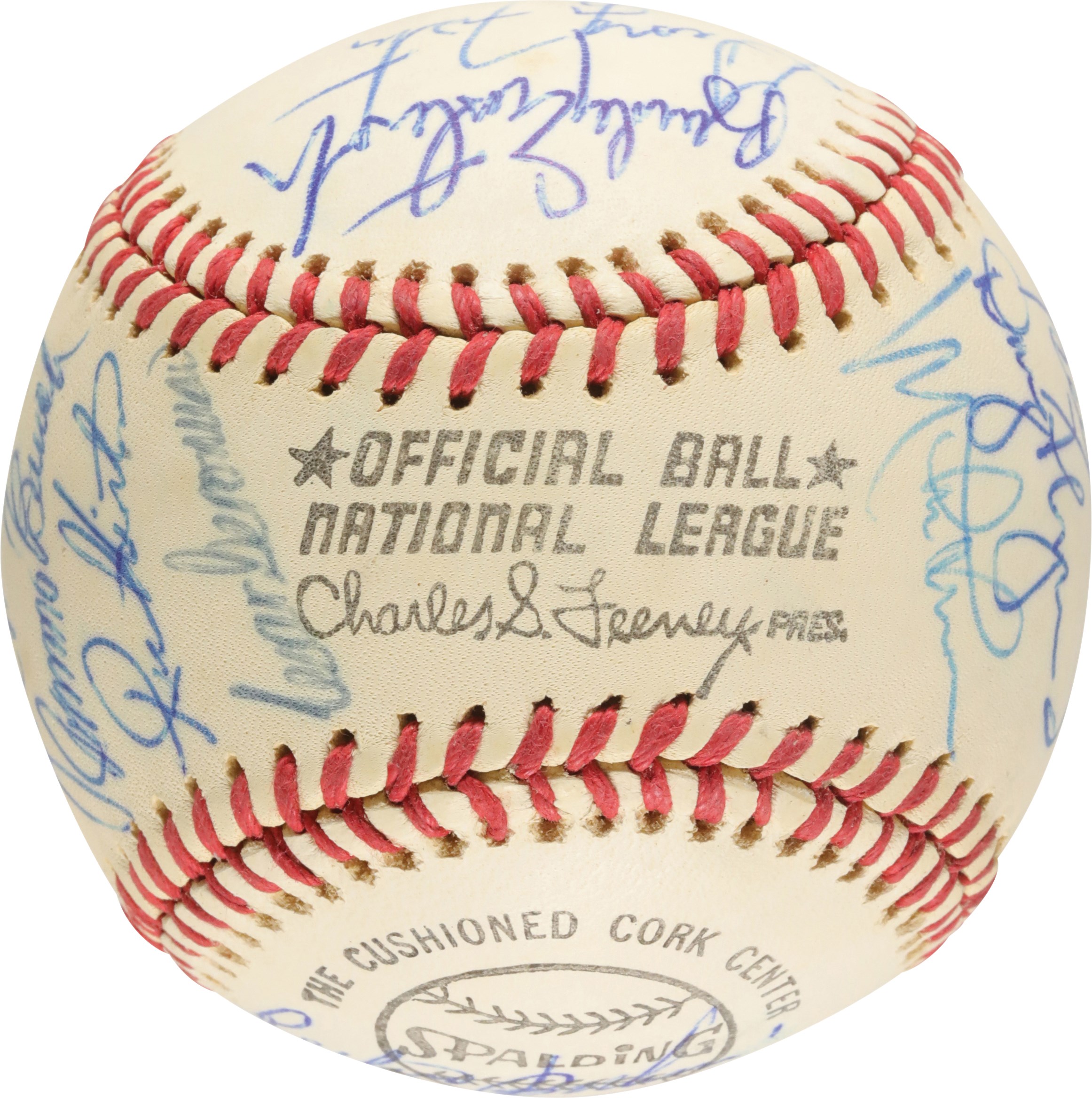1976 World Series champion Cincinnati Reds team-signed baseball. This Official National League (Feeney) ball has been signed by 26 members of the World Series champion Reds team. Signatures include, Pete Rose, Johnny Bench, Joe Morgan, George Foster, Dave Concepcion, Cesar Geronimo, Tony Perez, Sparky Anderson, Ted Kluszewski, Ken Griffey Sr., Fred Norman, Doug Flynn, Mike Lum, Pat Zachry, Joel Youngblood, George Scherger, Rich Hinton, Pedro Borbon, Russ Nixon, Larry Shepard, Don Gullett, Rawly Eastwick, Bill Plummer, Ed Armbrister, Will McEnaney, and Jack Billingham. The ball is in excellent-mint condition and the signatures rate 8/10 overall. Includes a full LOA from PSA.