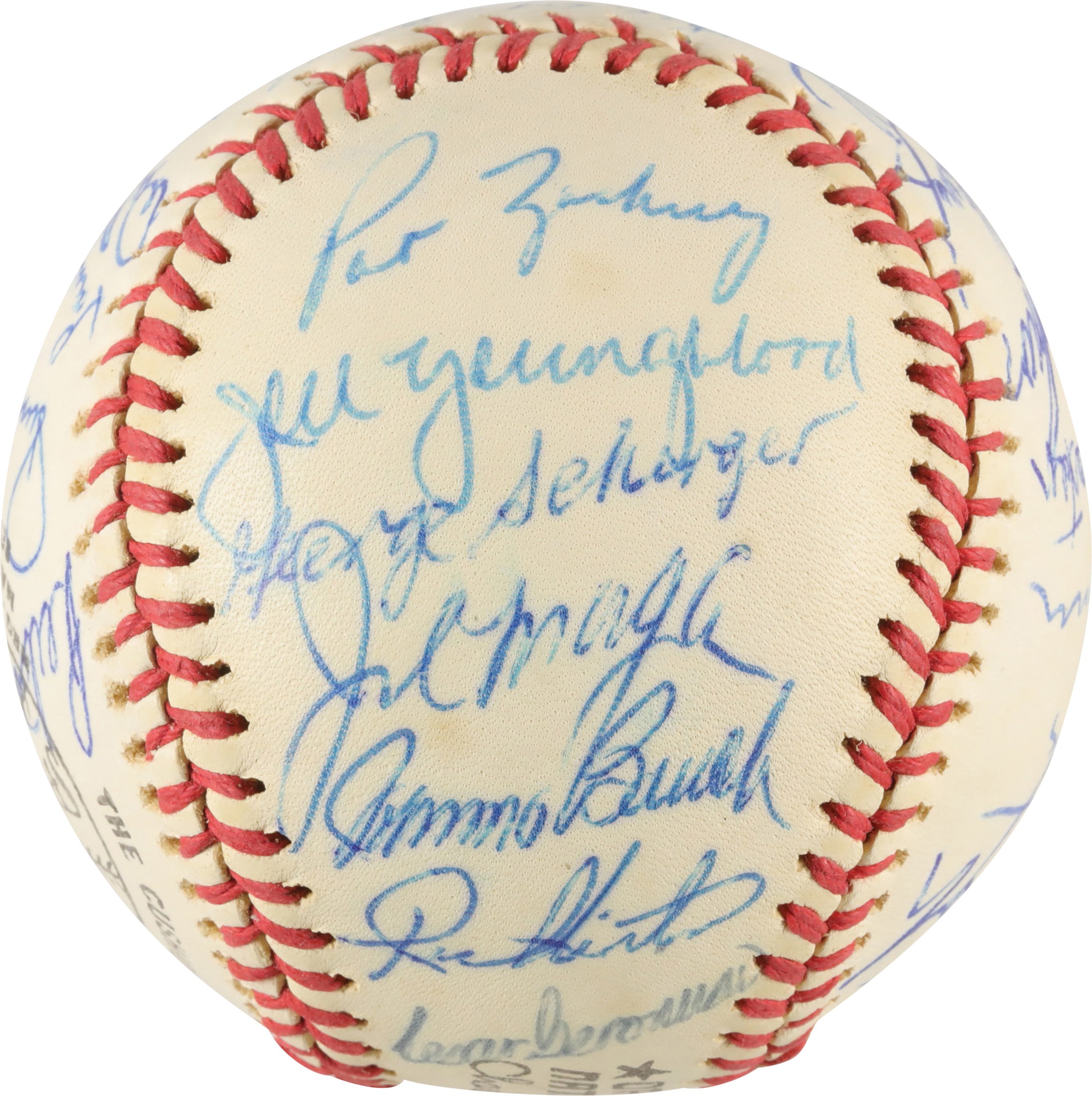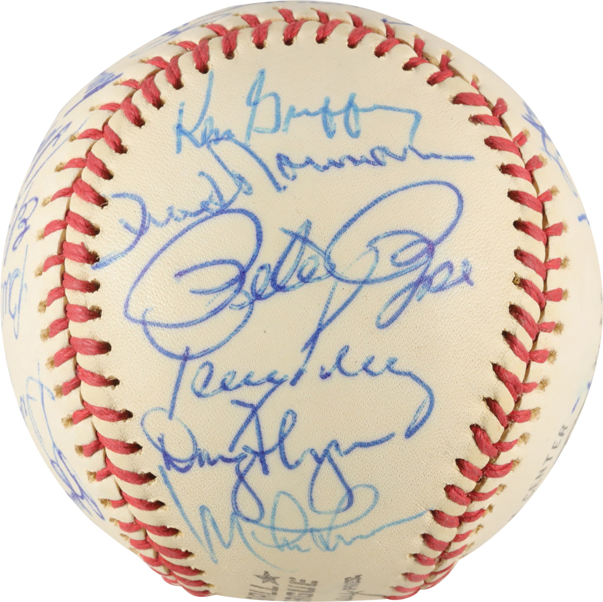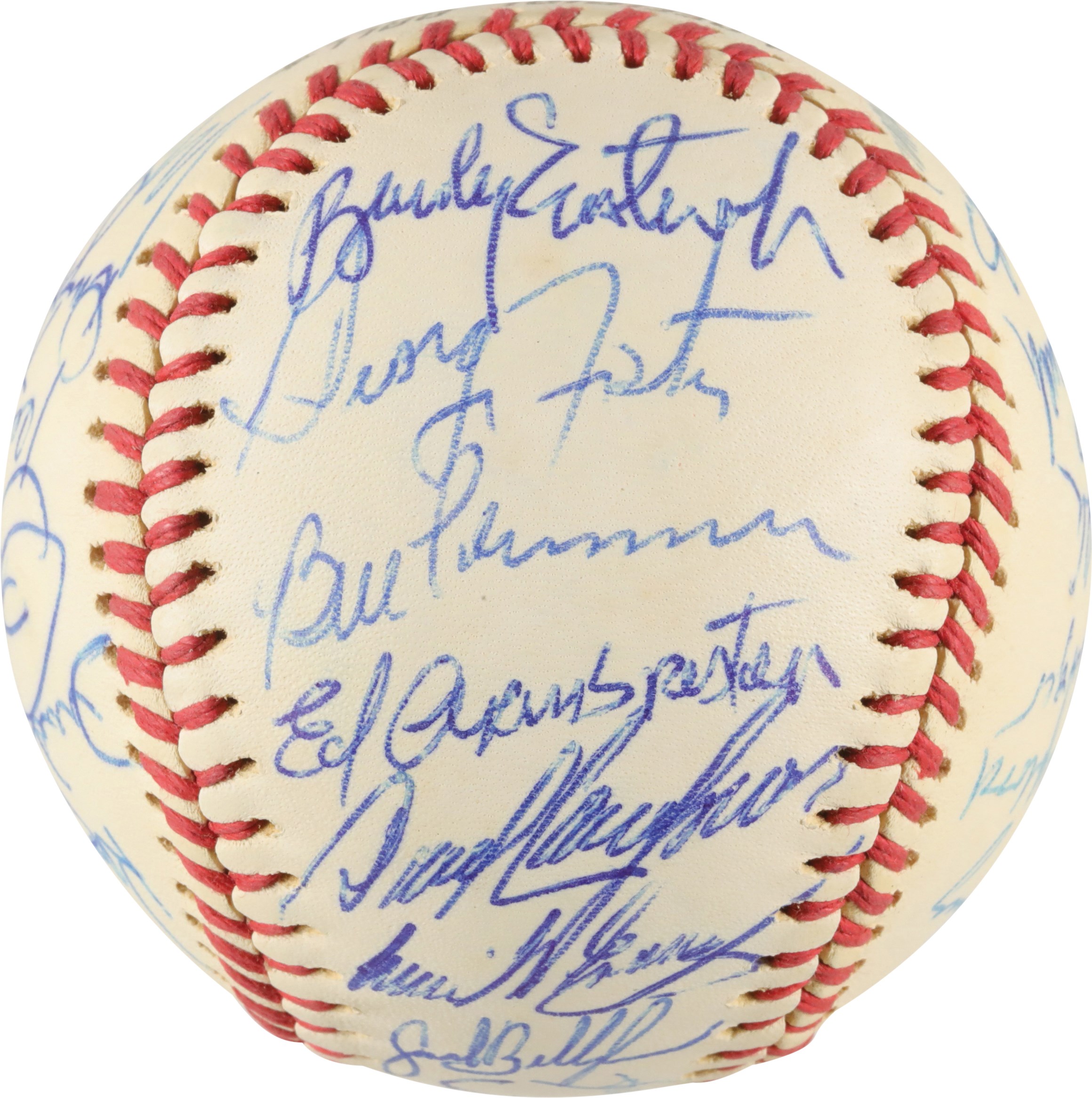 1976 World Series champion Cincinnati Reds team-signed baseball. This Official National League (Feeney) ball has been signed by 26 members of the World Series champion Reds team. Signatures include, Pete Rose, Johnny Bench, Joe Morgan, George Foster, Dave Concepcion, Cesar Geronimo, Tony Perez, Sparky Anderson, Ted Kluszewski, Ken Griffey Sr., Fred Norman, Doug Flynn, Mike Lum, Pat Zachry, Joel Youngblood, George Scherger, Rich Hinton, Pedro Borbon, Russ Nixon, Larry Shepard, Don Gullett, Rawly Eastwick, Bill Plummer, Ed Armbrister, Will McEnaney, and Jack Billingham. The ball is in excellent-mint condition and the signatures rate 8/10 overall. Includes a full LOA from PSA.