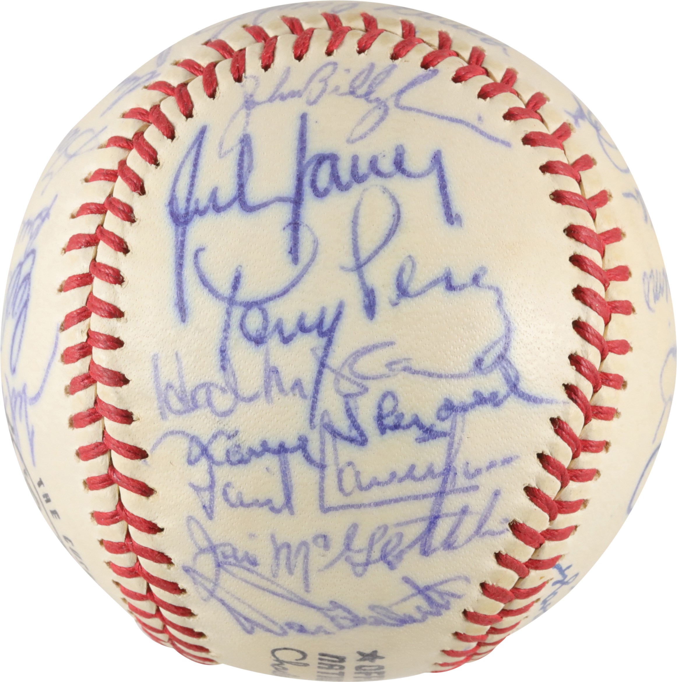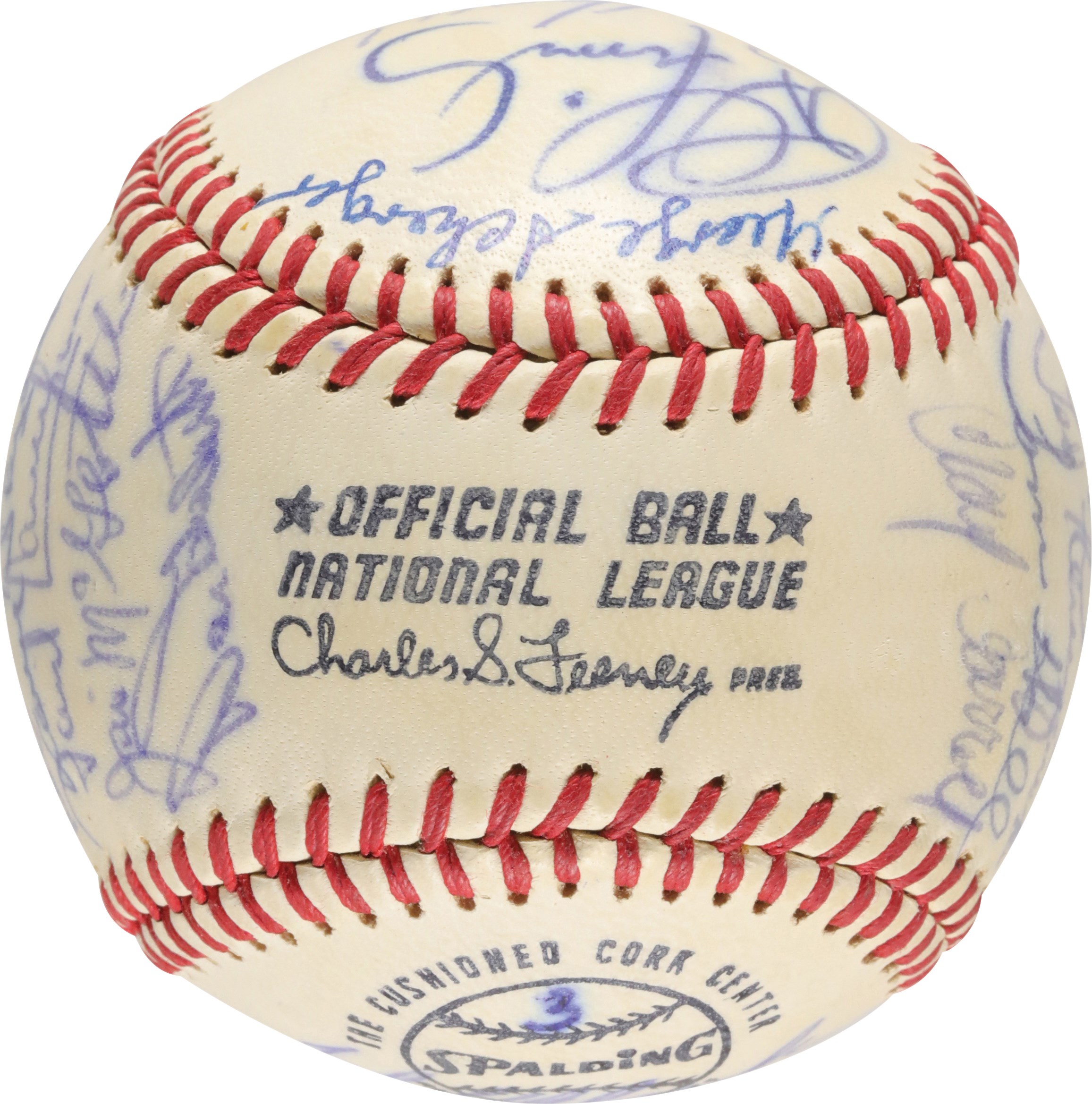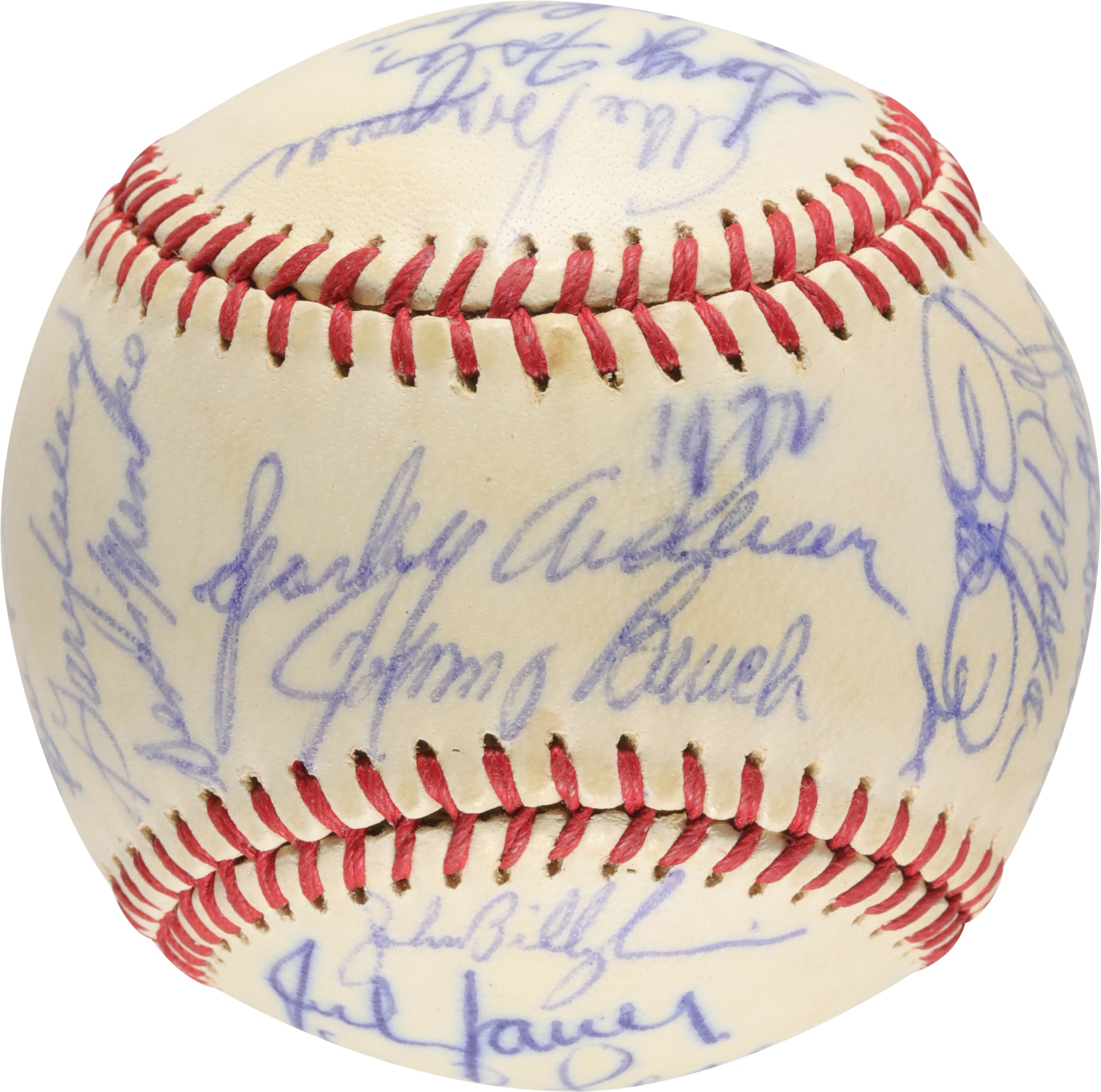 High grade 1972 National League Champion Cincinnati Reds team-signed baseball. This Official National League (Feeney) ball has been signed by 30 members of the NL champion Reds team. Signatures include, Pete Rose, Johnny Bench, Sparky Anderson, Joe Morgan, Cesar Geronimo, Tony Perez, Dave Concepcion, George Foster, Ted Kluszewski, George Scherger, Ross Grimsley, Joe Hague, Wayne Simpson, Ted Uhlaender, Ed Sprague, Bill Plummer, Gary Nolan, Denis Menke, Alex Grammas, Pedro Borbon, Darrel Chaney, Larry Shepard, Bobby Tolan, Tom Hall, Clay Carroll, Jack Billingham, Julian Javier, Hal McRae, Jim McGlothlin, and Don Gullett. The ball is in excellent-mint condition and the signatures rate 8/10 overall. "1972" and "3" are written on the ball in an unknown hand. Includes a full LOA from PSA.