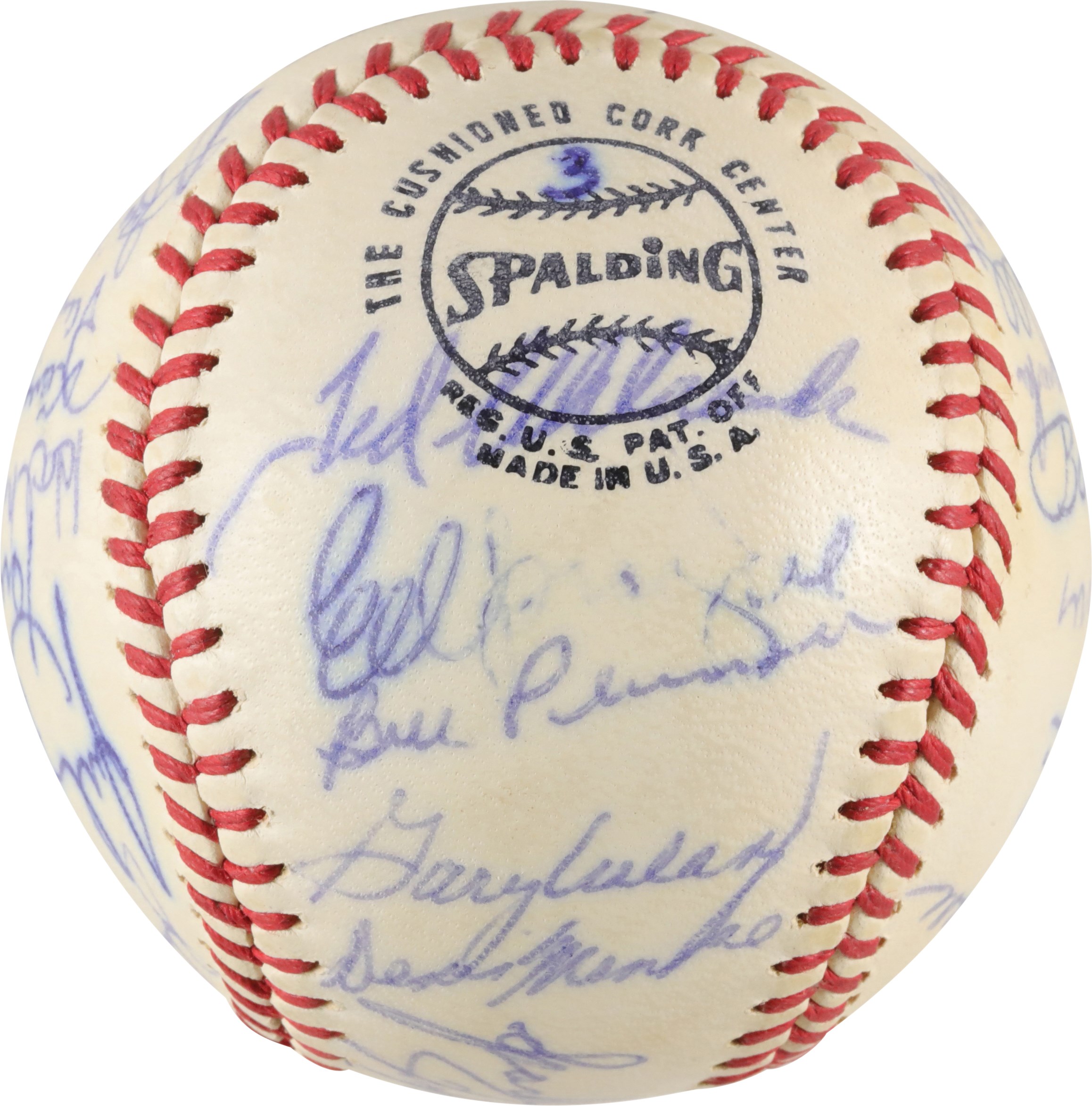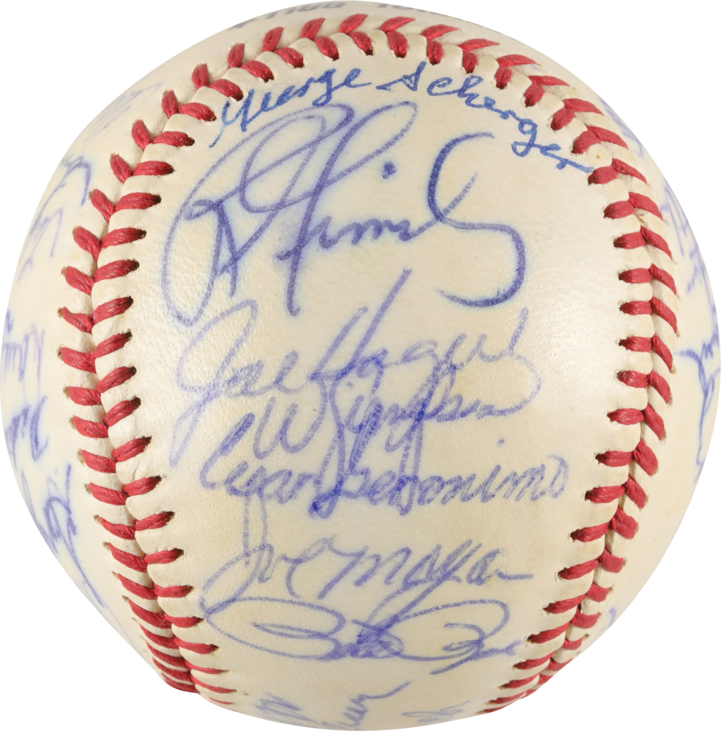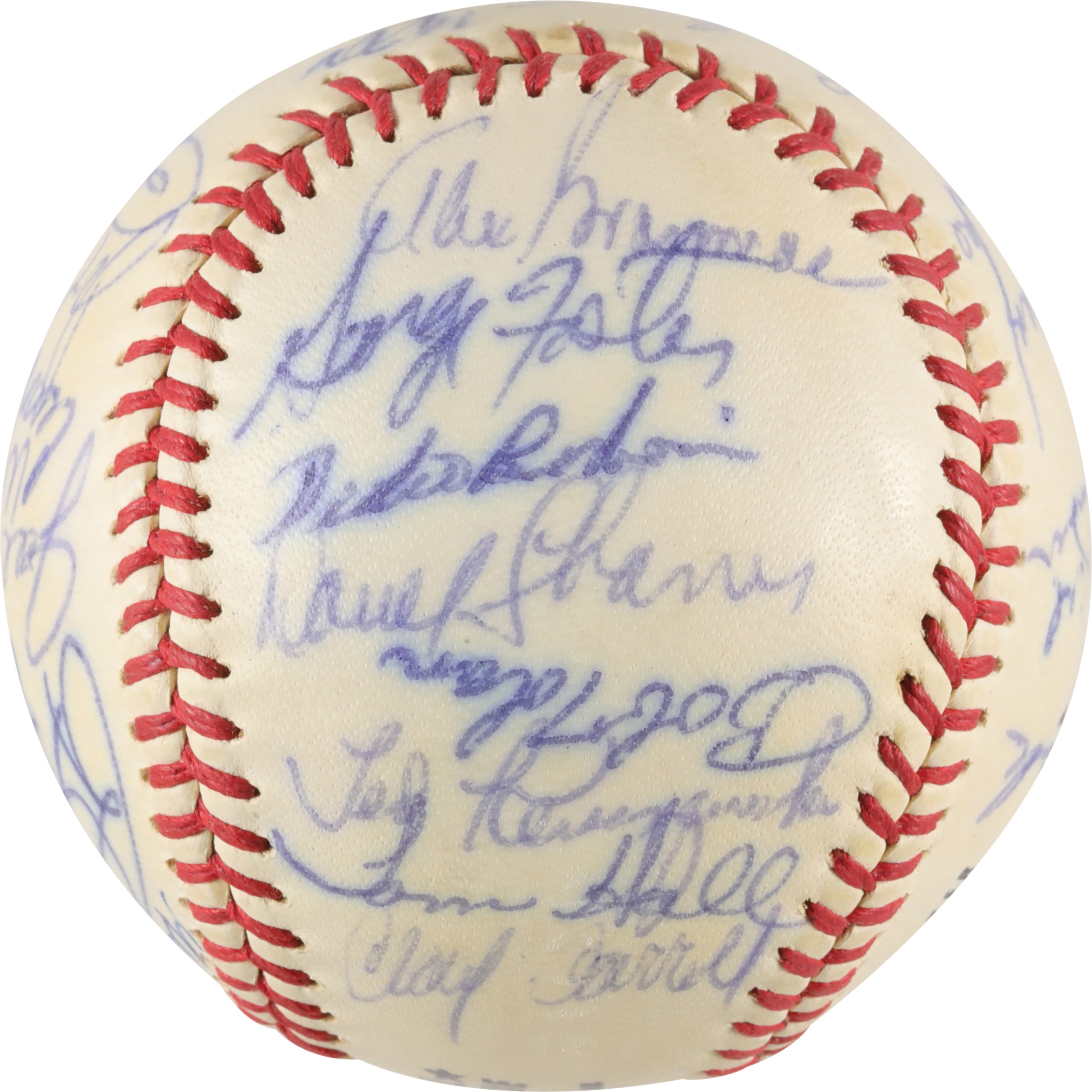 High grade 1972 National League Champion Cincinnati Reds team-signed baseball. This Official National League (Feeney) ball has been signed by 30 members of the NL champion Reds team. Signatures include, Pete Rose, Johnny Bench, Sparky Anderson, Joe Morgan, Cesar Geronimo, Tony Perez, Dave Concepcion, George Foster, Ted Kluszewski, George Scherger, Ross Grimsley, Joe Hague, Wayne Simpson, Ted Uhlaender, Ed Sprague, Bill Plummer, Gary Nolan, Denis Menke, Alex Grammas, Pedro Borbon, Darrel Chaney, Larry Shepard, Bobby Tolan, Tom Hall, Clay Carroll, Jack Billingham, Julian Javier, Hal McRae, Jim McGlothlin, and Don Gullett. The ball is in excellent-mint condition and the signatures rate 8/10 overall. "1972" and "3" are written on the ball in an unknown hand. Includes a full LOA from PSA.