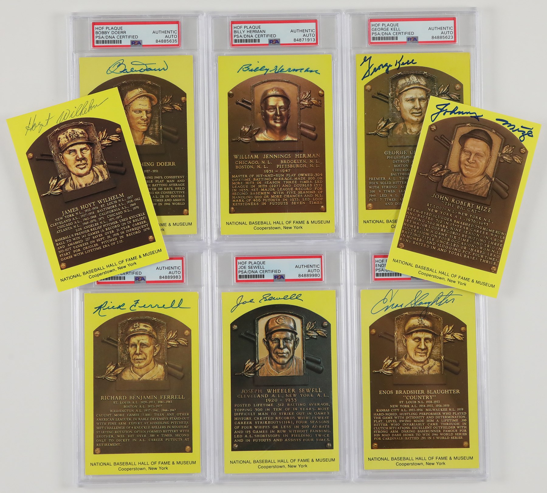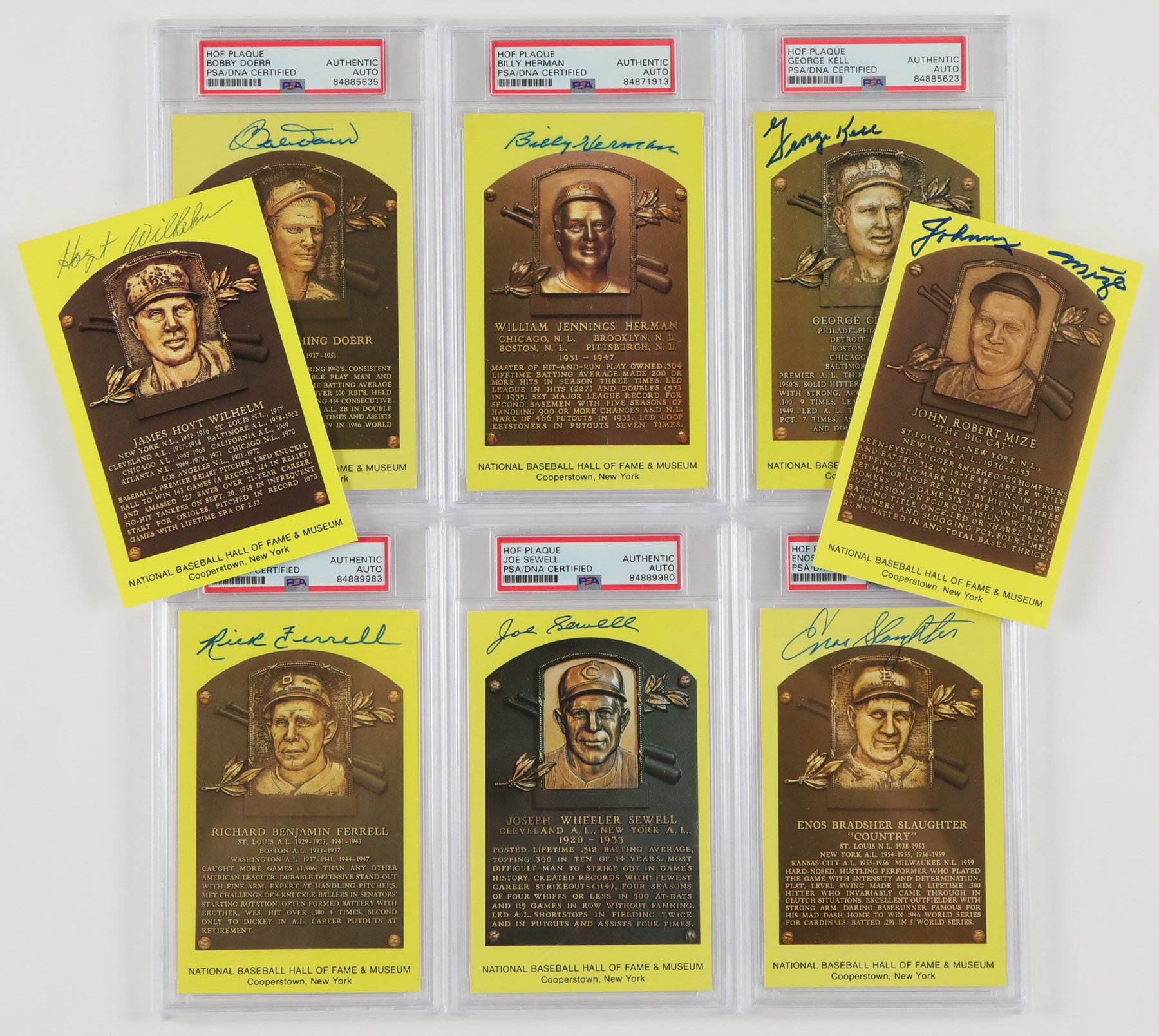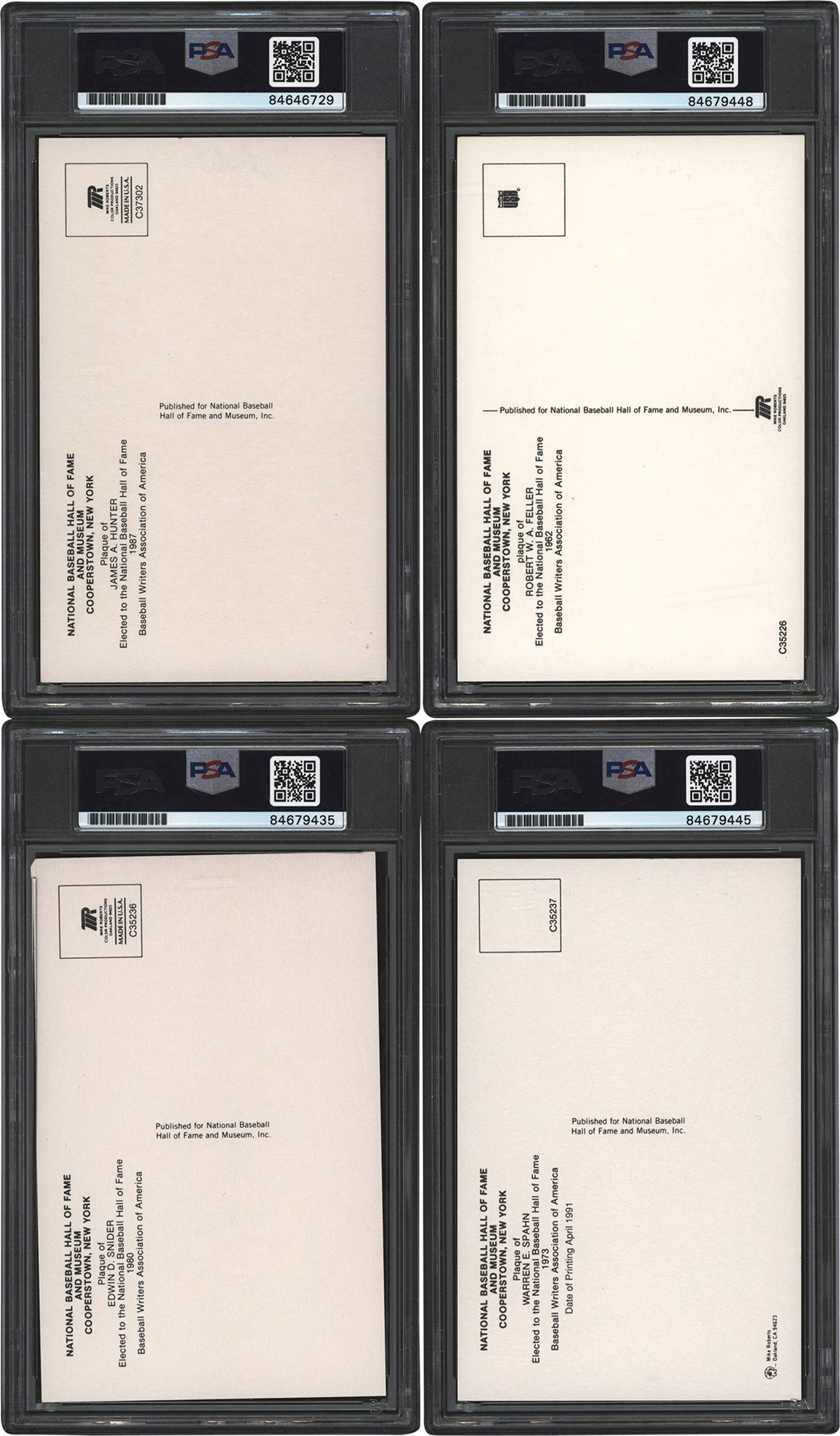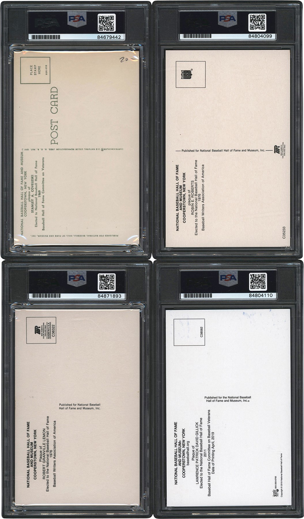 Yellow Hall of Fame autographed postcard collection of (20). All of the autographs have been authenticated and encapsulated by PSA unless noted. The collection includes: Al Barlick; Lou Boudreau; Stan Coveleski; Bobby Doerr; Bob Feller; Rick Ferrell; Charlie Gehringer; Pat Gillick; Billy Herman; Jim Hunter; George Kell; Bob Lemon; Buck Leonard; Johnny Mize-JSA-Not Encapsulated; Robin Roberts; Joe Sewell; Enos Slaughter; Duke Snider; Warren Spahn; Hoyt Wilhelm-JSA-Not Encapsulated.