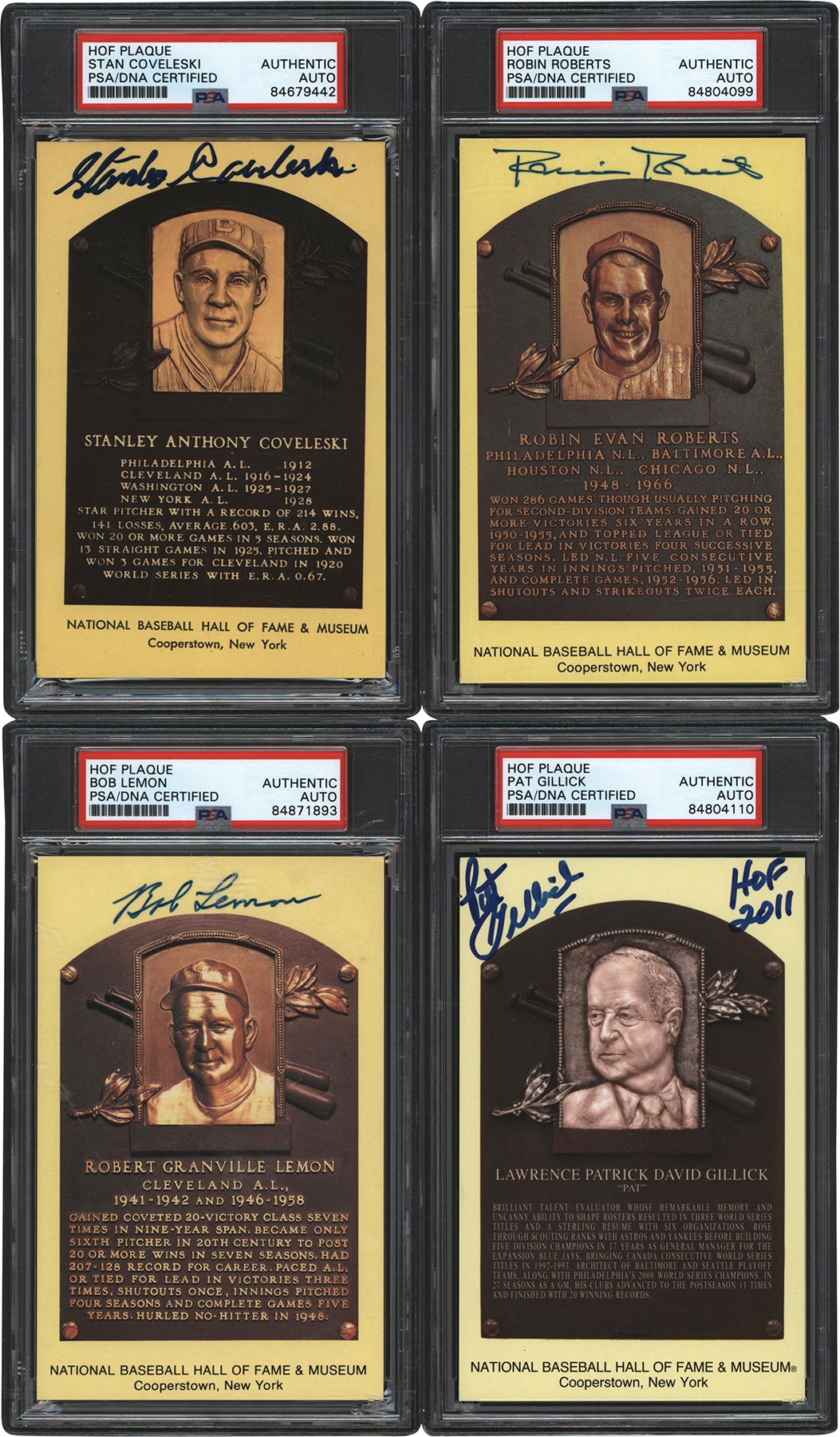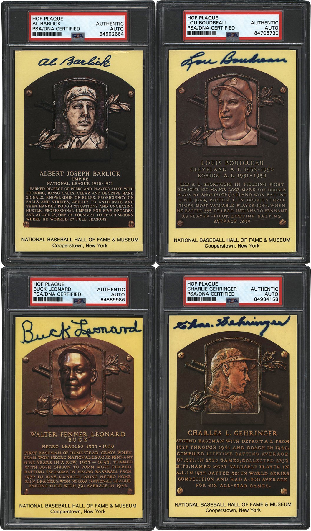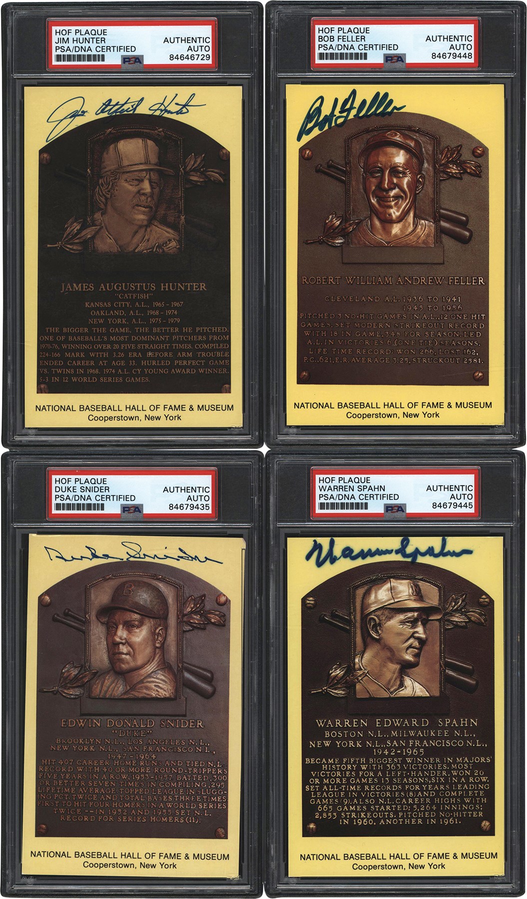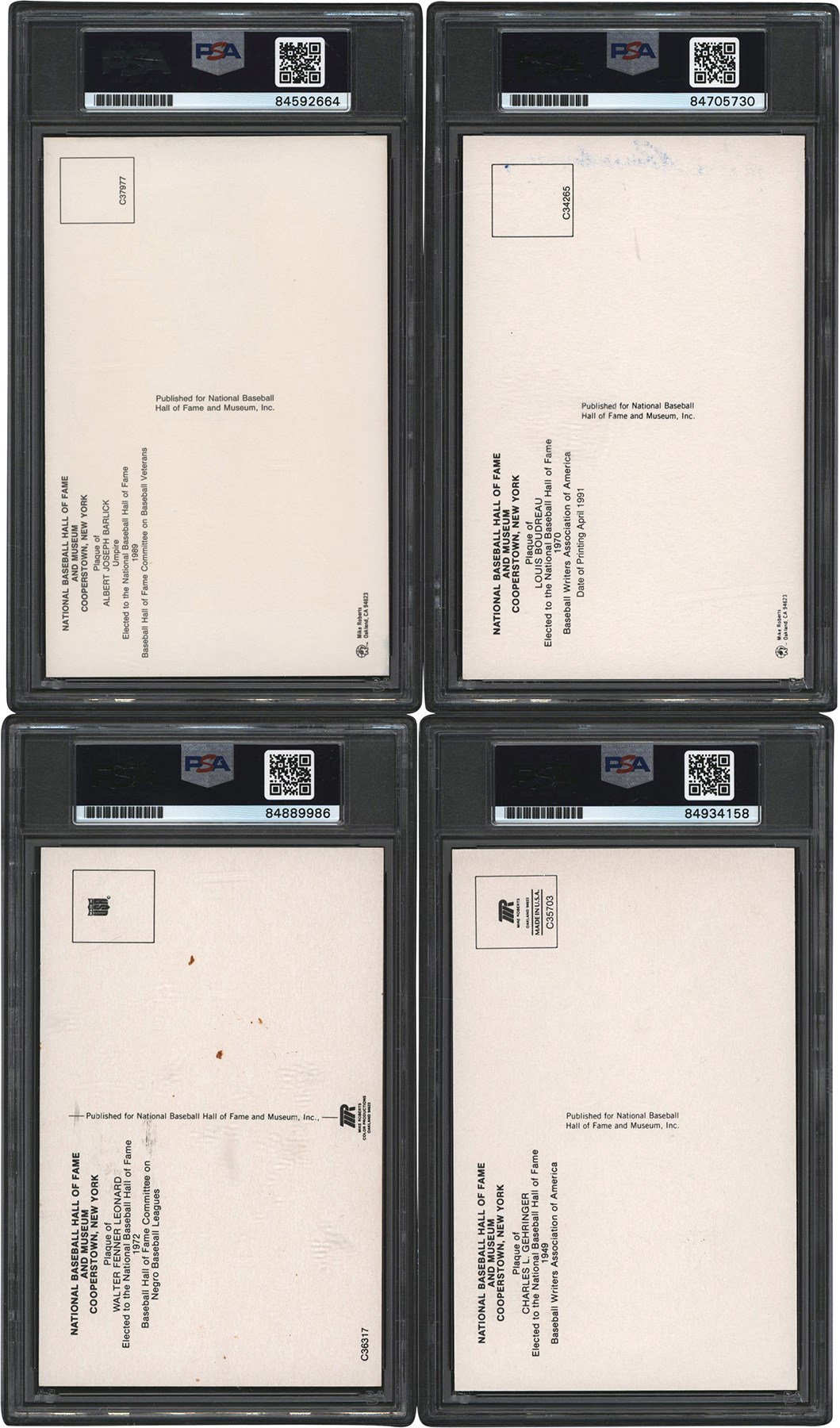 Yellow Hall of Fame autographed postcard collection of (20). All of the autographs have been authenticated and encapsulated by PSA unless noted. The collection includes: Al Barlick; Lou Boudreau; Stan Coveleski; Bobby Doerr; Bob Feller; Rick Ferrell; Charlie Gehringer; Pat Gillick; Billy Herman; Jim Hunter; George Kell; Bob Lemon; Buck Leonard; Johnny Mize-JSA-Not Encapsulated; Robin Roberts; Joe Sewell; Enos Slaughter; Duke Snider; Warren Spahn; Hoyt Wilhelm-JSA-Not Encapsulated.