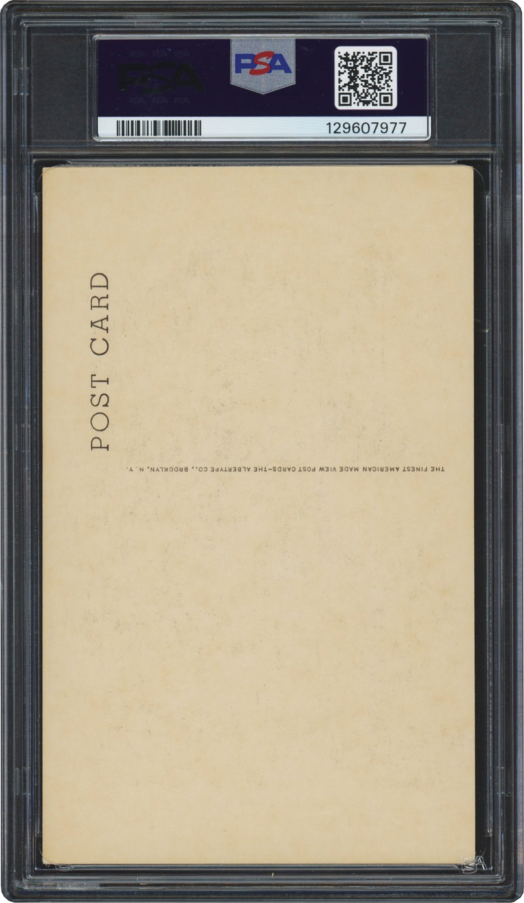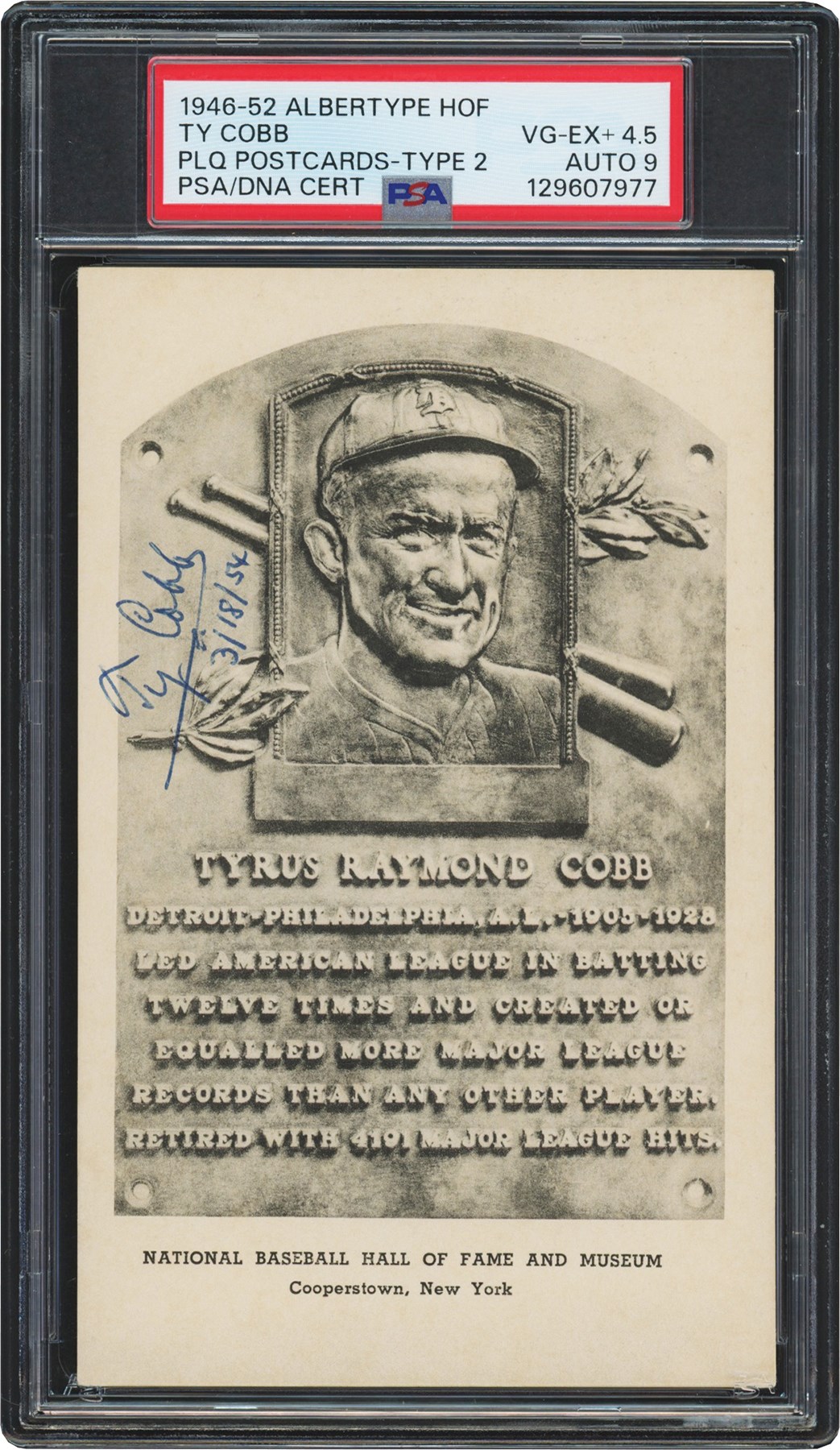 1946-52 Albertype Type 2 Hall of Fame Ty Cobb Autographed Postcard. The postcard and autograph were graded and encapsulated by PSA VG-EX+ 4.5 with an Auto grade of 9. The autograph was done in black ink pen, vertically, to the left of the HOF plaque of Cobb. There is a 3/18/54 inscription next to the autograph. The postcard itself is a cream color with smooth edges and excellent centering. All four corners exhibit light wear. The postcard reverse is unused with light soiling throughout. According to the population report, this is the only dual graded example.