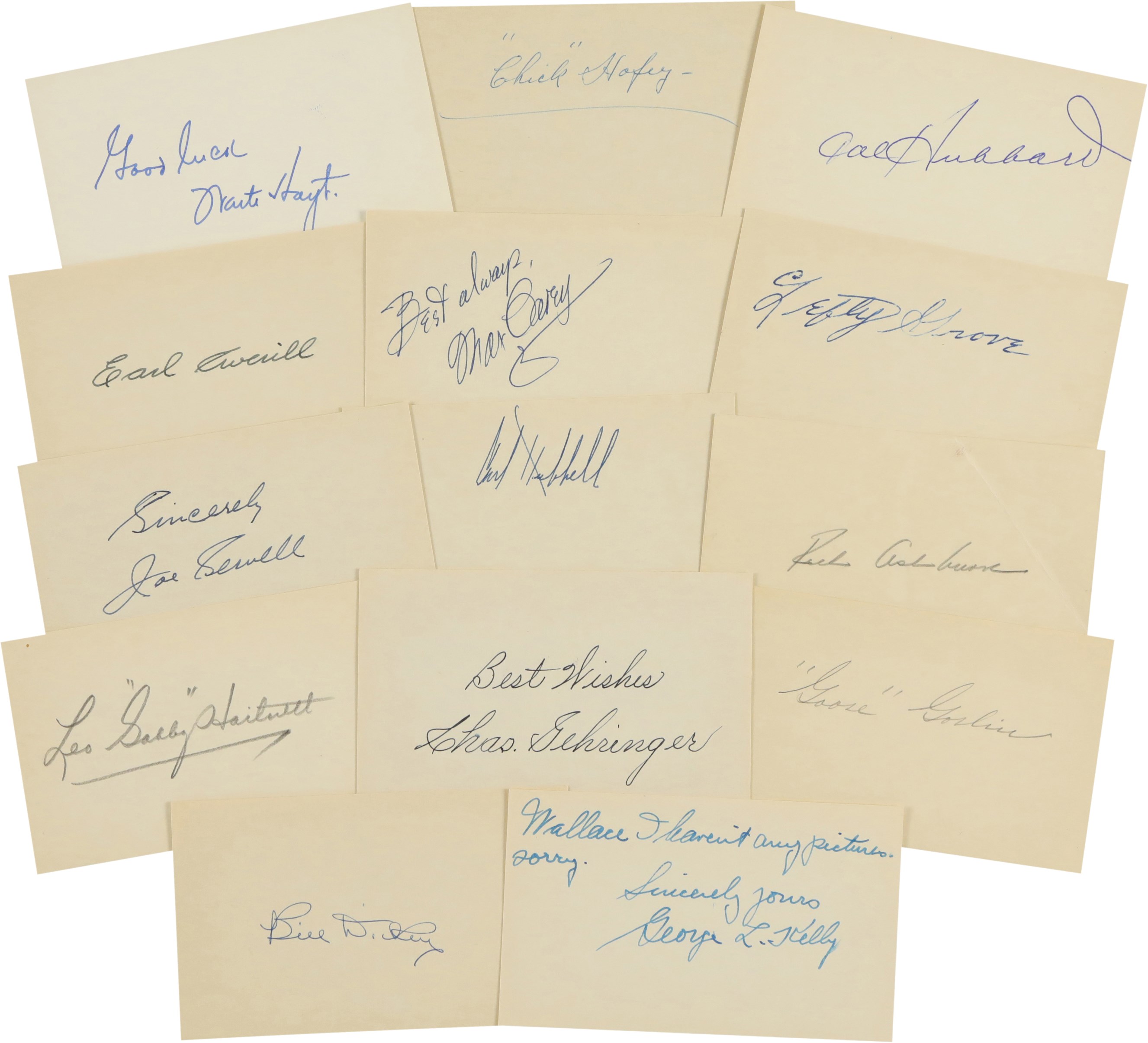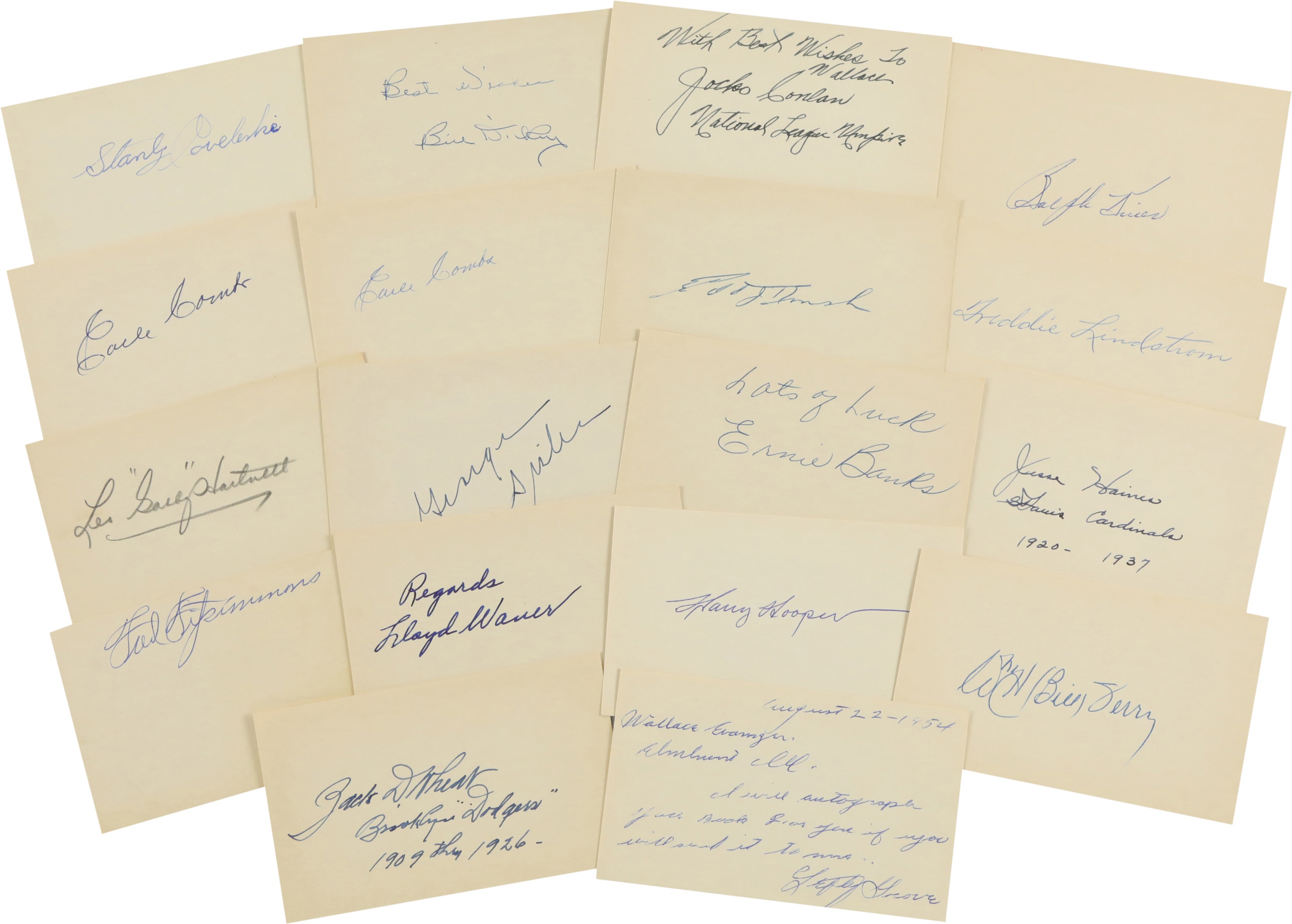 Lot of 32 Baseball Hall of Famer signed 3x5" index cards from the 1950s. Included in this lot are cards signed by, George Sisler, Leo "Gabby" Hartnett (2), "Goose" Goslin, Charlie Gehringer, Lefty Grove (2), Ernie Banks, Joe Sewell, Earle Combs (2), Lloyd Waner, Freddie Lindstrom, Zack Wheat, Jessie Haines, Bill Dickey (2), Carl Hubbell, Ralph Kiner, Stanley Coveleski, George L. Kelly, W. H. Bill Terry, Waite Hoyt, Jocko Conlan, Max Carey, Earl Averill, Harry Hooper, Richie Ashburn, Cal Hubbard, "Chick" Hafey, Ed Roush, and Fred Fitzsimmons. A handful of the cards in this collection are personalized, "To Wallace." The cards are in excellent condition overall.
