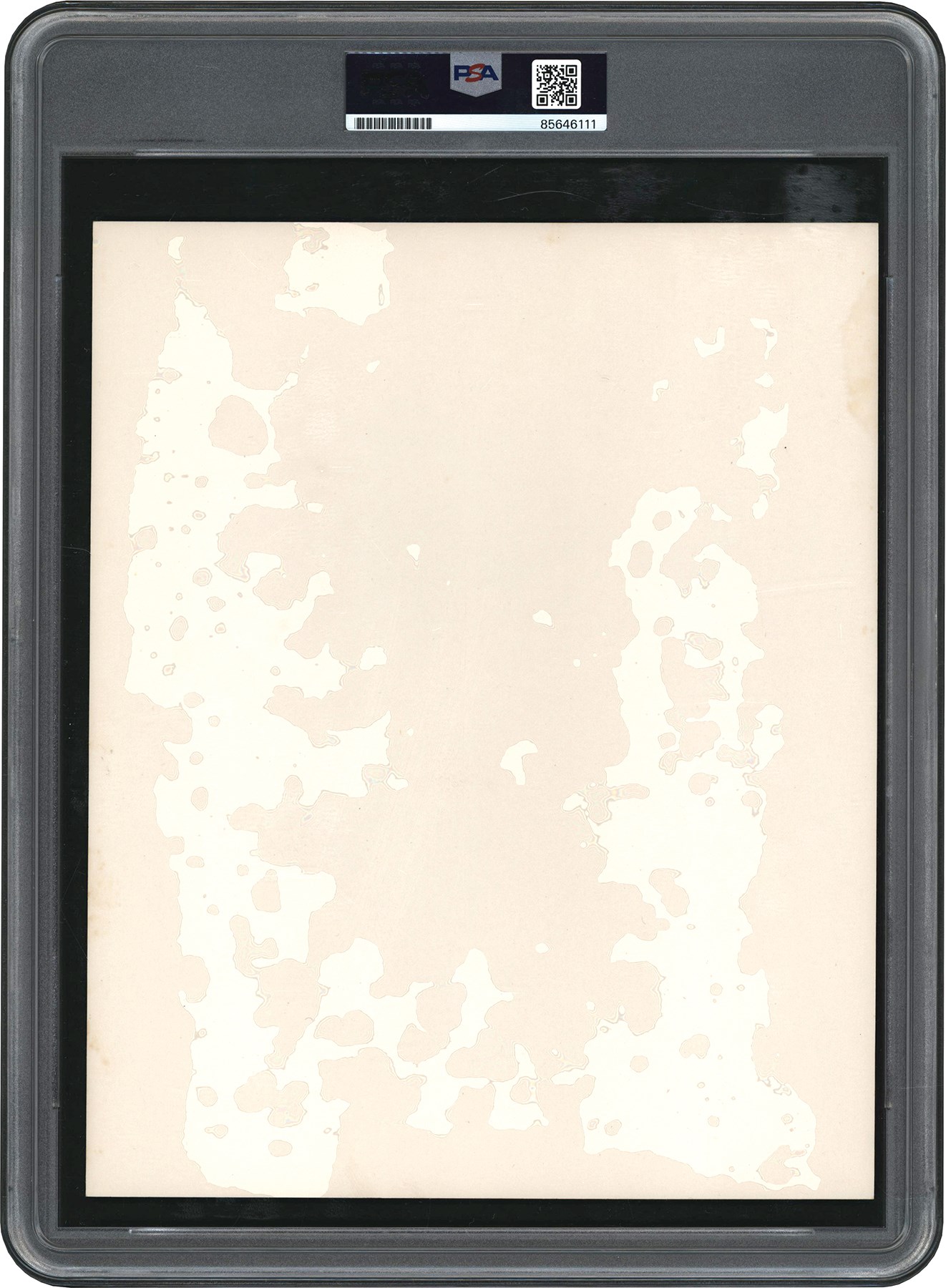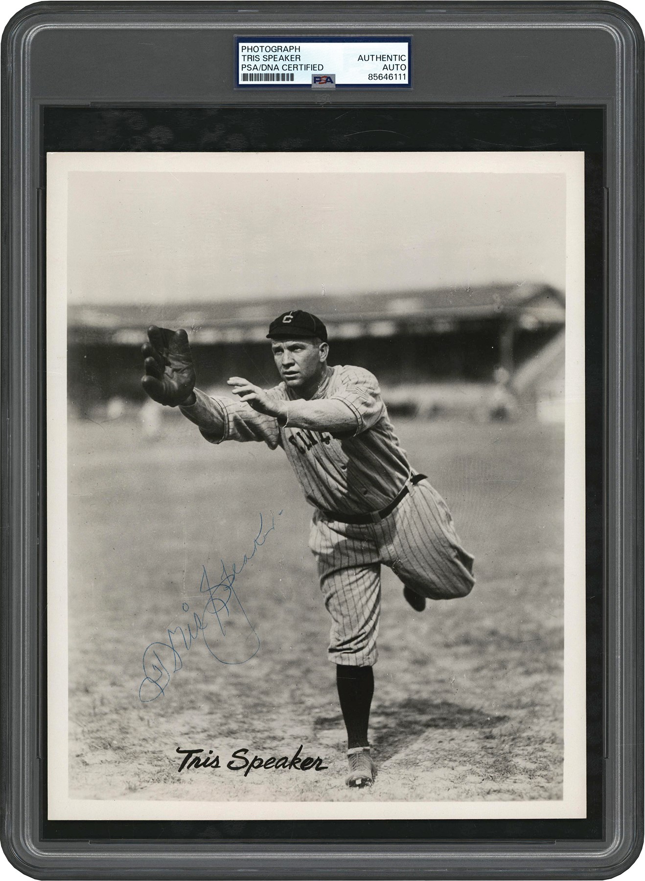 The offered Speaker signed black & white hobby fresh photograph measures 8x10", and the photo has a facsimile Speaker autograph. Speaker is wearing his Cleveland uniform. "The Gray Eagle" signed in blue ink, and his autograph rates 8/10. The offering has been encapsulated and PSA/DNA CERTIFIED "AUTHENTIC AUTO" (85646111). The photograph is in EXCELLENT condition.