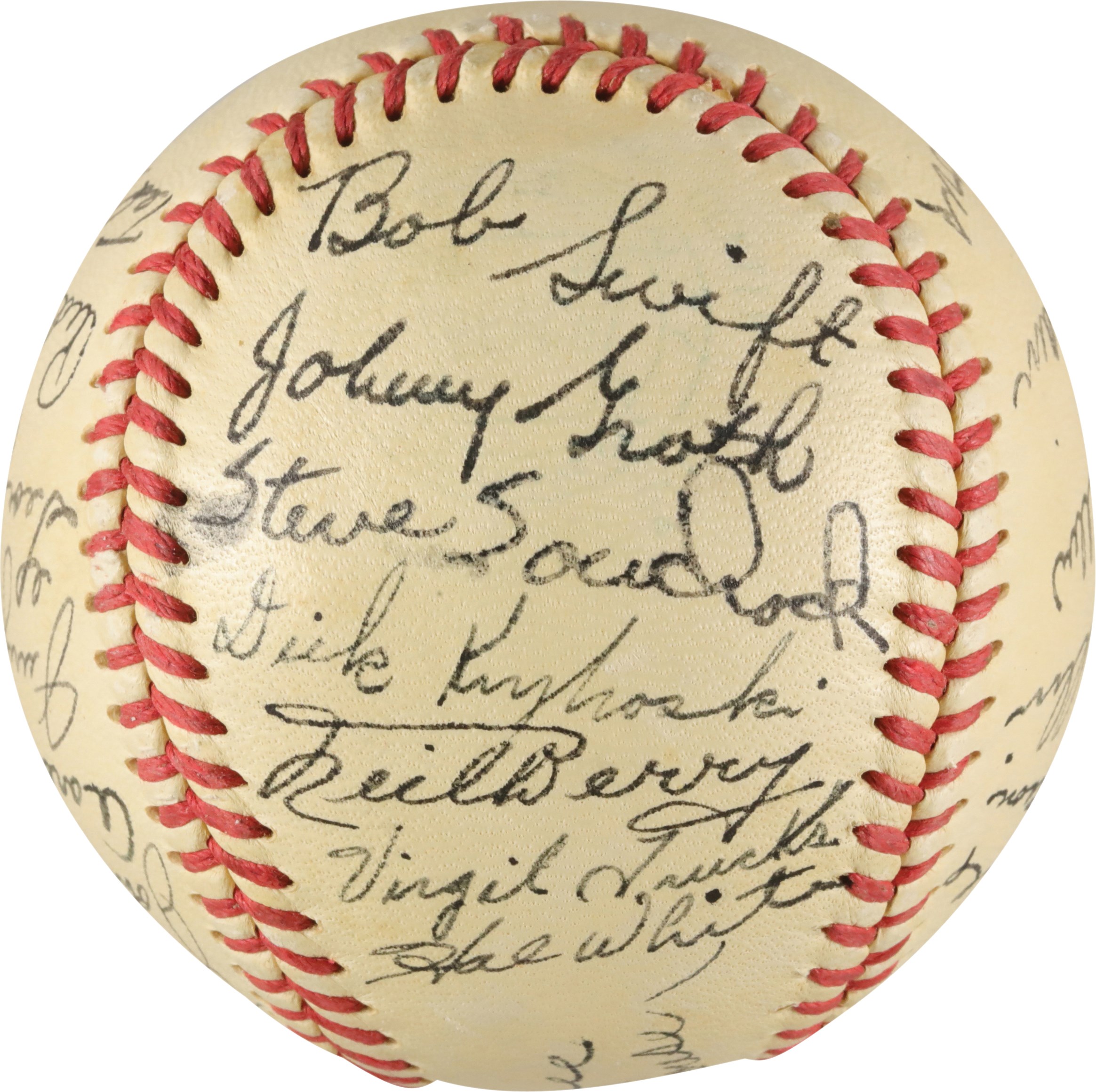 Presented is an Official American League (Harridge) ball that has been signed by 29 members of the 1951 Detroit Tigers. Hal Newhouse and Rick Fjerrell signed the sweet spot of this ball. It has also been signed by Dick Bartell, Fred Hutchinson, Pat Mullin, Charlie Keller, Bob Cain, Ted Lyons, Vic Wertz, Johnny Lipon, Aaron Robinson, Jerry Priddy, George Kell, Red Rolfe, Ted Gray, Bob Swift, Johnny Groth, Steve Souchock, Dick Kryhoski, Neil Berry, Virgil Trucks, Hal White, Gene Bearden, Marlin Stuart, Hank Borowy, Hoot Evers, Joe Ginsberg, Don Kolloway, and Dizzy Trout. The ball is in excellent condition and the signatures rate 8.5/10 overall.