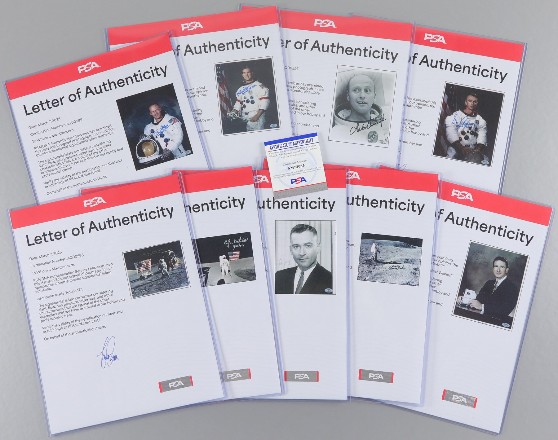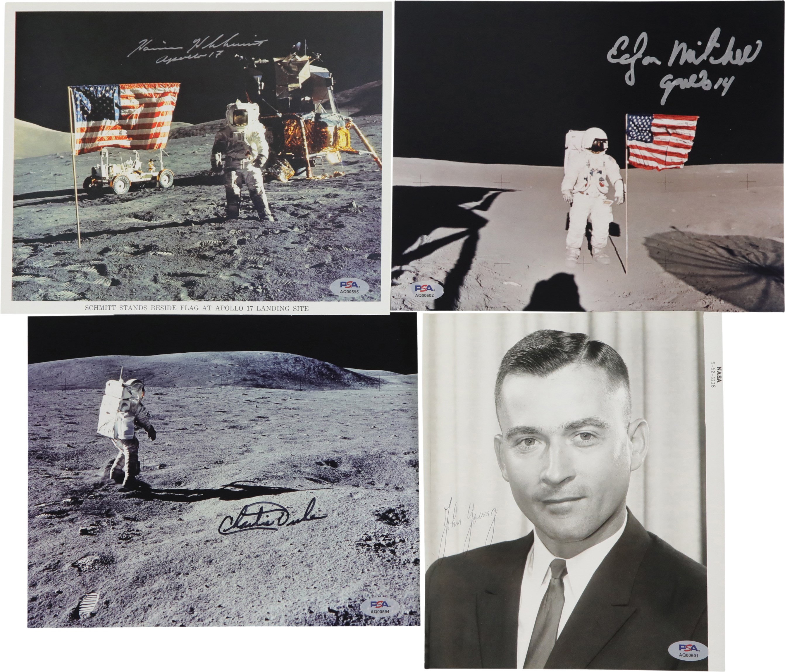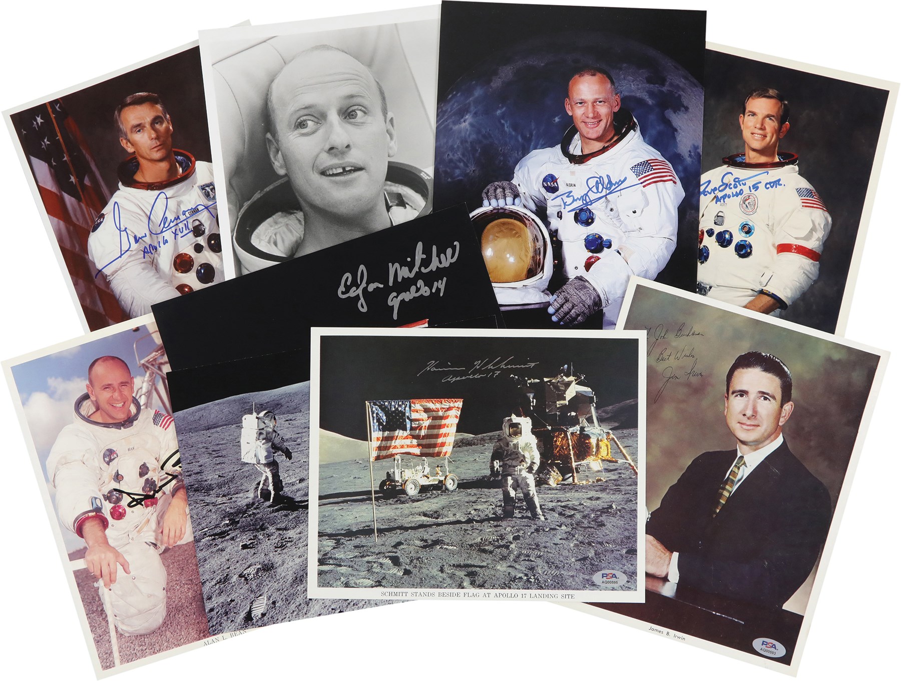 "That's one small step for [a] man. One giant leap for mankind," said NASA Astronaut Neil Armstrong upon becoming the first person to step on the moon, which occurred at 2:56 UTC on July 21, 1969. Presented is a great collection of moonwalking NASA astronauts, with ten signed photos out of the 11 USA moonwalking astronauts who followed Armstrong. Of the 12 persons who have ever walked on the moon, all have been USA astronauts. Each of the photos measures 8x10", and it appears that all or most of the photos originated from the NASA program:
