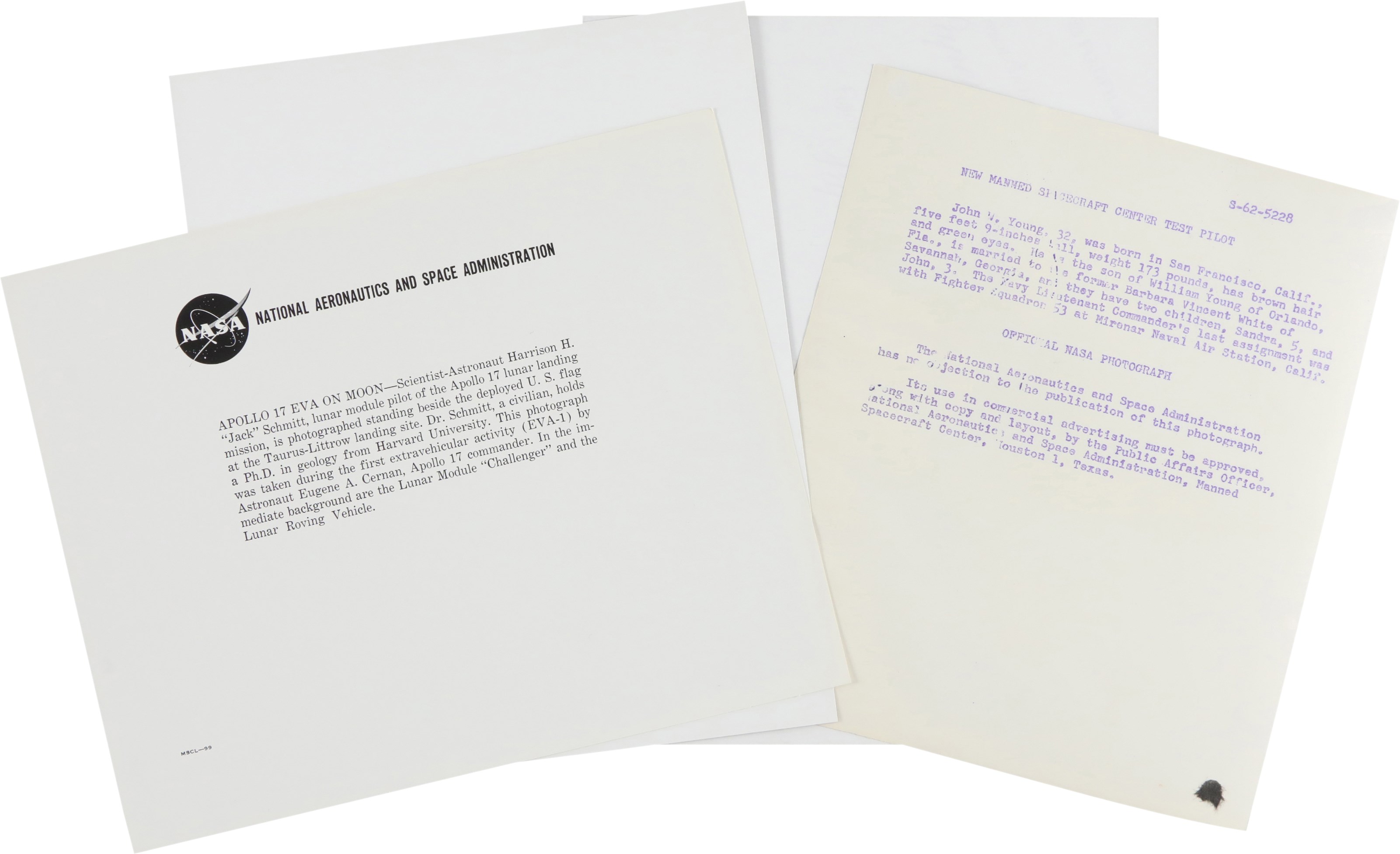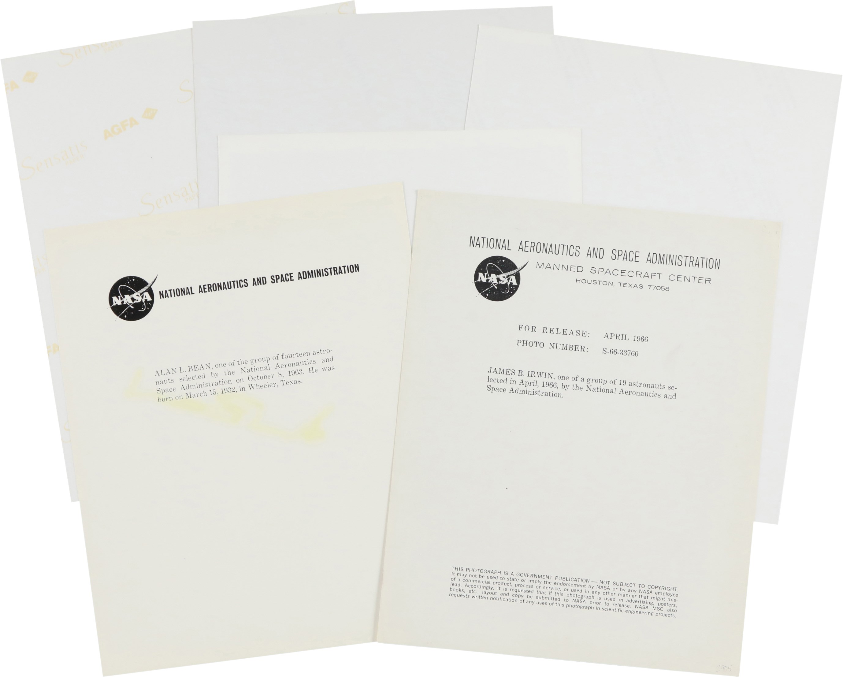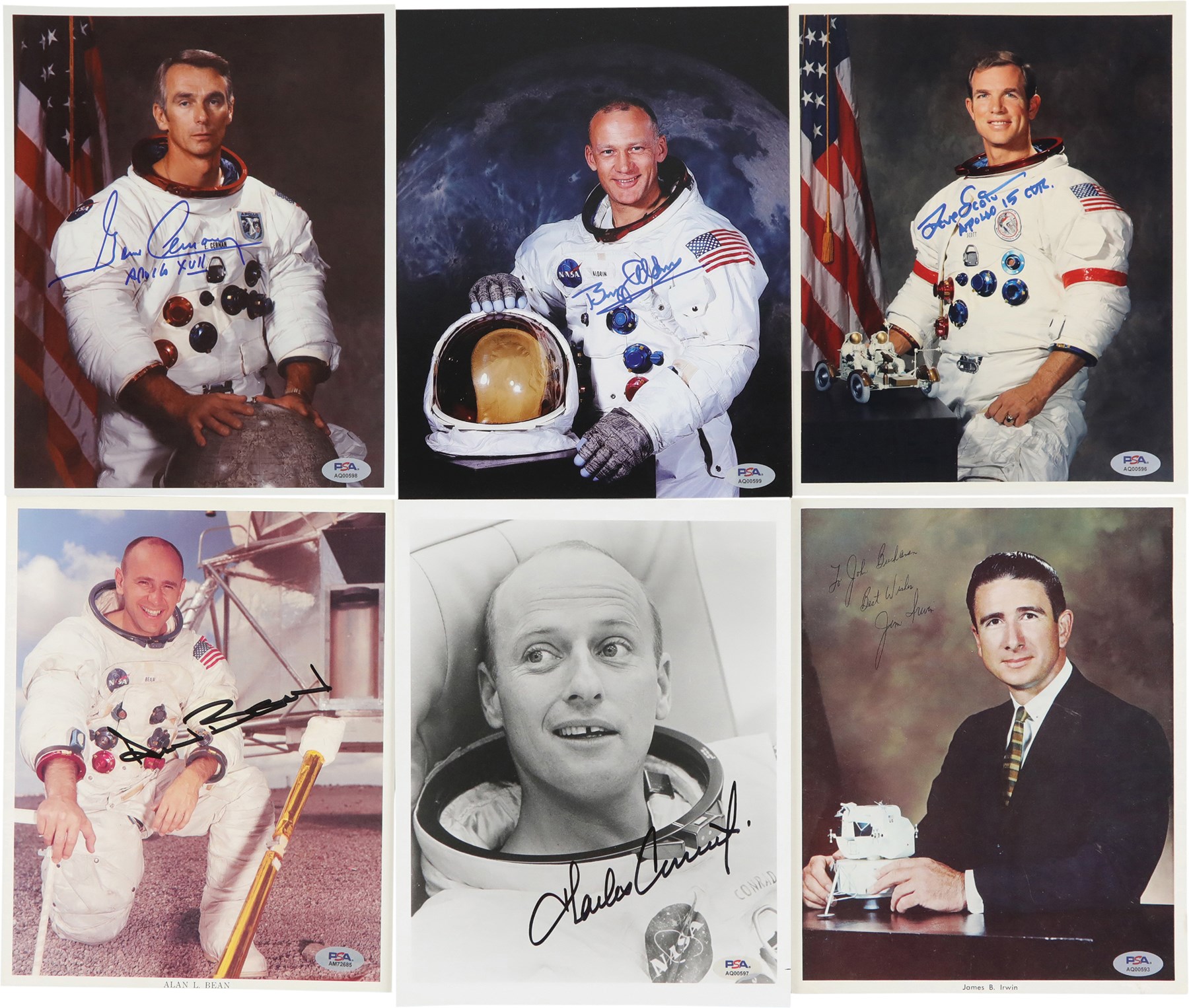 1) Edwin "Buzz" Aldrin in a color photo in space gear. This is a particularly valuable signed photo because Aldrin was with Armstrong on the Apollo 11 flight that permitted two astronauts to step on the moon, and Aldrin walked on the moon just after Armstrong. Aldrin signed as "Buzz Aldrin" in a big and bold autograph in blue marker; 2) Charles "Pete" Conrad in a black & white photo of him in astronaut flight gear. Conrad was a member of the Apollo 12 mission. He signed as "Charles Conrad" in flowing, neat script with a black marker; 3) Alan Bean, in a color photo, in astronaut flight gear, sans helmet. Bean, an Apollo 12 crew member, signed a bold autograph in black marker; 4) Edgar Mitchell, in a color photo of his moon walk. Mitchell signed in silver marker and added the inscription "Apollo 14." 5) David Scott, in a color photo of him in flight suit, sans helmet. Scott signed a neat signature in blue marker and added "Apollo 15 CDR. [Commander]." 6) James Irwin, in a color photo of him in tie and jacket, posed next to a small model of Apollo 15. Irwin signed in black ballpoint ink and added the inscription: "To John Buchanon/Best Wishes/Jim Irwin." Irwin, who died on August 8, 1991, was the first of the dozen astronauts who have walked on the moon to pass away. 7) John Young in coat and tie in a black & white photo. Young was on the Apollo 16 mission. Young signed a flowing signature in blue ballpoint. 8) Charles Duke, moonwalking during the Apollo 16 mission in a black & white photo. Duke signed in black marker as "Charlie Duke." 9) Eugene Cernan, in his NASA flight gear in a posed, color photo. Cernan signed in fine tip blue marker and added the inscription: "Apollo XVII [17]." 10) Harrison Schmitt beside the USA flag at the Apollo 17 landing site. Schmitt signed and inscribed the color photo, in fine tip silver marker, as "Harrison H. Schmitt/Apollo 17."
