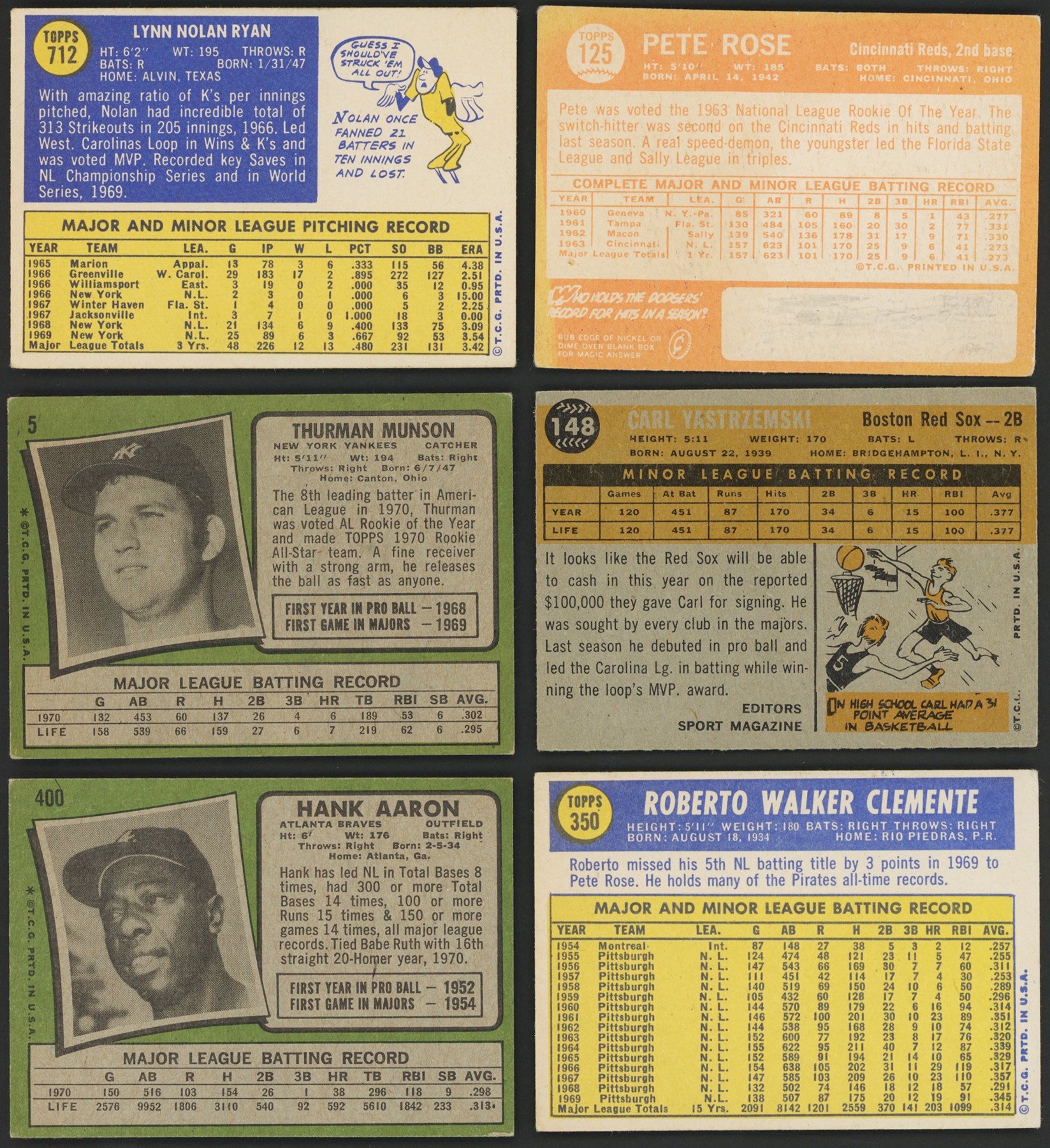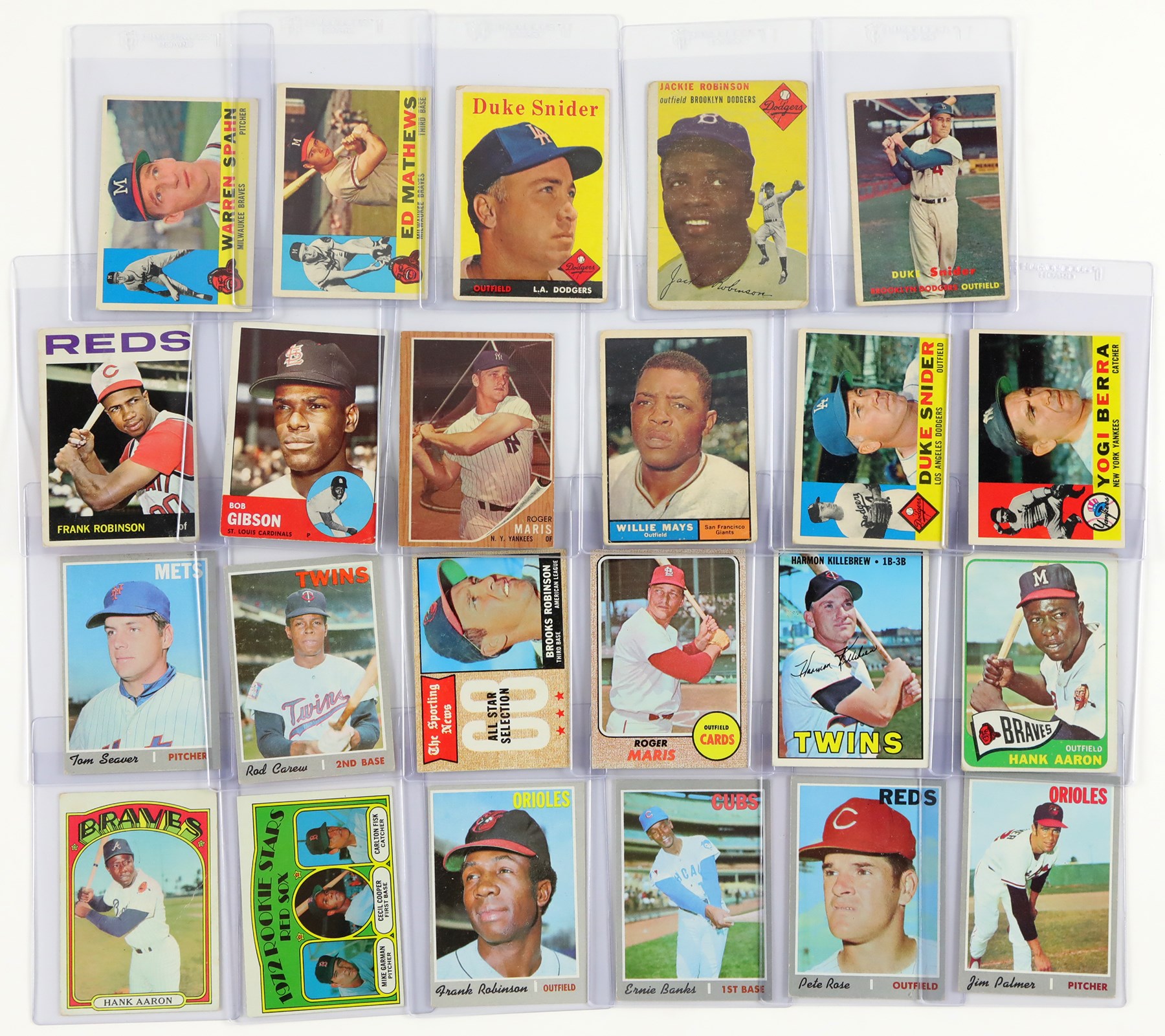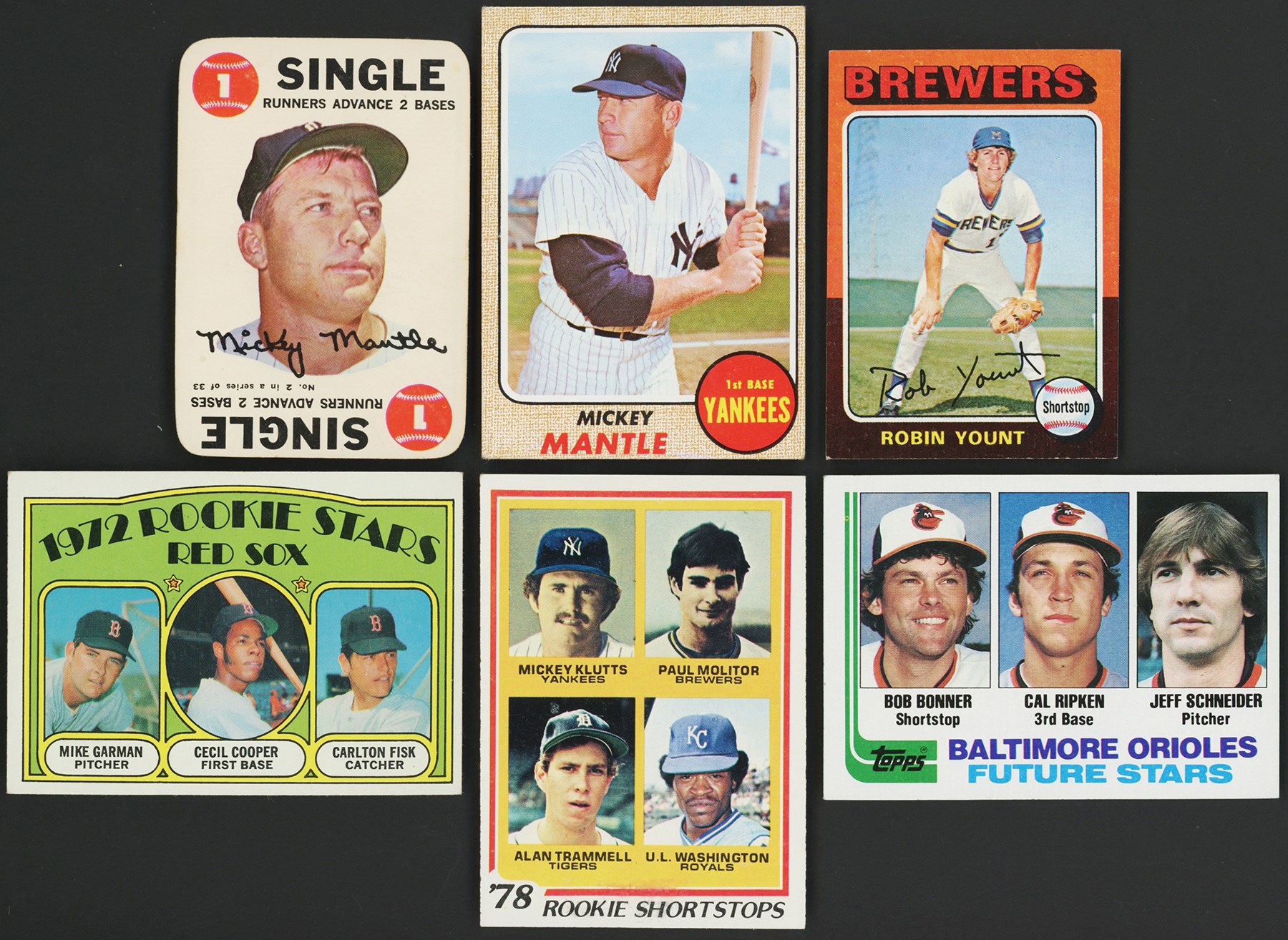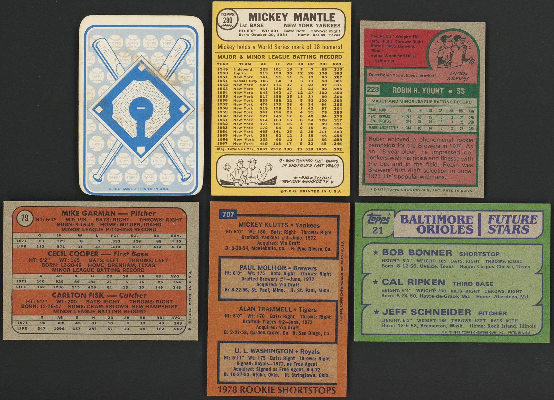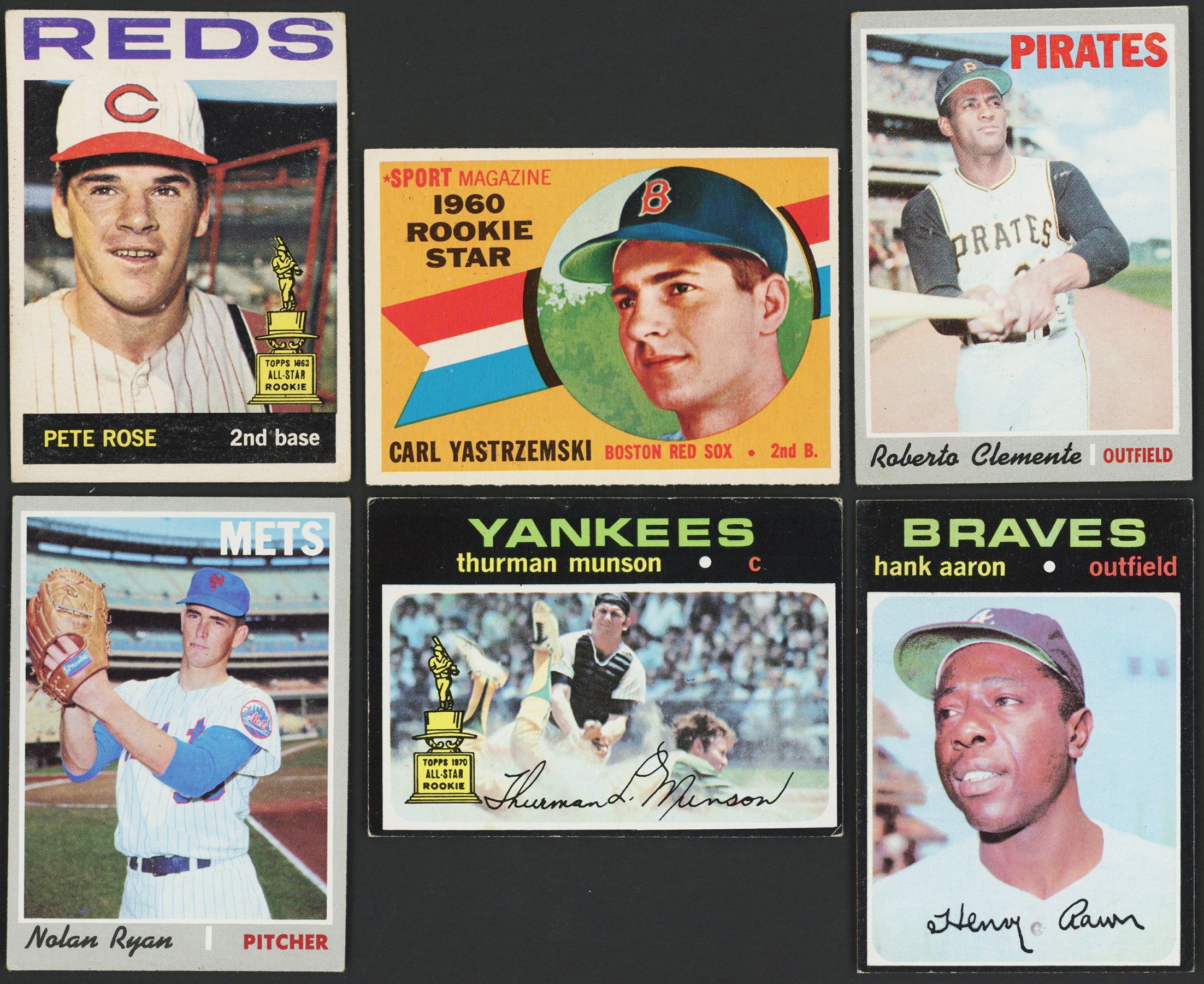 1954-1982 Topps Baseball collection of (35) cards. The collection includes: (1) 1954 Topps 10 J Robinson PR; (1) 1957 Topps 170 Snider FR-pin hole; (1) 1958 Topps 88 Snider VG; (5) 1960 Topps with 140 Yaz (R) VG-EX; 420 Mathews VG; 445 Spahn VG-EX; 480 Berra VG-EX; 493 Snider G-VG; (1) 1961 Topps 150 Mays GD; (1) 1962 Topps 1 Maris GD; (1) 1963 Topps 415 Gibson VG; (2) 1964 Topps WITH 125 Rose VG; 260 F Robinson VG; (1) 1965 Topps 170 Aaron G-VG; (1) 1967 Topps 460 Killebrew VG-EX; (3) 1968 Topps with 280 Mantle VG; 330 Maris VG-EX; 365 B Robinson AS VG; 1968 Topps Game 2 Mantle VG-EX-Reverse (MC); (8) 1970 Topps with 290 Carew VG; 300 Seaver VG; 350 Clemente VG; 449 Palmer VG; 580 Rose VG; 630 Banks VG; 700 F Robinson VG; 712 Ryan VG; (2) 1971 Topps with 5 Munson VG; 400 Aaron VG-EX; (3) 1972 Topps with (2) 79 Fisk (R) (1) VG-EX (1) EX; 299 Aaron PR; 1975 Topps Mini 223 Yount (R) EX; 1978 Topps 707 Trammell/Molitor (R) EX-MT; 1982 Topps 21 Ripken (R) EX-MT.