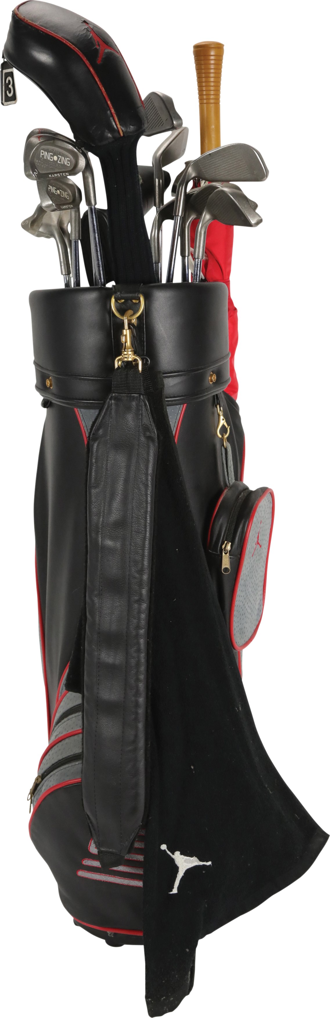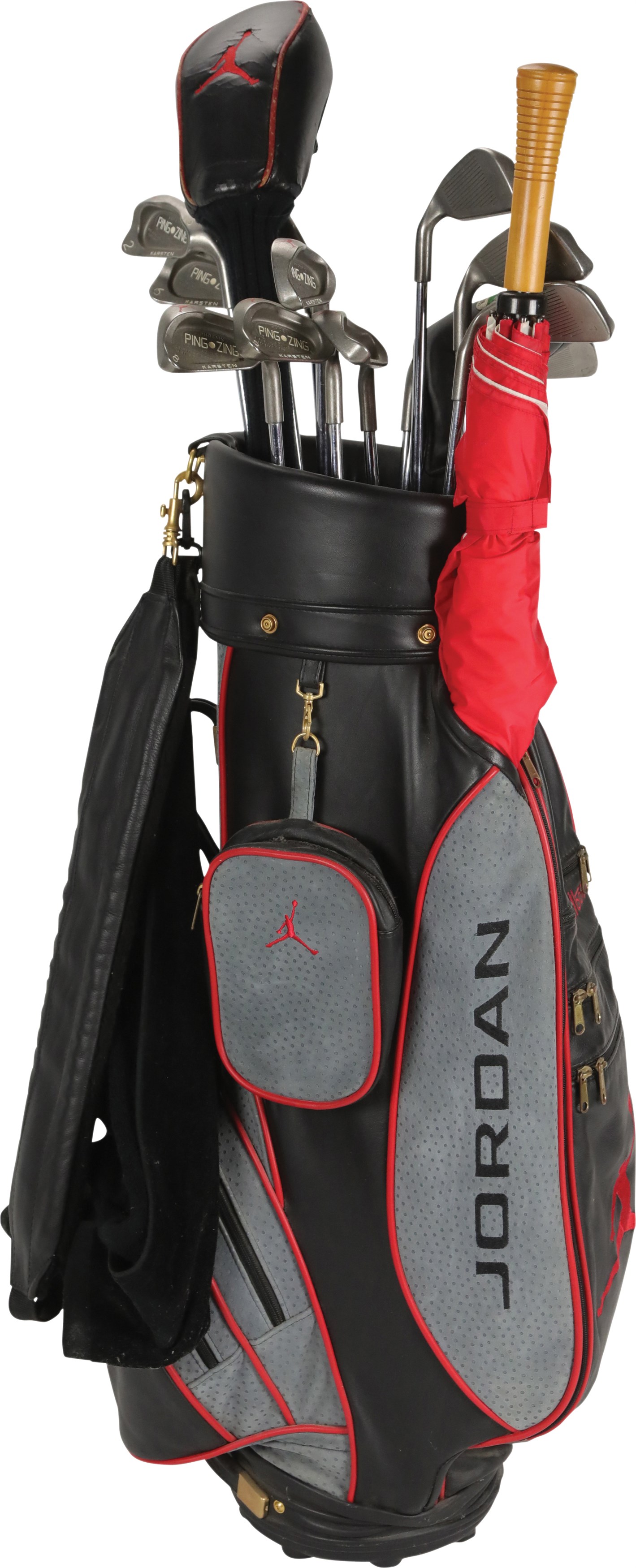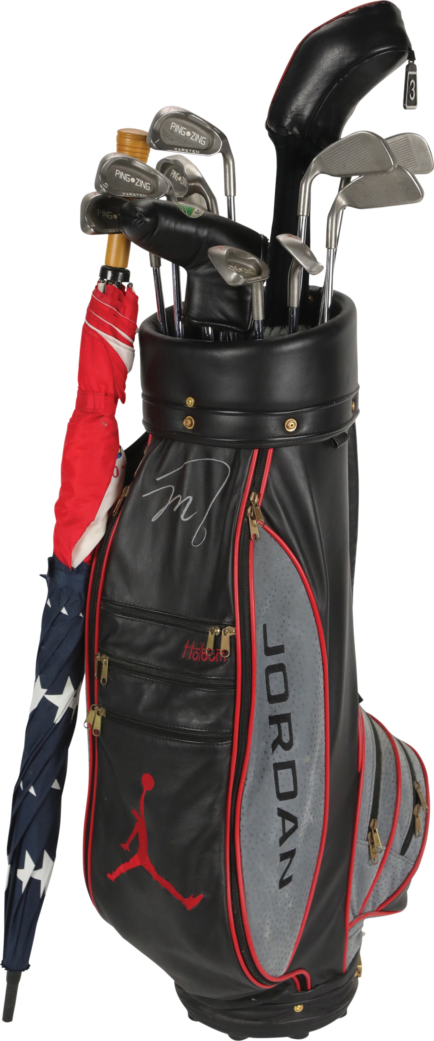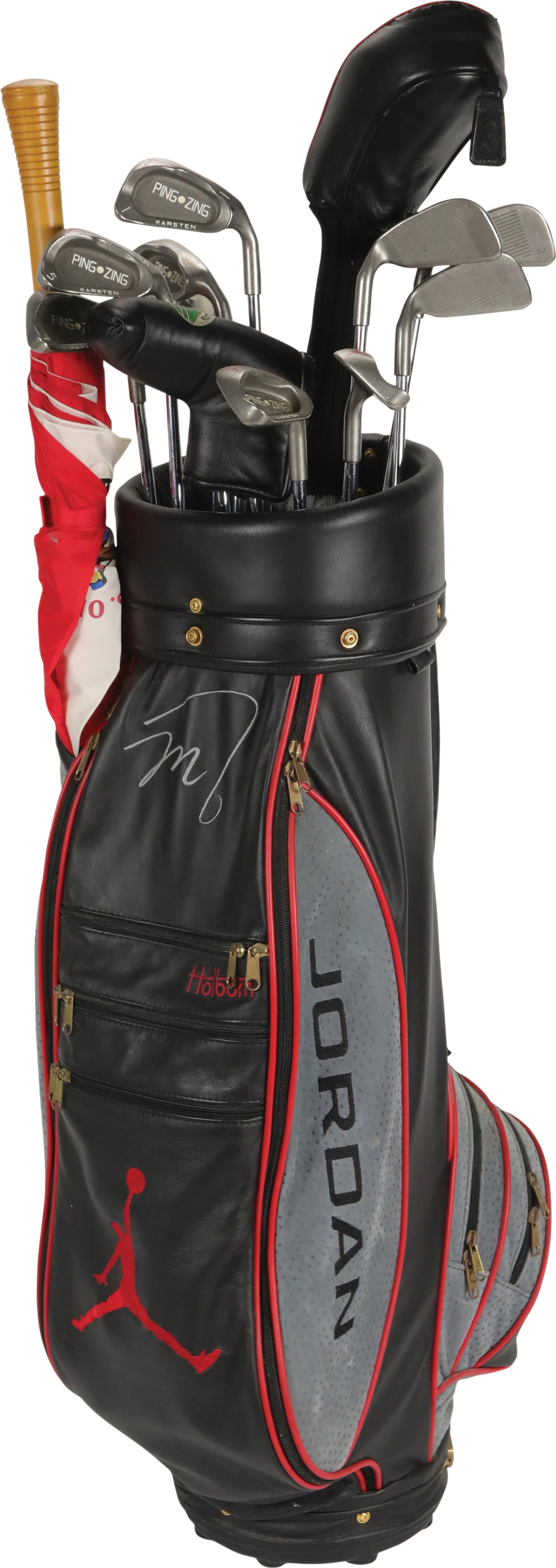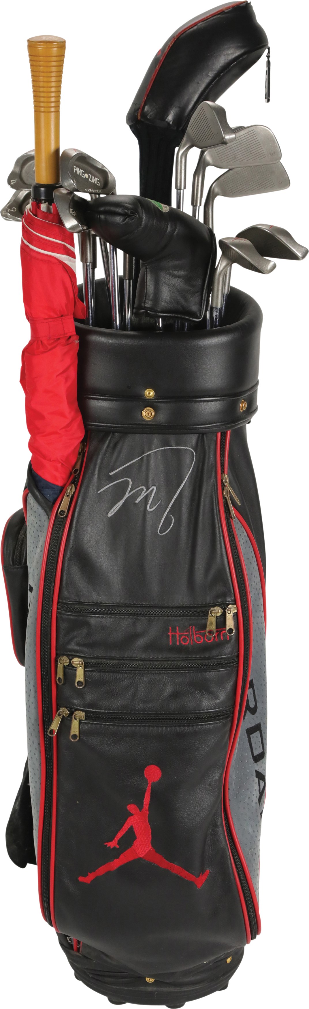 Michael Jordan's personally owned gold bag including clubs, Bethpage Black umbrella, tees, balls, cover and even MJ's chapstick