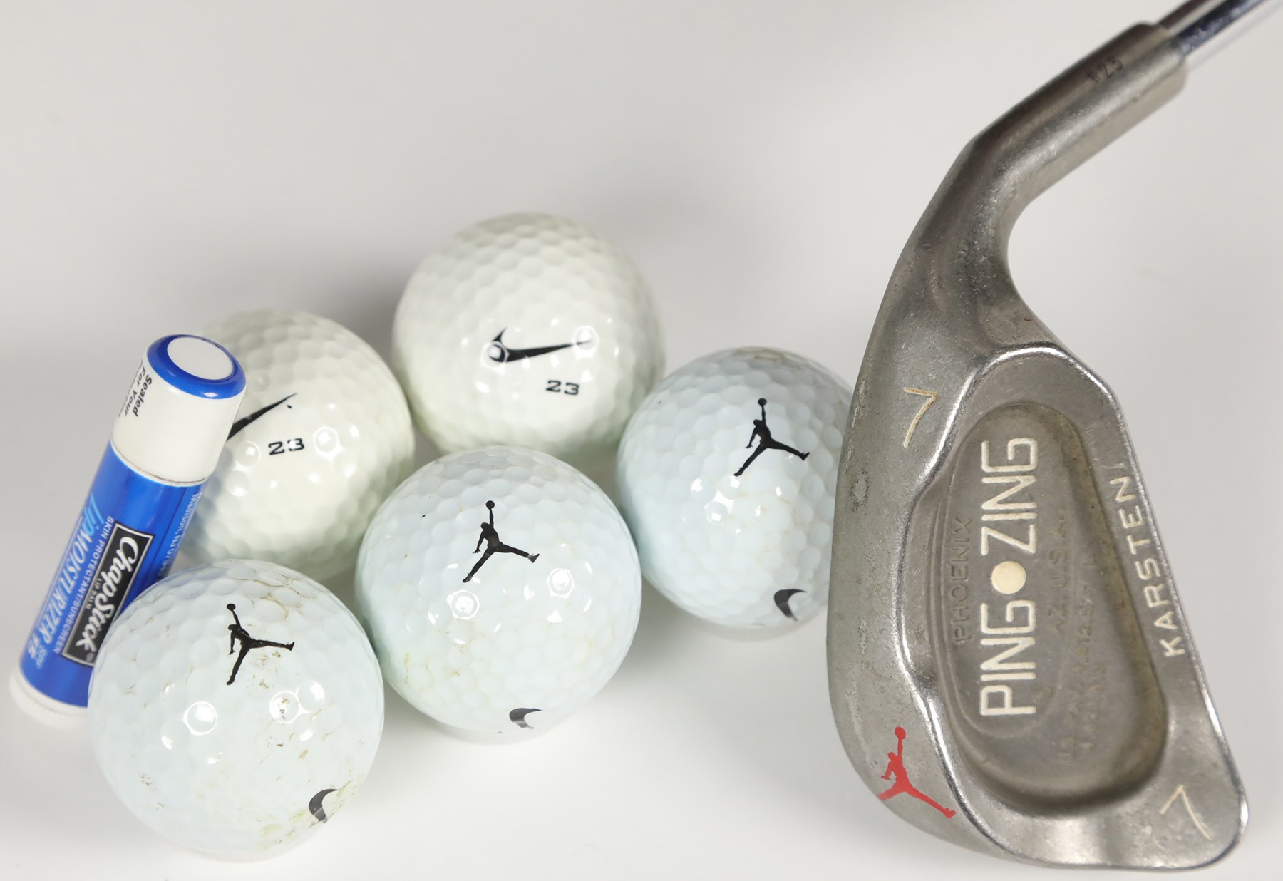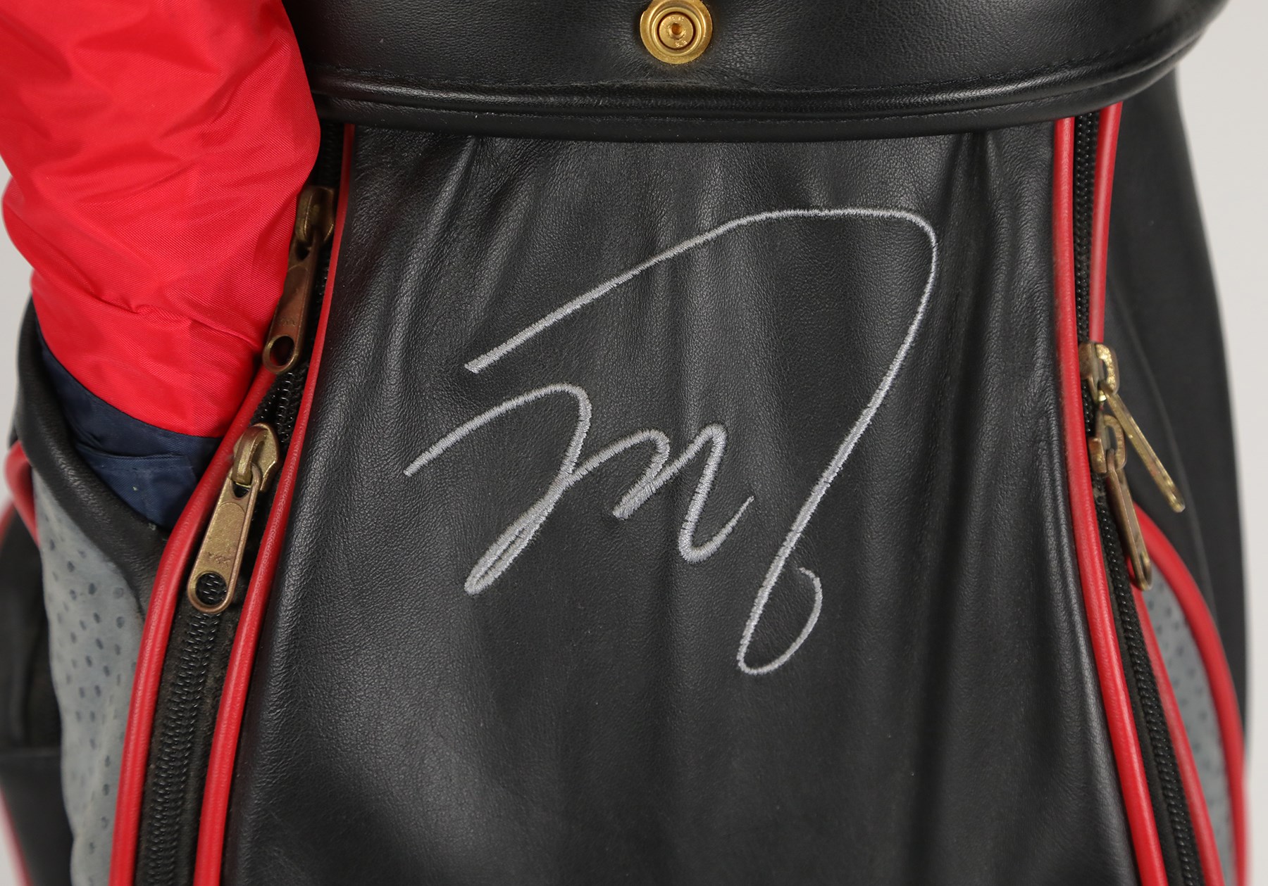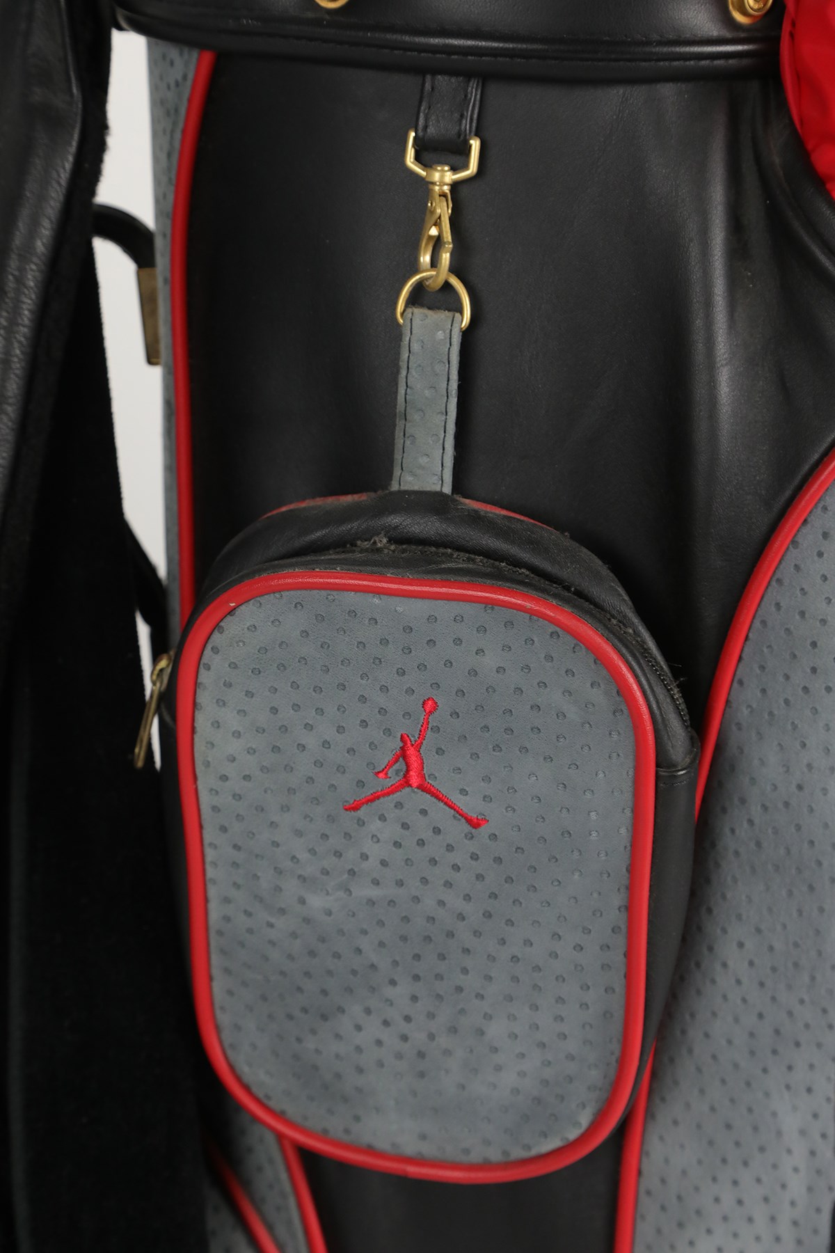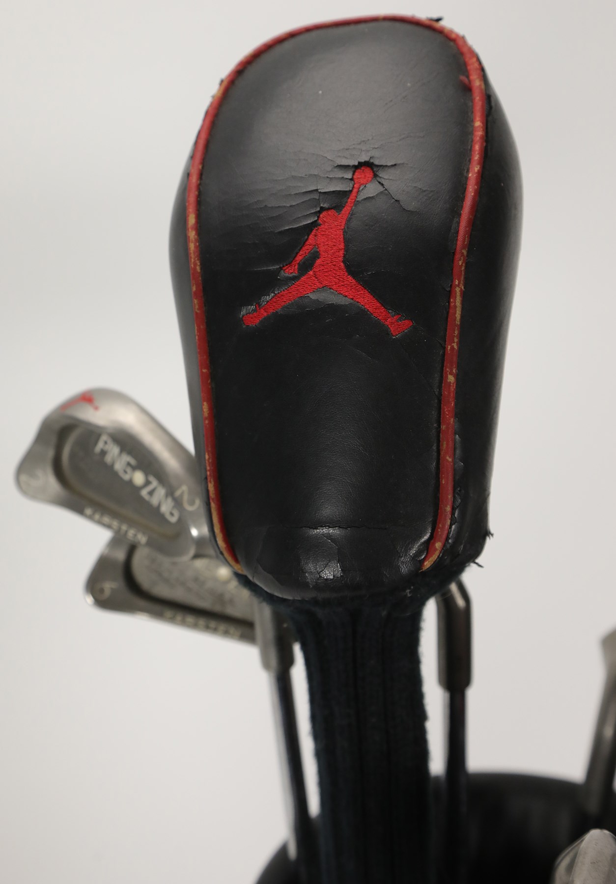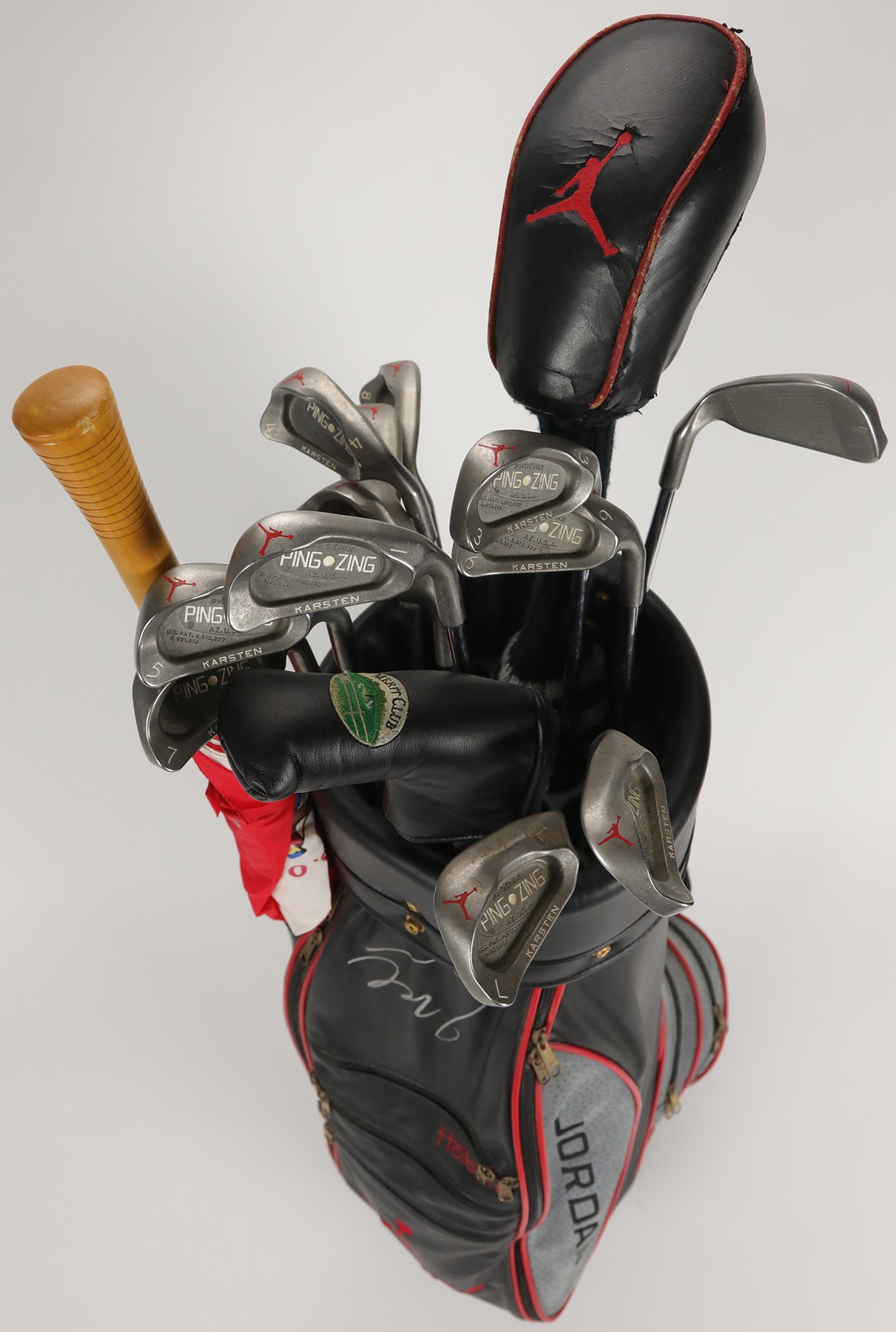 Michael Jordan's personally owned gold bag including clubs, Bethpage Black umbrella, tees, balls, cover and even MJ's chapstick