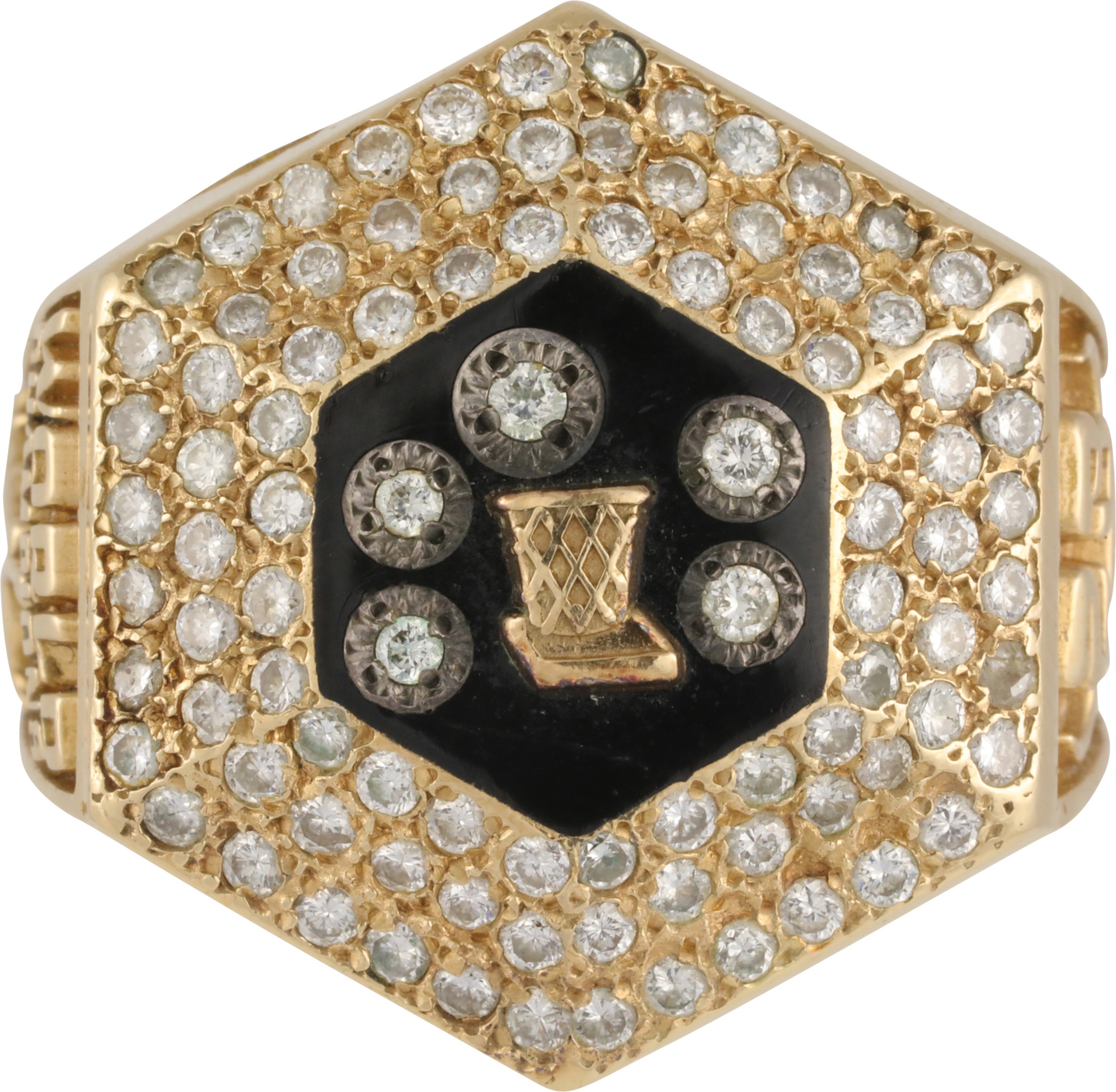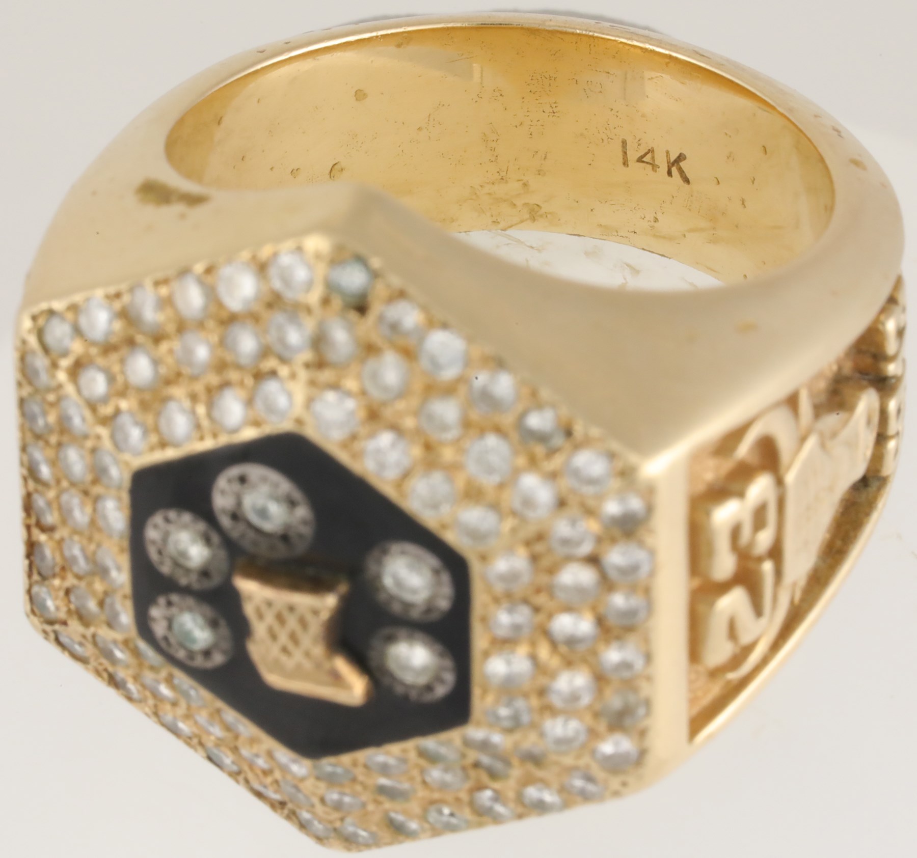 Five diamond in center, within black onyx stone, and (90) small diamonds around the rest of the face