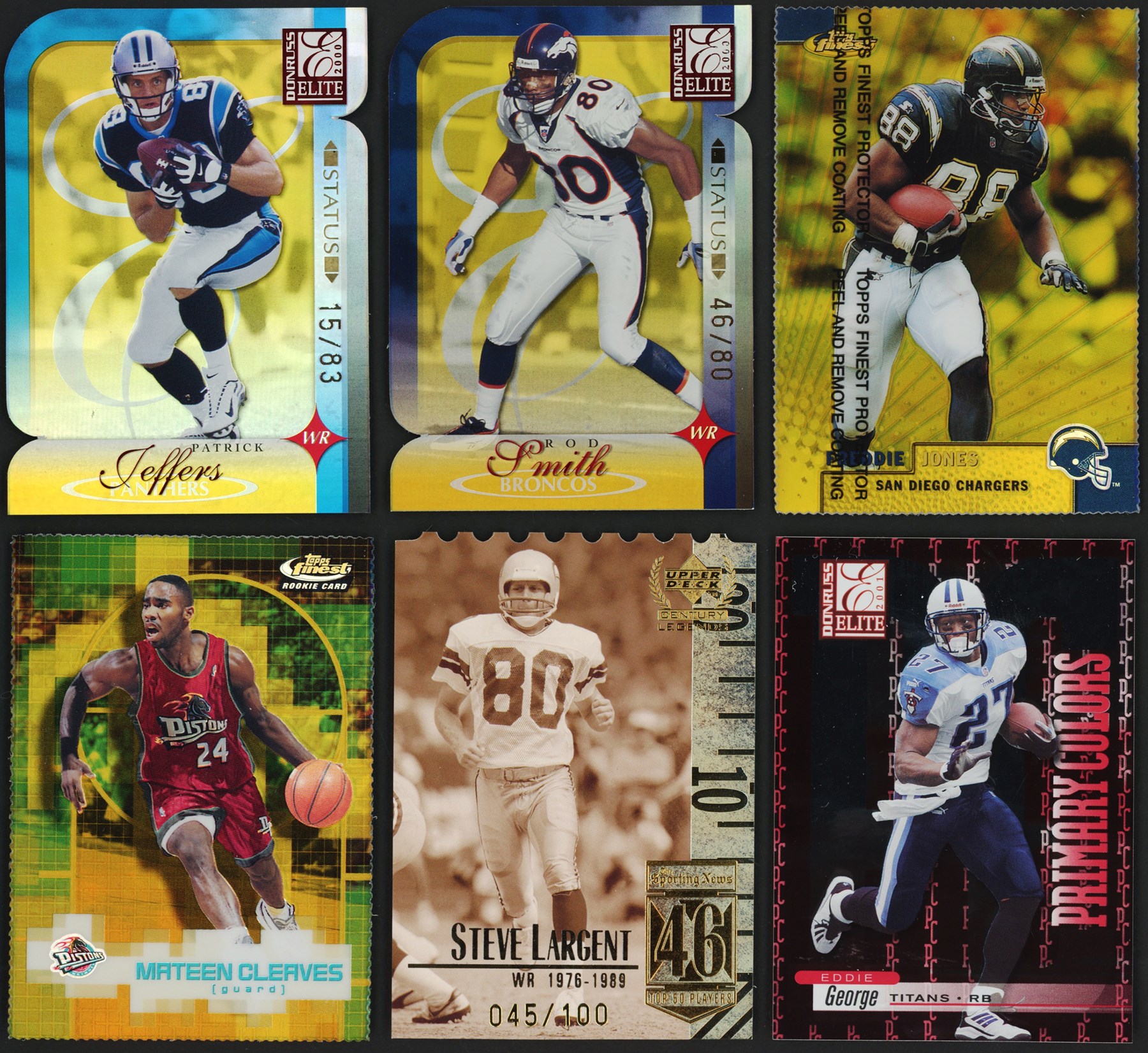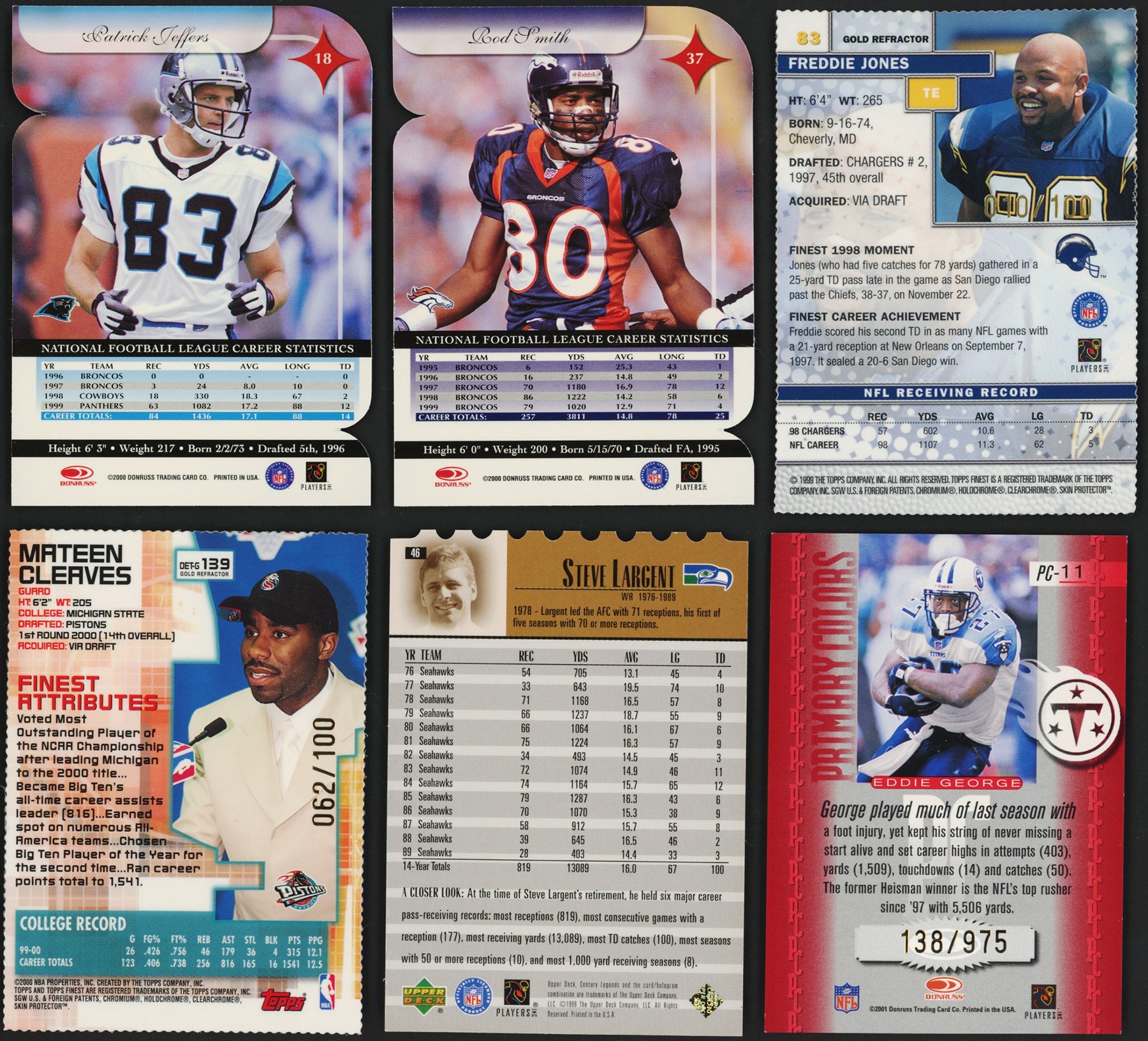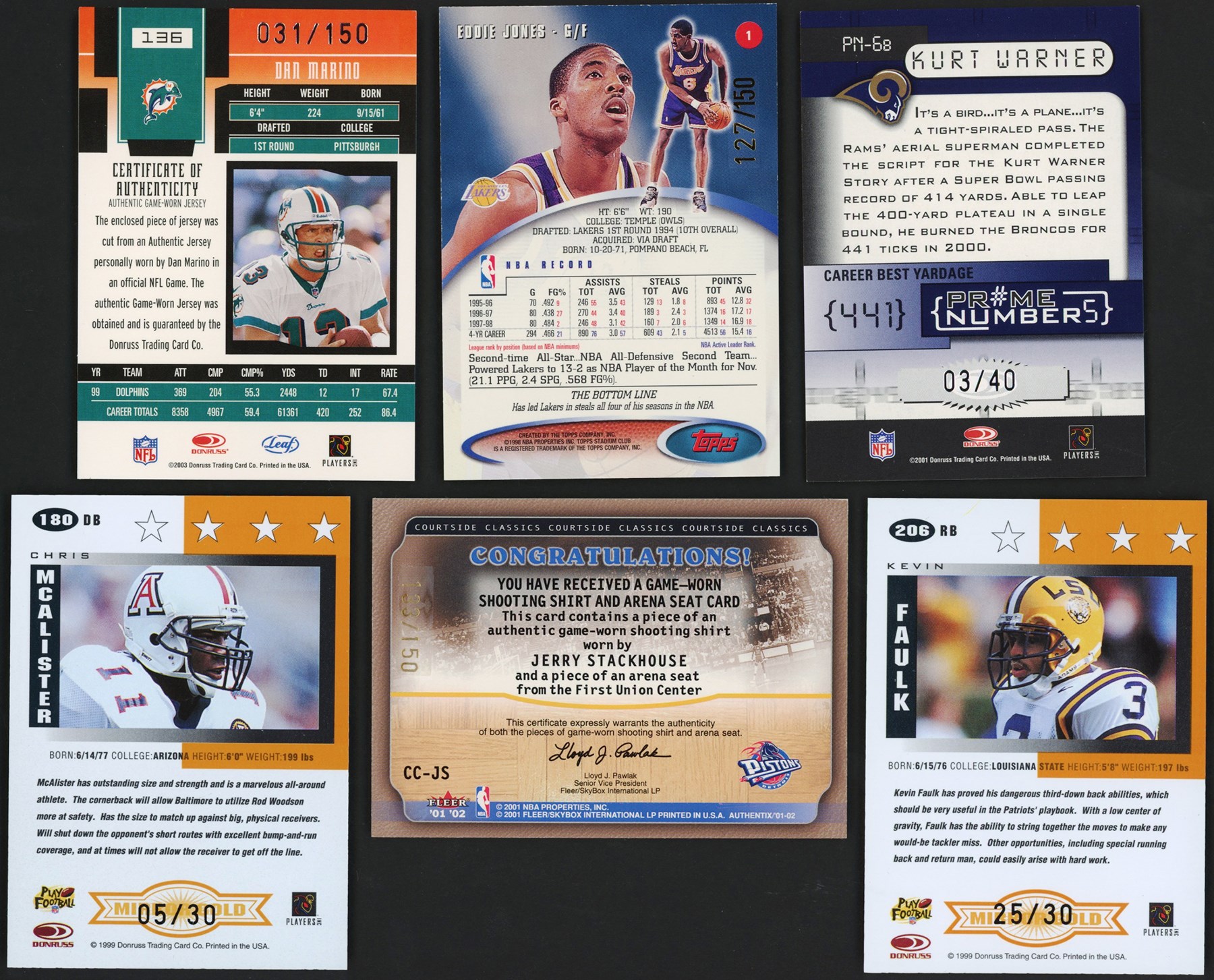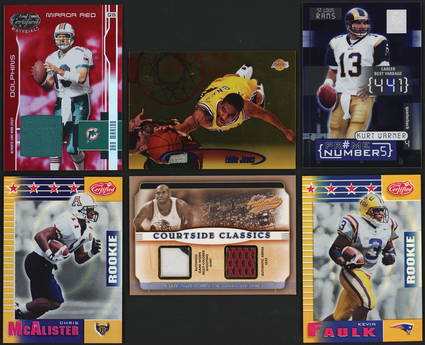 Football cards include: (2) cards from 1999 Donruss Leaf Certified with: #180 Chris McAlister Rookie #05/30; and #206 Kevin Faulk Rookie #25/30; 1999 UD Century Legends #46 Steve Largent Sporting News Top 50 Players #045/100; 1999 Topps Finest #83 Freddie Jones Gold Refractor w/Coating #010/100; 1999 UD Encore F/X #202 Amos Zeredue Star Rookies #087/100; 2000 Topps Chrome #188 Chad Morton Refractor #015/150; 2000 Topps Chrome #251 Tee Martin Refractor #084/150; 2000 Donruss Elite #18 Patrick Jeffers Status #15/83; 2000 Donruss Elite #37 Rod Smith Status #46/80; 2000 Donruss Elite #C-24 Ricky Williams Craftsmen #1410/2500; 2000 Bowman #171 Chris Redman Rookie #91/99; 2001 Donruss Elite #PN-6B Kurt Warner Prime Numbers #03/40; 2001 Donruss Elite #190 Lamar Fletcher Rookie #497/500; 2001 Donruss Elite #PC-11 Eddie George Primary Colors #138/975; 2003 UD Ultimate Collection #17 Trent Green Ultimate #34/75; 2003 Donruss Elite #136 Dan Marino Mirror Red Jersey Relic #031/150.