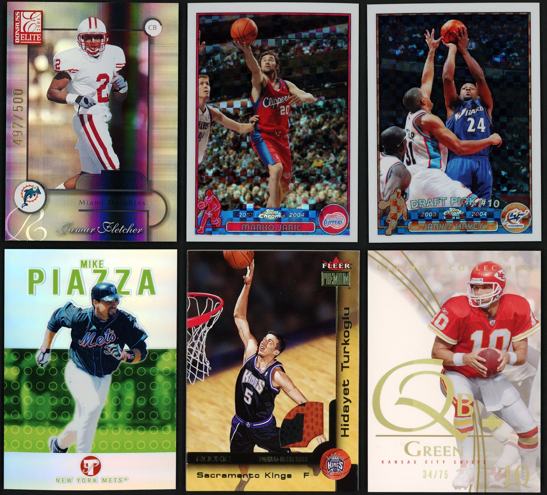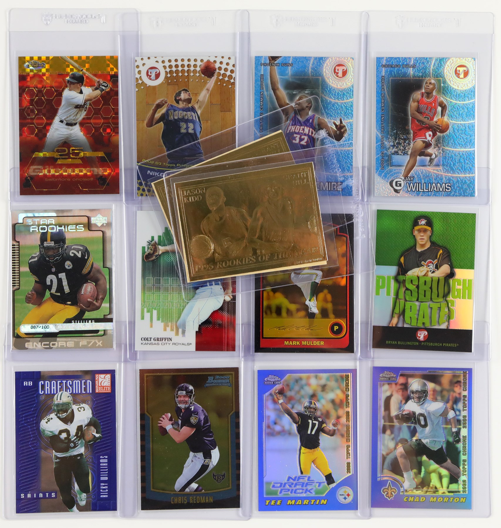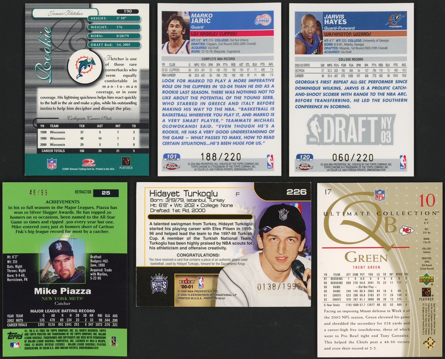 Basketball cards include: (2) 1995 Classic Games Jason Kidd/Grant Hill 23KT Gold 1995 Rookies Of The Year; 1998 Topps Stadium Club #1 Eddie Jones One Of A Kind #127/150; 2000 Topps Finest #139 Mateen Cleaves Rookie Gold Refractor #062/100; 2000 Fleer Premium #226 Hidayet Turkoglu Player Used Ball Relic #0138/1999; 2003 Pristine #54 Jay Williams Rookie Refractor #1265/1899; 2003 Pristine #75 Amar'e Stoudemire Rookie Refractor #0881/1899; 2003 Topps Chrome #101 Marko Jaric X-Fractor #188/220; 2003 Topps Chrome #120 Jarvis Hayes X-Fractor #060/220; and 2003 Pristine #64 Nikoloz Tskitishvili Rookie Refractor #340/499.