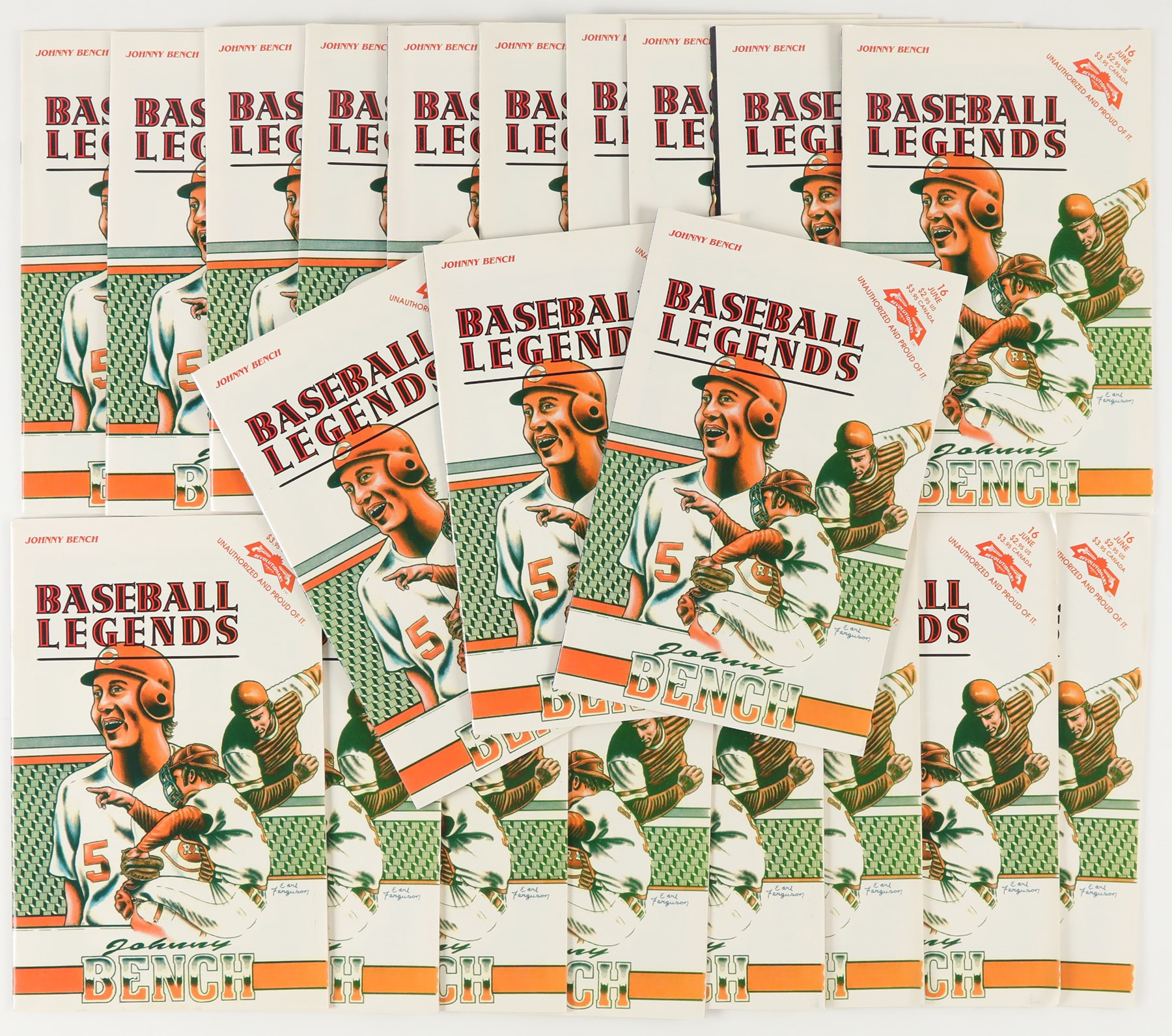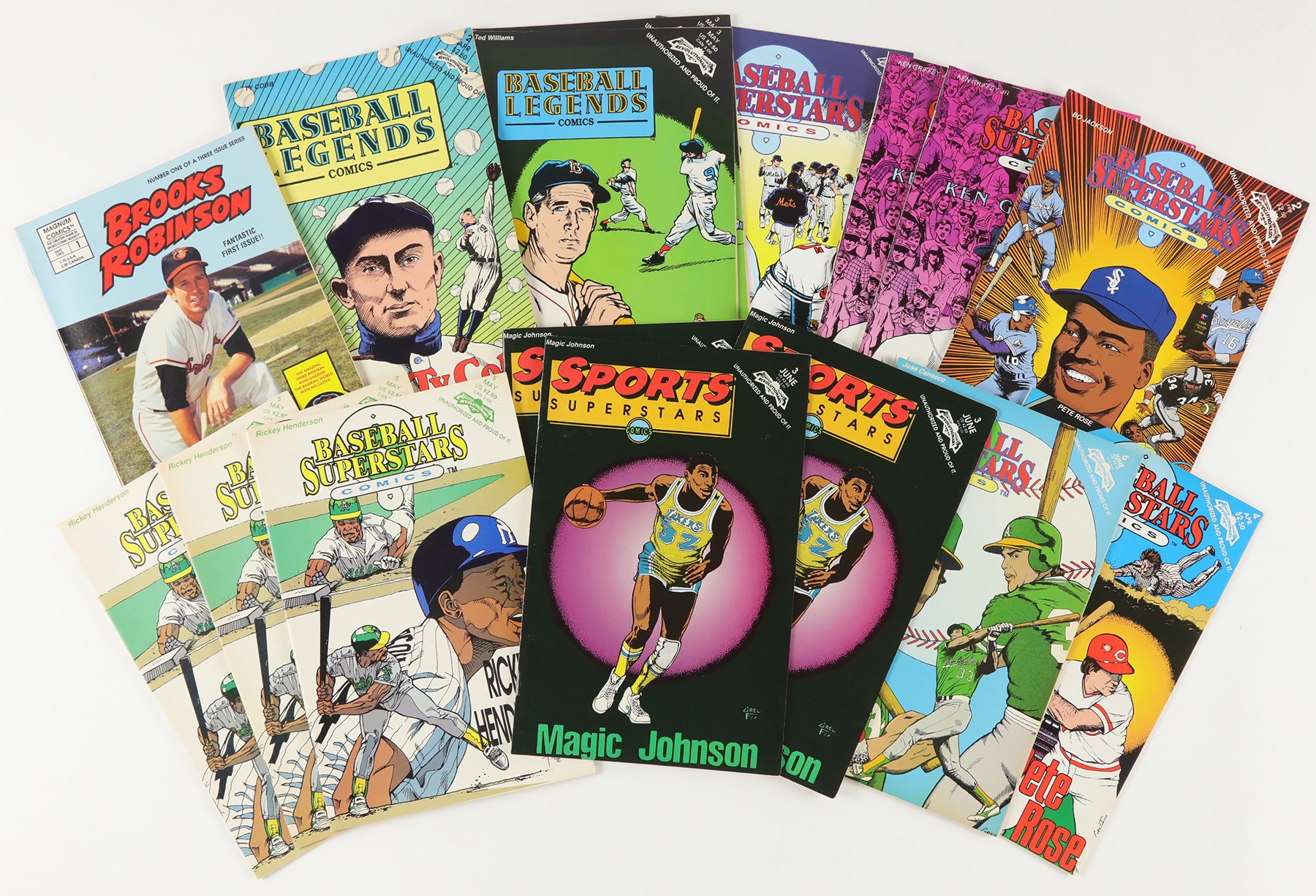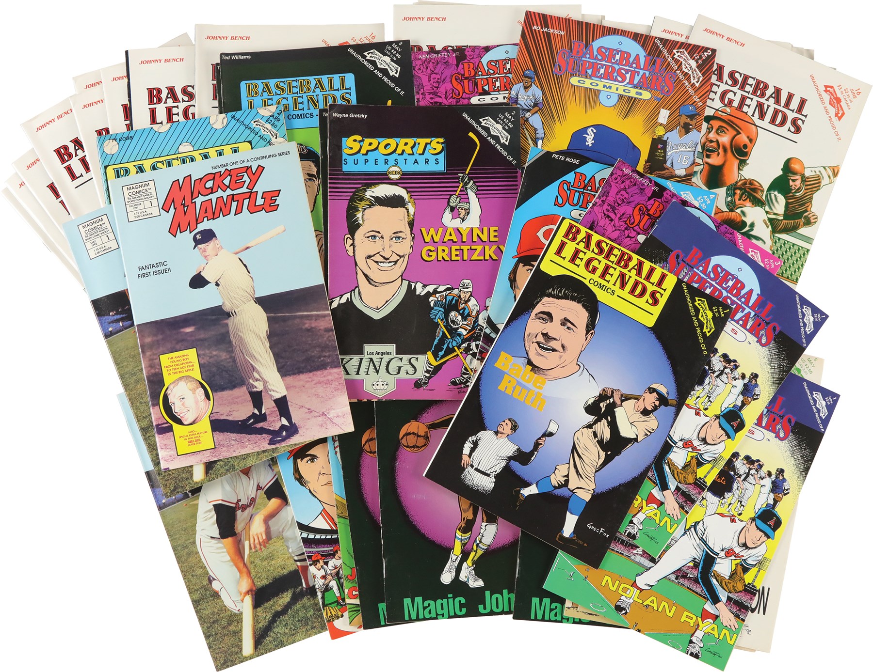 1990s multi-sport comic collection of (46) books. The collection includes: (2) Baseball Superstars #1 Nolan Ryan; (1) Baseball Superstars #2 Bo Jackson; (3) Baseball Superstars #3 Ken Griffey Jr.; (2) Baseball Superstars #4 Pete Rose; (3) Baseball Superstars #5 Rickey Henderson; (1) Baseball Superstars #6 Jose Canseco; (1) Baseball Legends #1 Babe Ruth; (1) Baseball Legends #2 Ty Cobb; (3) Baseball Legends #3 Ted Williams; (21) Baseball Legends #16 Johnny Bench; (1) Baseball's Greatest Heroes #1 Mickey Mantle; (4) Baseball's Greatest Heroes #2 Brooks Robinson; (1) Sports Superstars #2 Wayne Gretzky; (3) Sports Superstars #3 Magic Johnson. Overall, comics are in NM or better condition with a handful of the Bench comics being lesser condition.