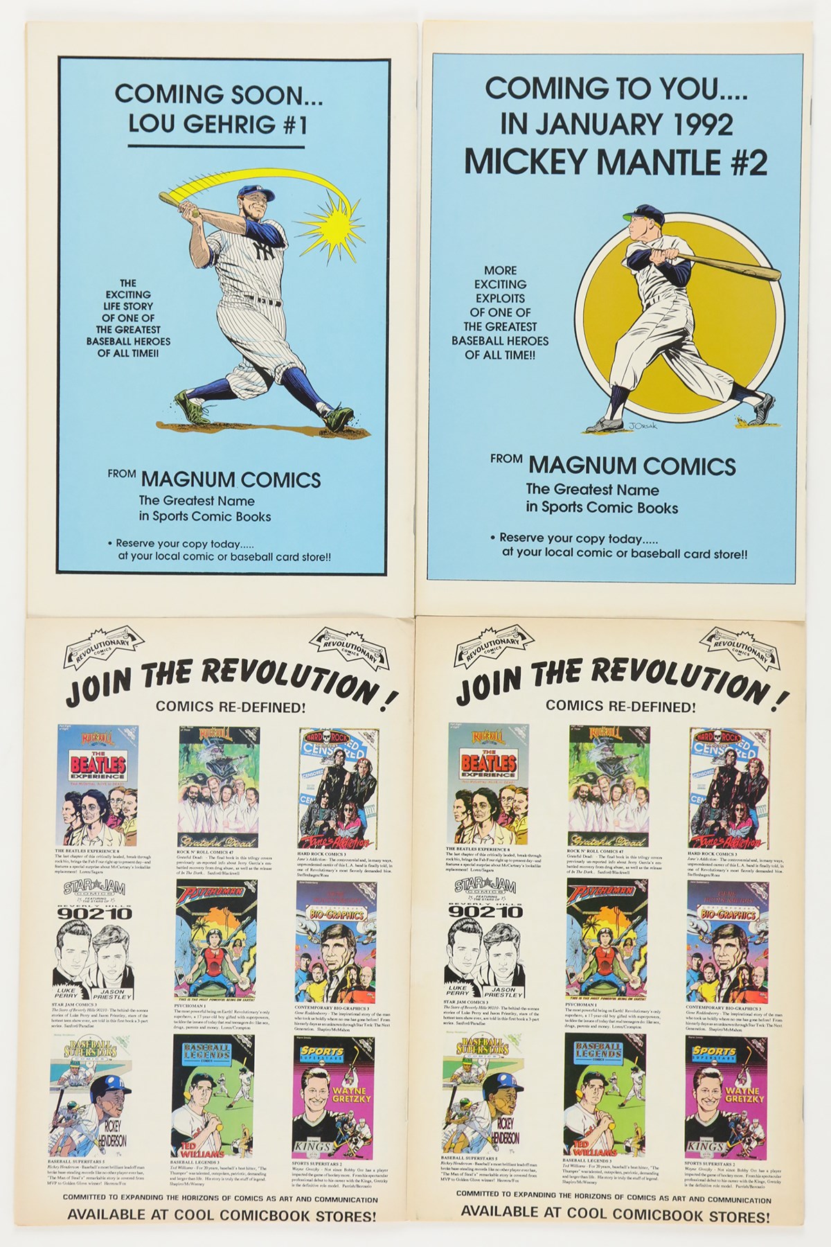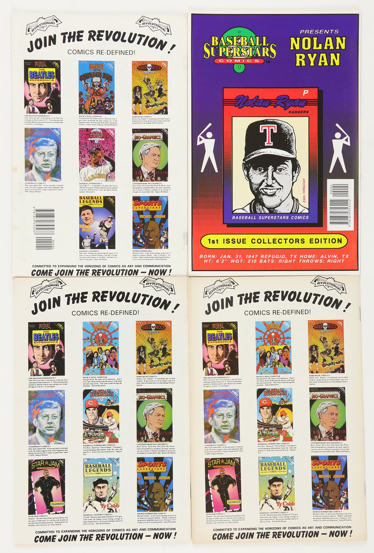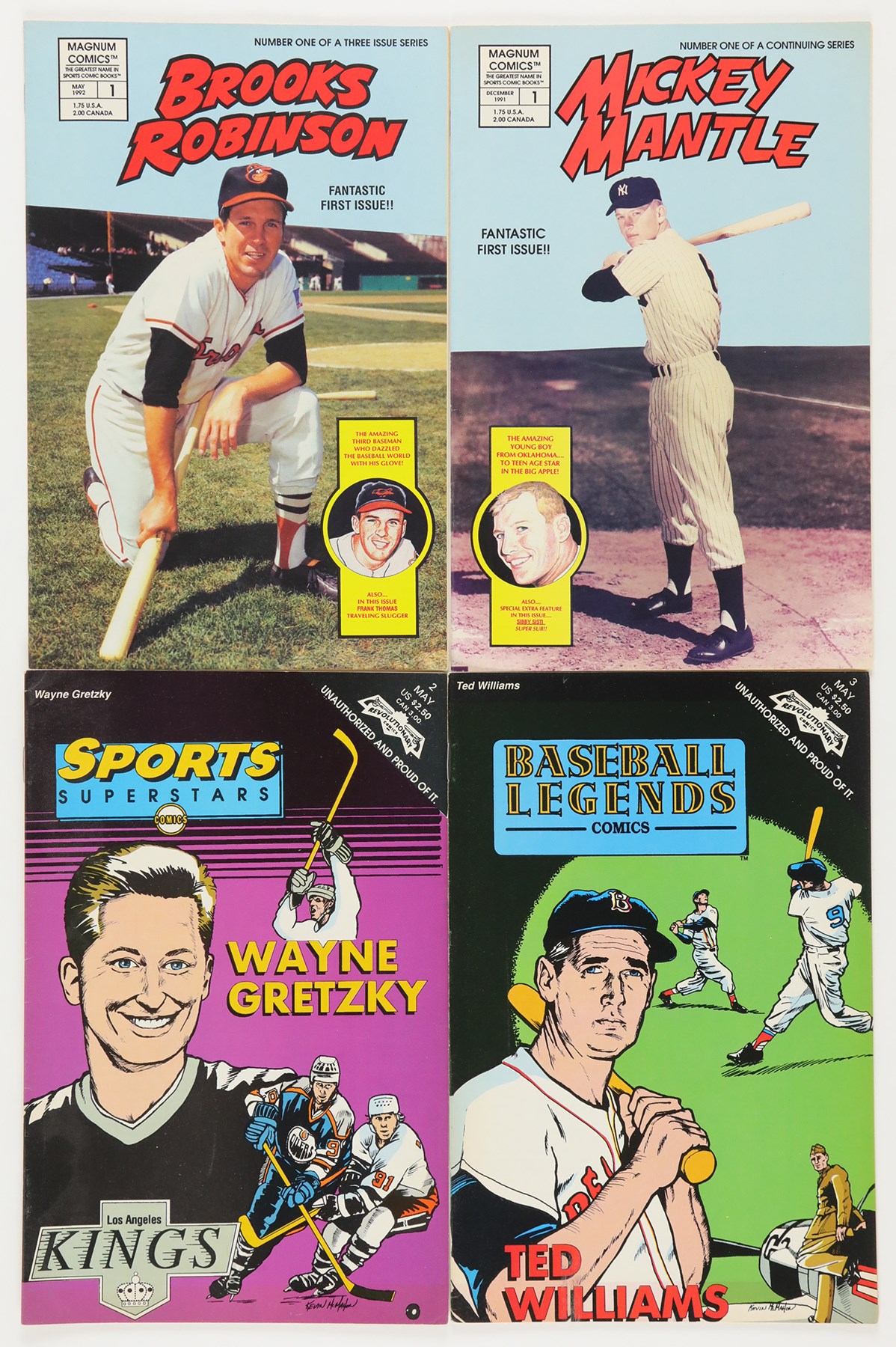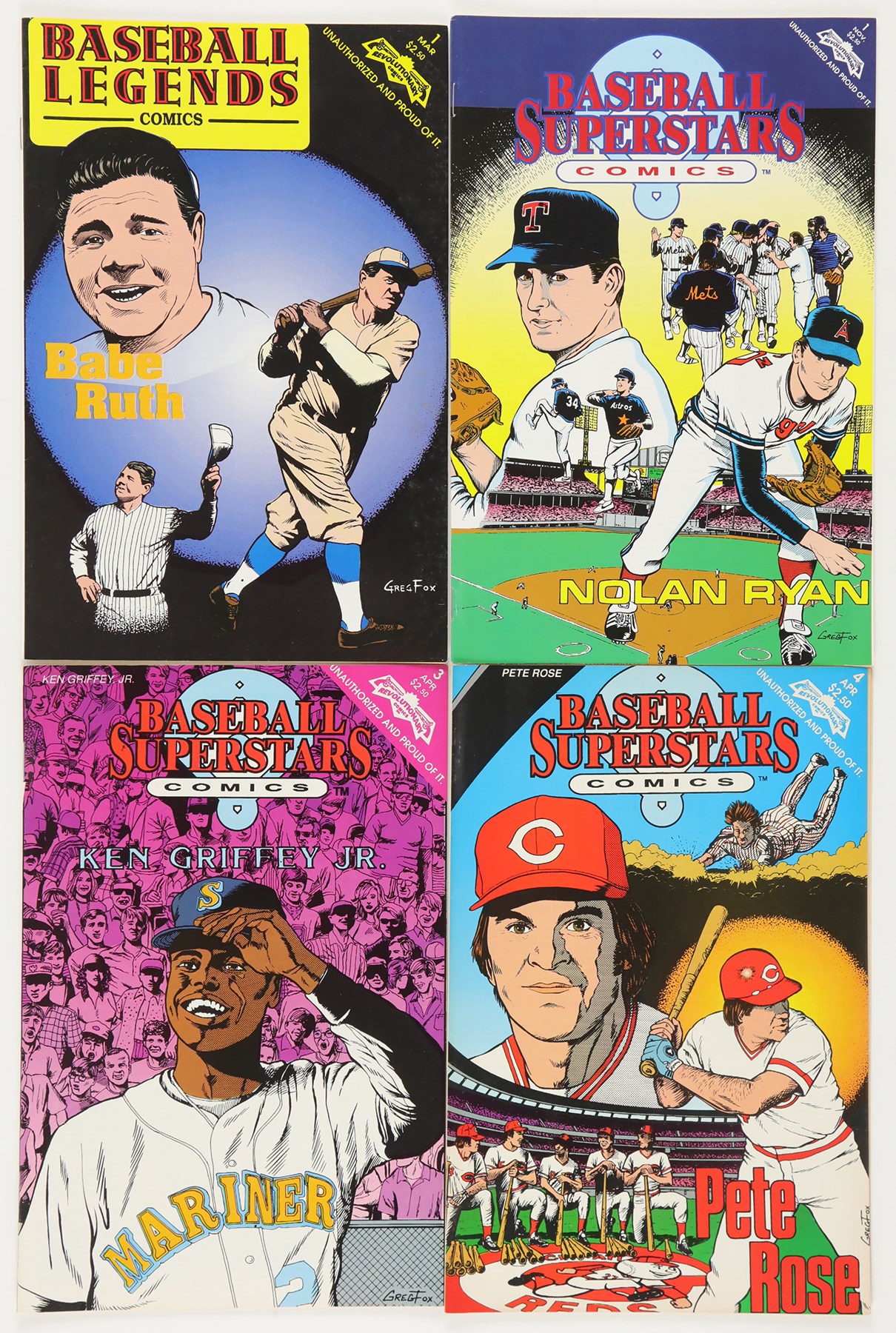 1990s multi-sport comic collection of (46) books. The collection includes: (2) Baseball Superstars #1 Nolan Ryan; (1) Baseball Superstars #2 Bo Jackson; (3) Baseball Superstars #3 Ken Griffey Jr.; (2) Baseball Superstars #4 Pete Rose; (3) Baseball Superstars #5 Rickey Henderson; (1) Baseball Superstars #6 Jose Canseco; (1) Baseball Legends #1 Babe Ruth; (1) Baseball Legends #2 Ty Cobb; (3) Baseball Legends #3 Ted Williams; (21) Baseball Legends #16 Johnny Bench; (1) Baseball's Greatest Heroes #1 Mickey Mantle; (4) Baseball's Greatest Heroes #2 Brooks Robinson; (1) Sports Superstars #2 Wayne Gretzky; (3) Sports Superstars #3 Magic Johnson. Overall, comics are in NM or better condition with a handful of the Bench comics being lesser condition.