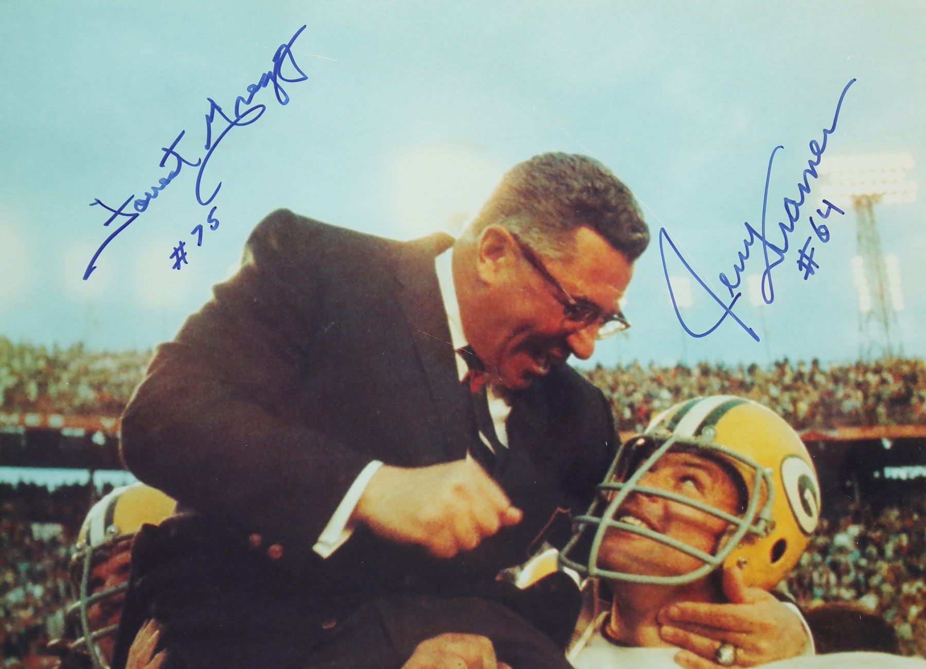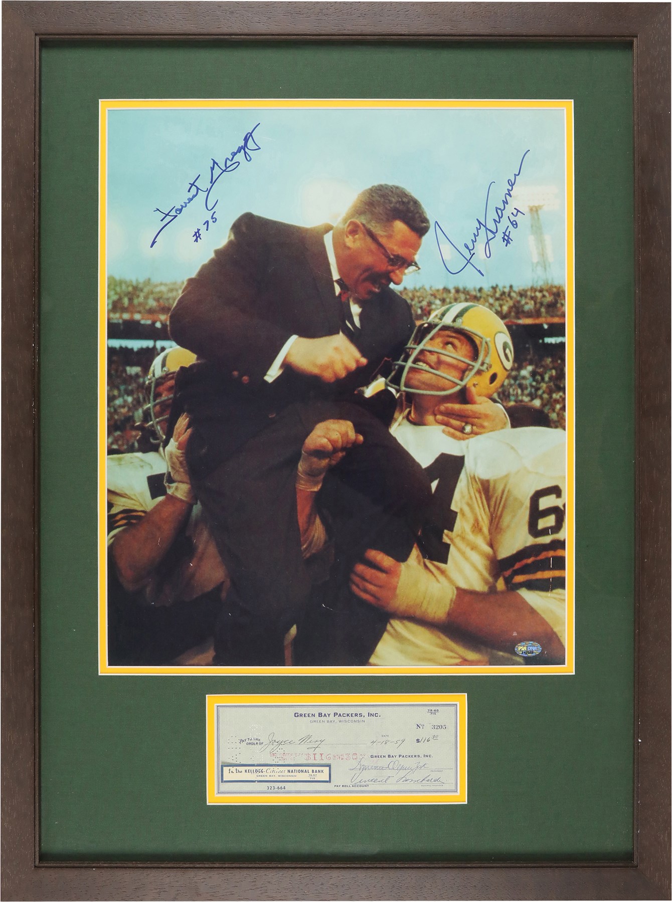 Presented is the iconic January 14, 1968, Super Bowl II multi-signed photo display of legendary Green Bay Packers' coach Vince Lombardi, just after the Super Bowl II triumph, being carried off the Orange Bowl field in Miami, Florida, by two other Green Bay Packers' legends, Gerry Kramer and Forrest Gregg. Pro football Hall of Fame offensive linemen Kramer and Gregg both signed the photo and inscribed their uniform number. Lombardi did not sign the offering, but his signed bank check is included at the bottom of the display.
