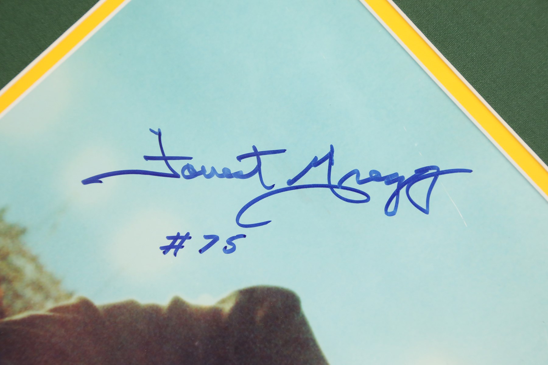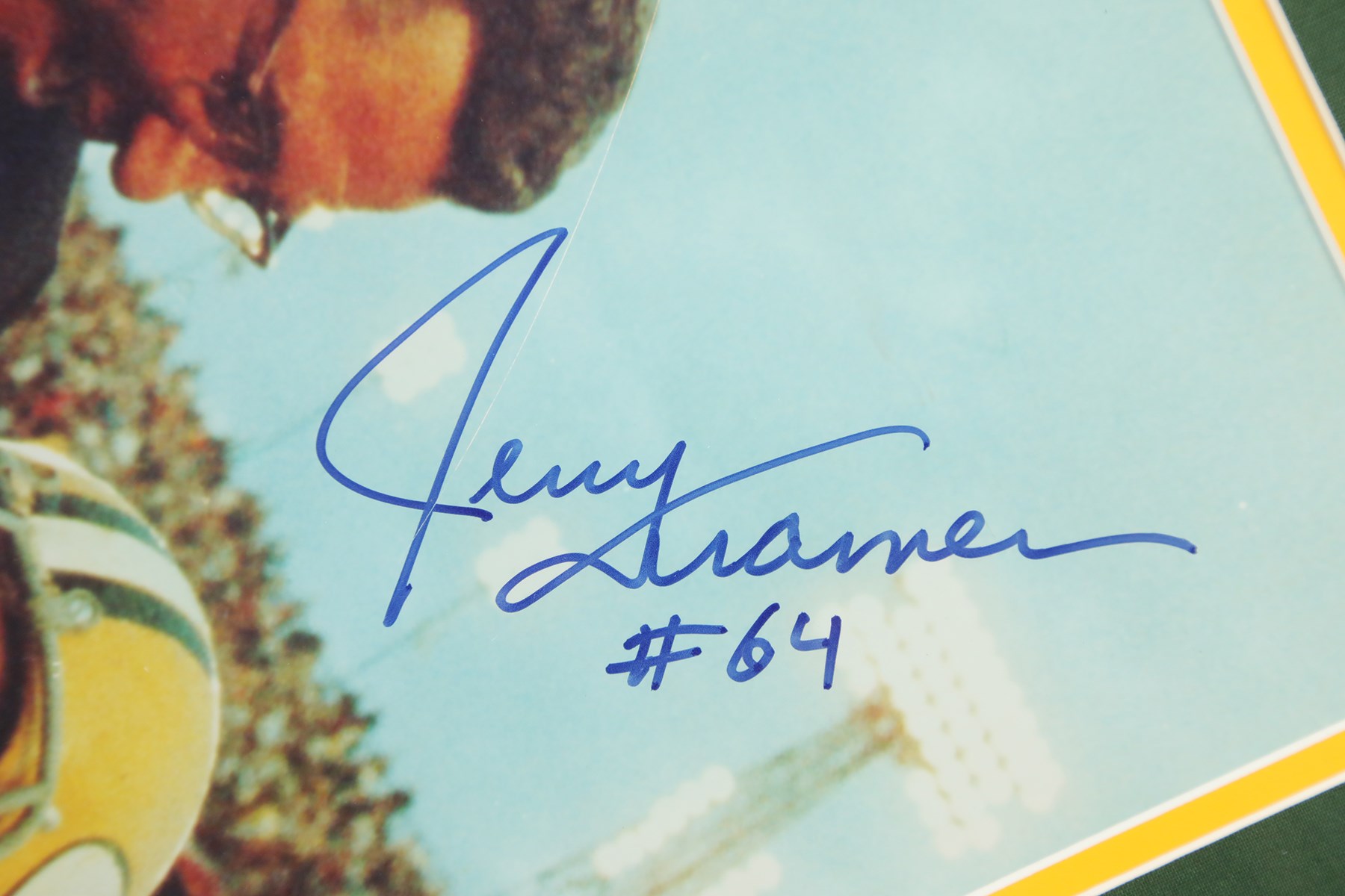 Gerry Kramer signed the check in blue, fine-tip marker, adding "#75". Forrest Gregg also signed the check in fine-tip blue marker, adding his uniform number "64". Both signatures are big and bold, and neatly scripted. Lombardi's signature on the check is in neatly written in blue ink. The offering comes with a PSA/DNA COA for the signatures of Kramer and Gregg (Cert. Number J 42546). The display weighs eight (8) lbs. The multi-signed display is in EXCELLENT condition.