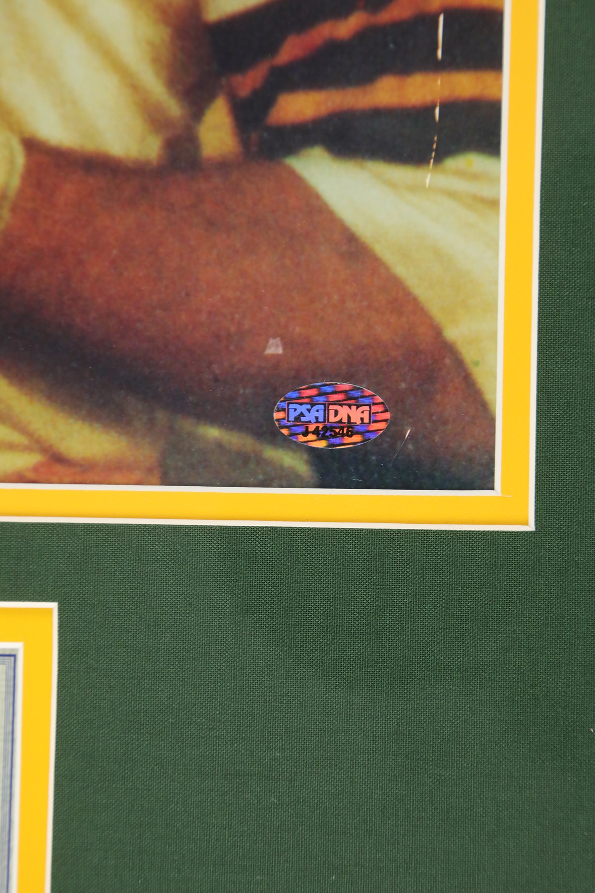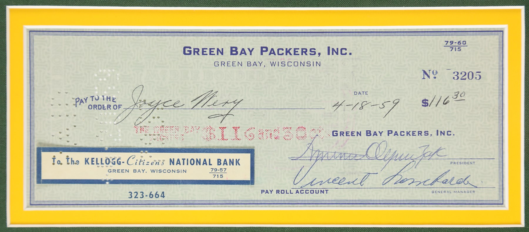 Super Bowl II had the Packers defeated the Oakland Raiders by 33-14. The Packers had touchdowns by Donny Anderson, Boyd Dowler, and Herb Adderly and four field goals by Don Chandler. The color photo was taken by Neil Liefer of Sports Illustrated via Getty Images, and the photo was on the cover of Sports Illustrated in its January 22, 1968, issue. The signed photograph measures approx. 15.5x19.2", matted and framed to 22.75x30.75". The Lombardi signed check measures 3x8". It is a "Green Bay Packers" check, as is machine printed on the top of the check. The check is dated "4-18-59", in the amount of $16.30. The check is written on the Kellog-Citizens National Bank of Green Bay. On the lower left side of the check, a raised piece of cut paper, apparently affixed to the check at a later point in times, reads, "Kellog-Citizens Bank, Green Bay, Wisconsin. The foregoing affixed section is most likely because the previous bank changed ownership, and the new bank name was affixed over the bank's previous name.