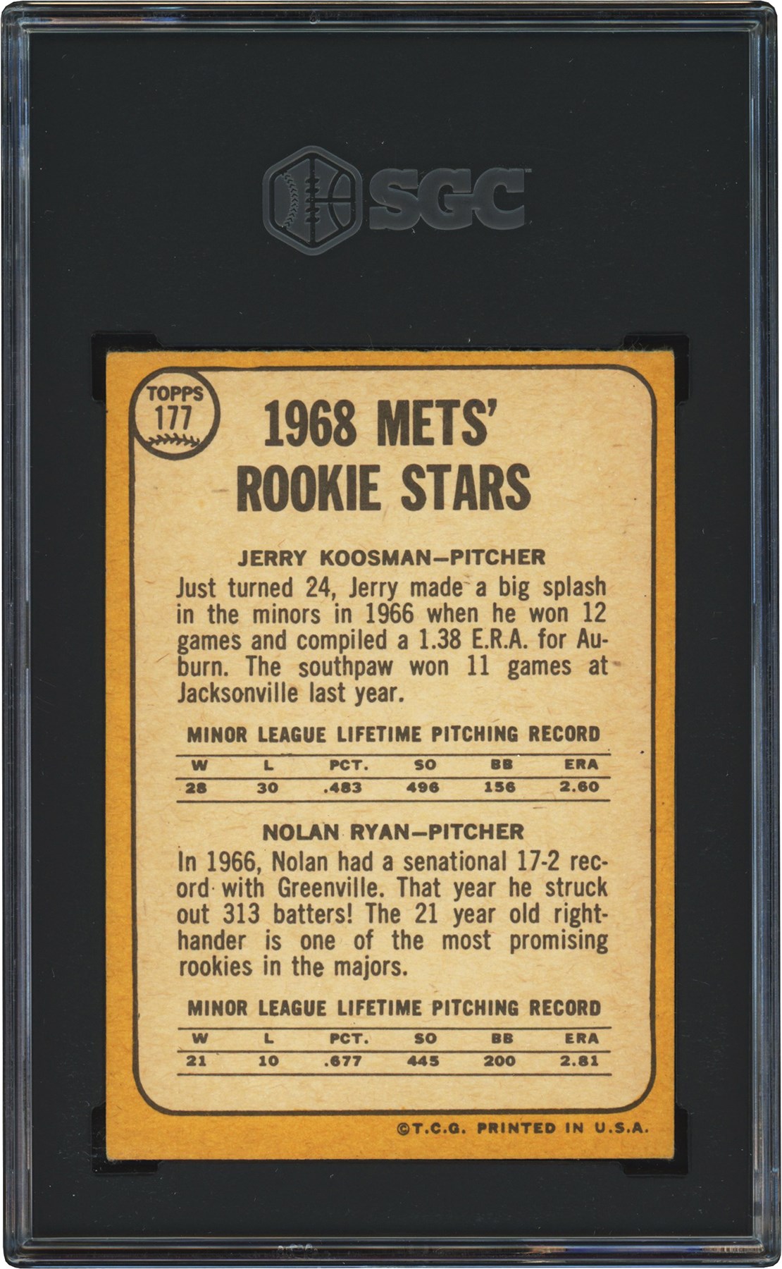 1968 Topps Baseball 177 Nolan Ryan (R) card. The card has been graded and encapsulated by SGC VG-EX+ 4.5. It has a dual color head shot image of Koosman and Ryan with blue sky backgrounds. The burlap borders are bright while the edges have very light roughness. Centering is off left to right and top to bottom. Al four corners exhibit light wear. The reverse appears clean.