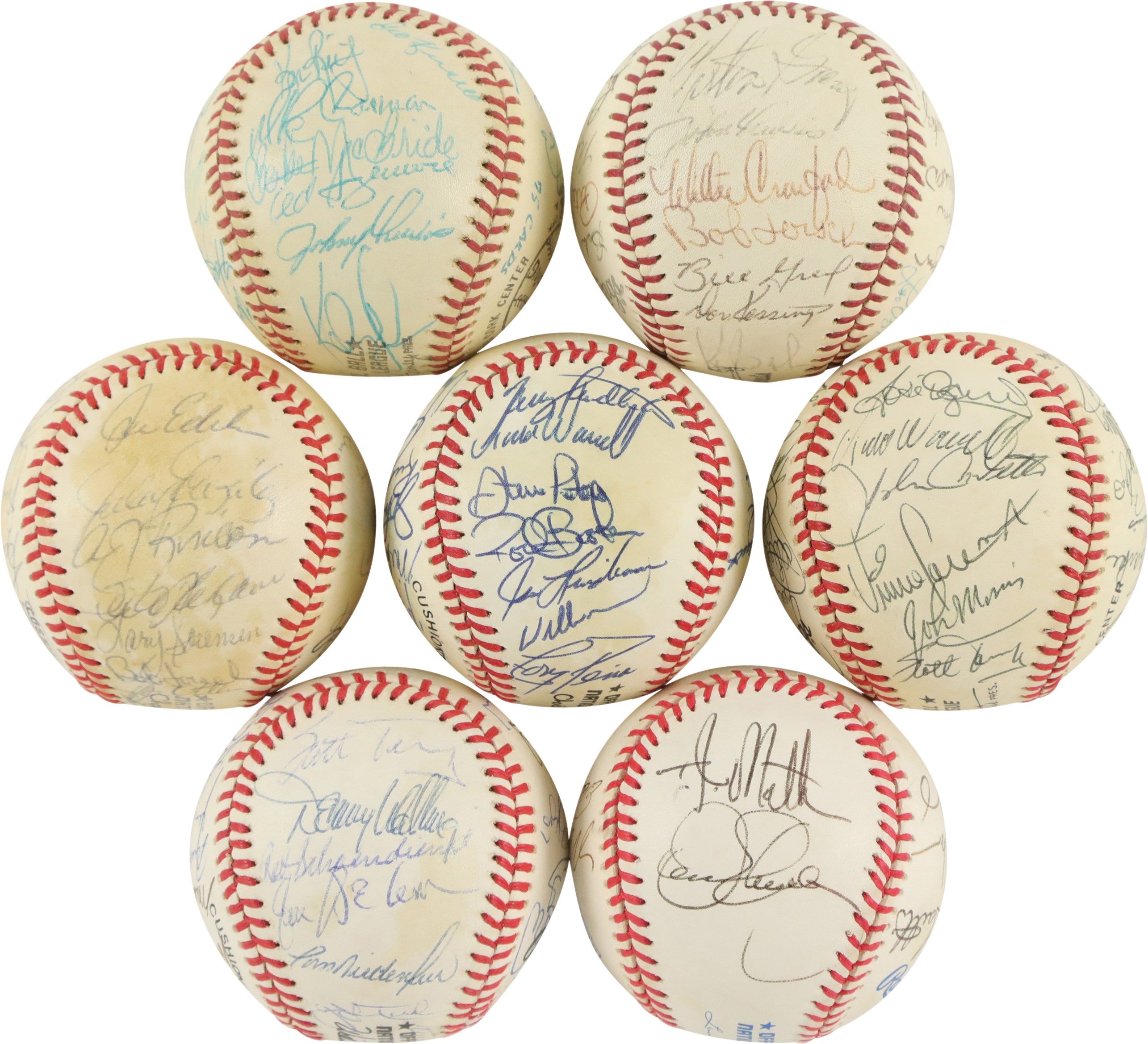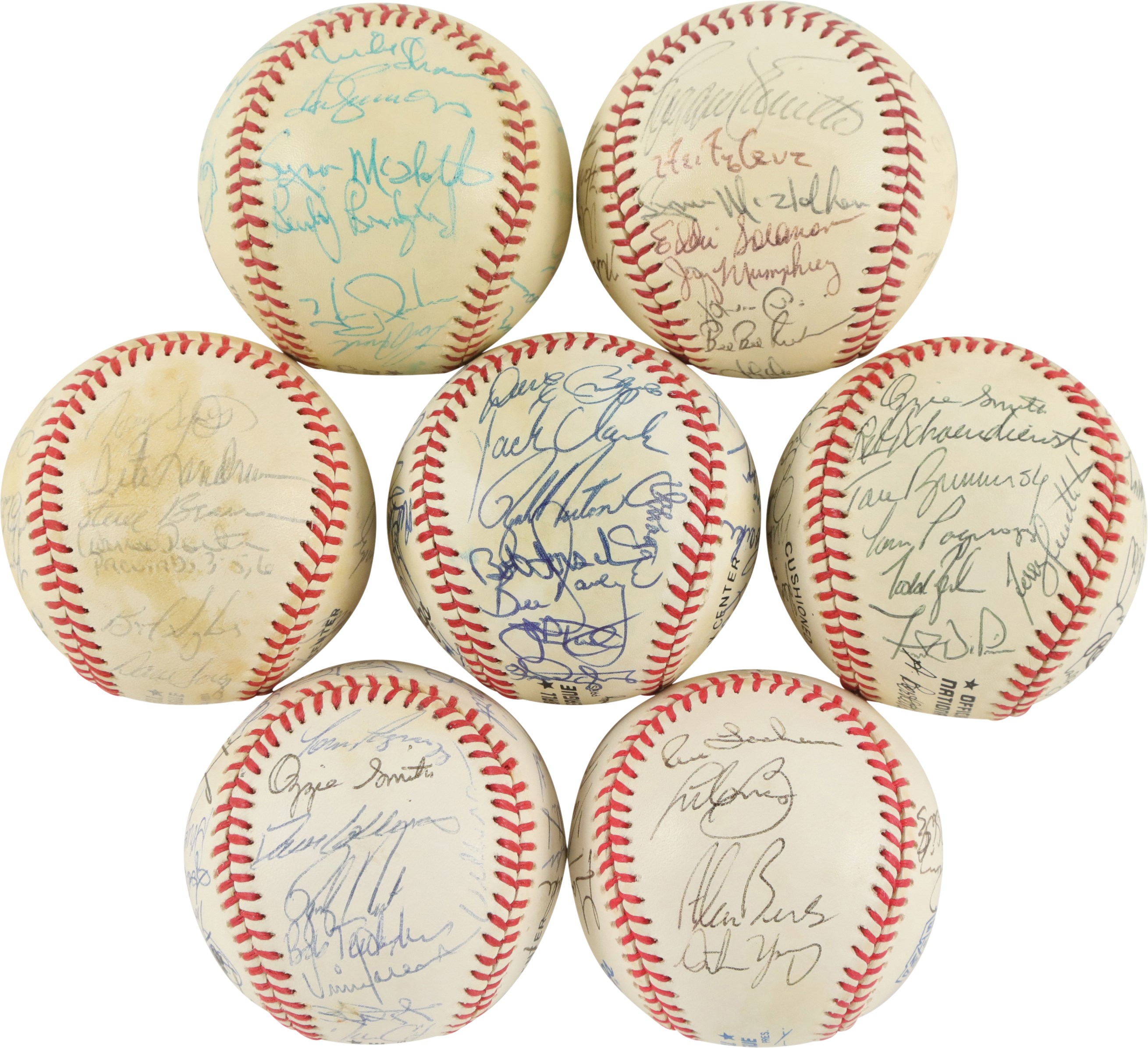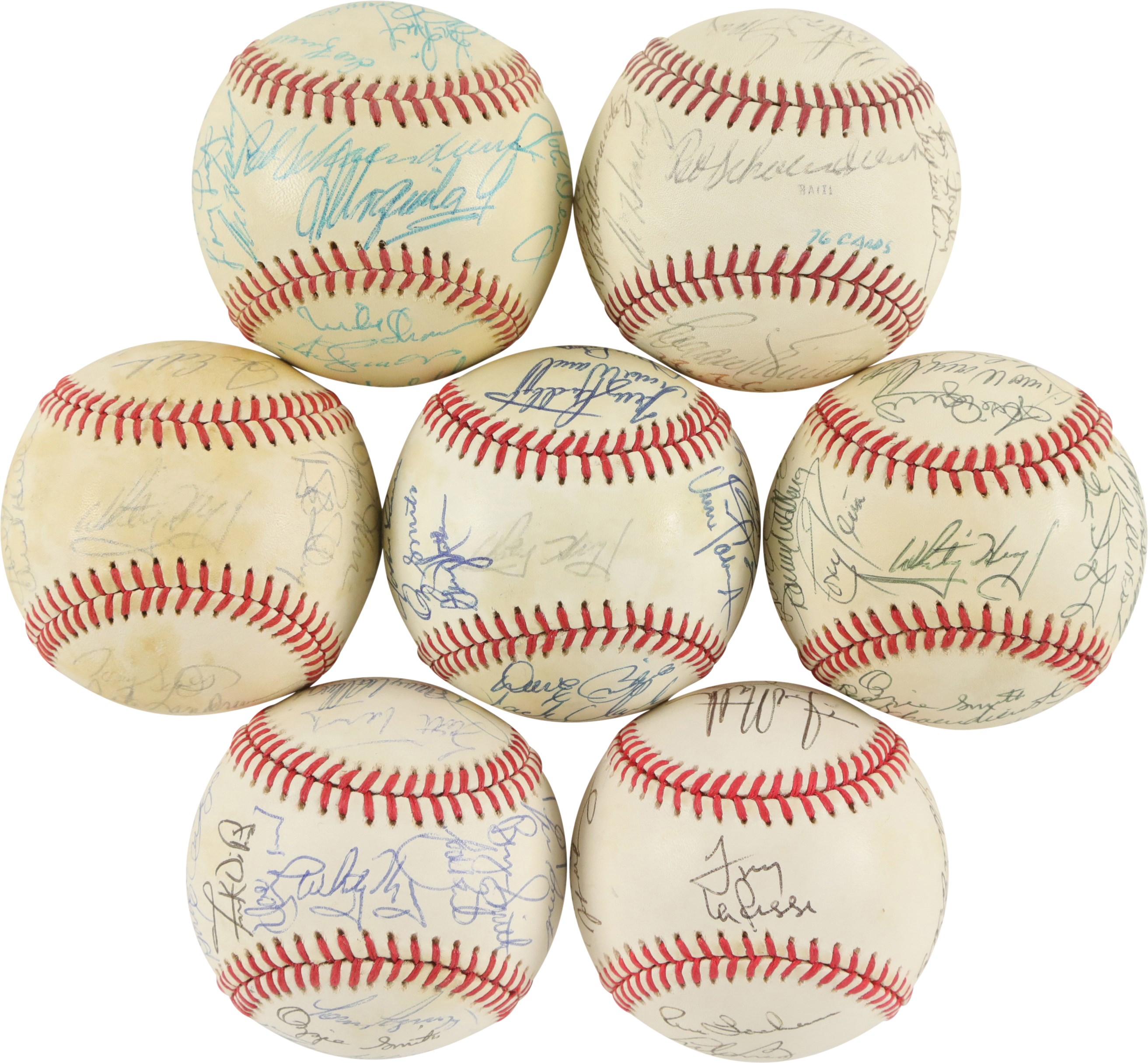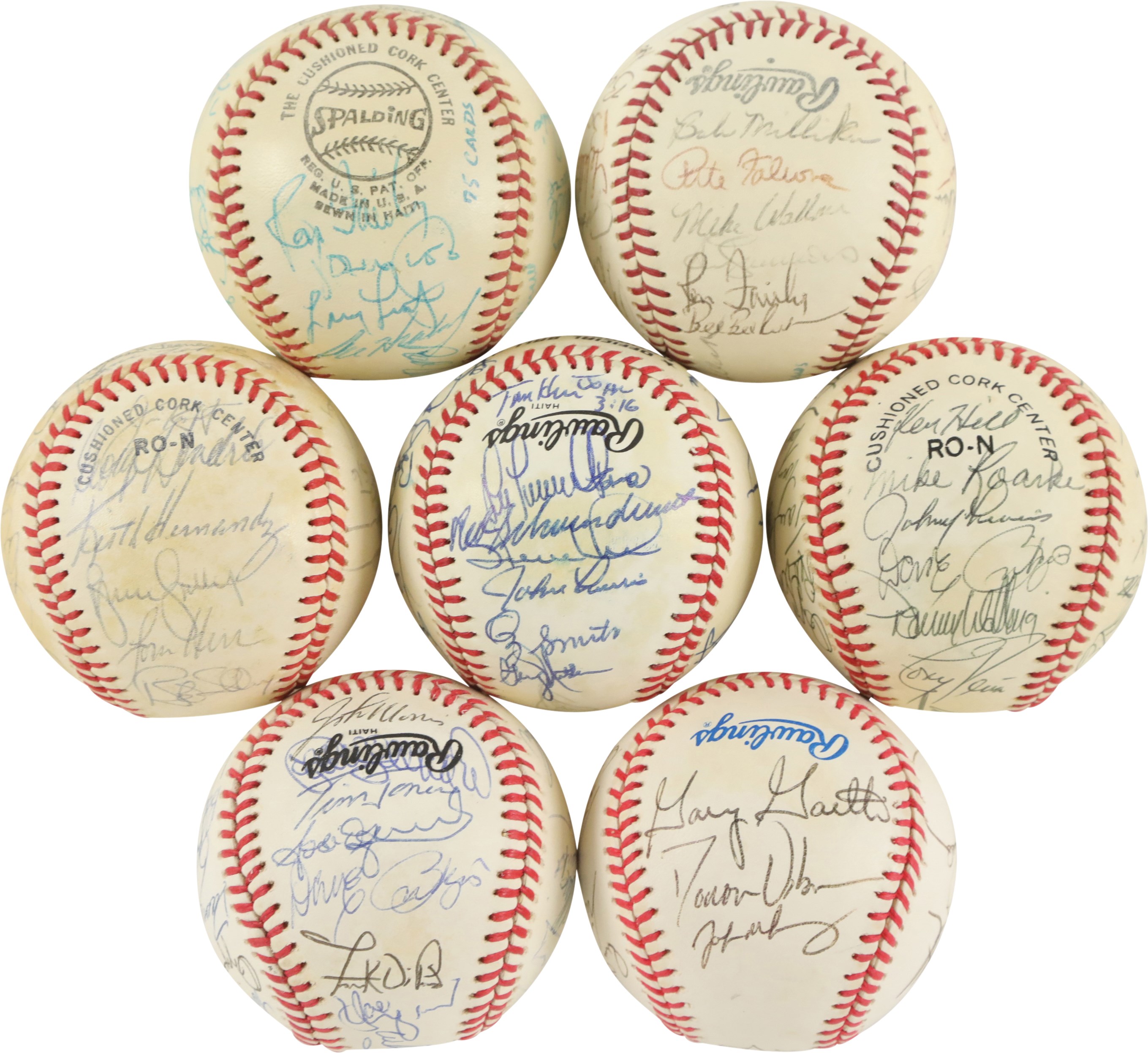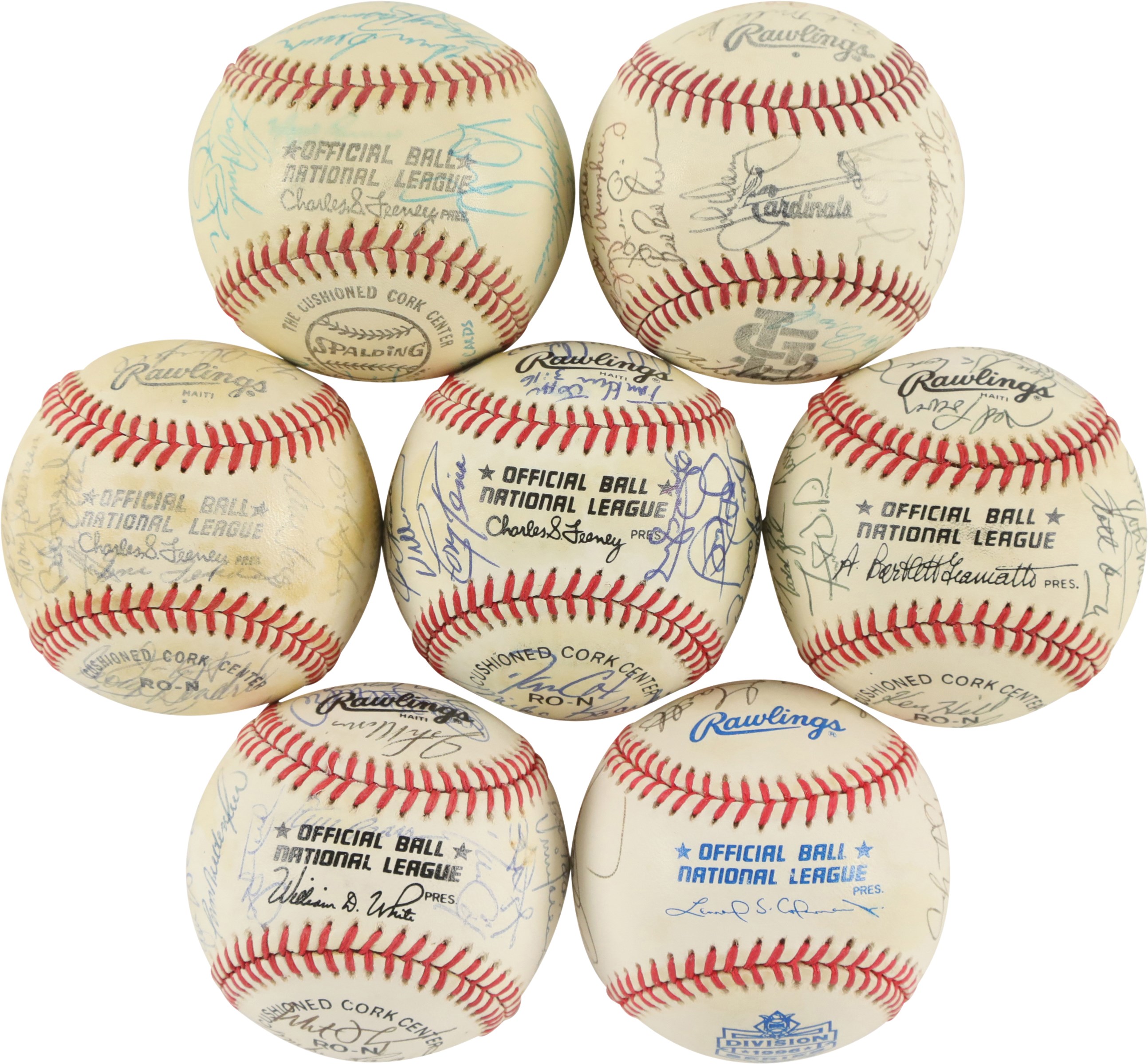 Three decades are represented in this lot of 7 St. Louis Cardinals team signed baseballs, including balls signed by the 1975, 1976, 1981, 1986, 1989, 1990, and 1996 teams. The 1975, 1981, and 1986 teams signed an Official National League (Feeney) ball. The 1976 team signed a Rawlings St. Louis Cardinals logo ball. The 1989 team signed an Official National League (Giamatti) ball, and the 1990 team signed an Official National League (White) ball. Finally, the 1996 team signed an Official National League Division Series ball.