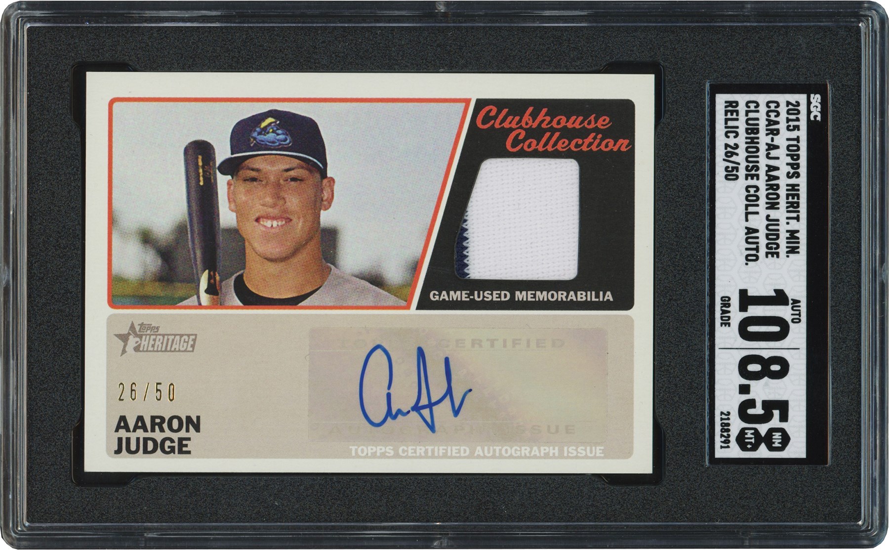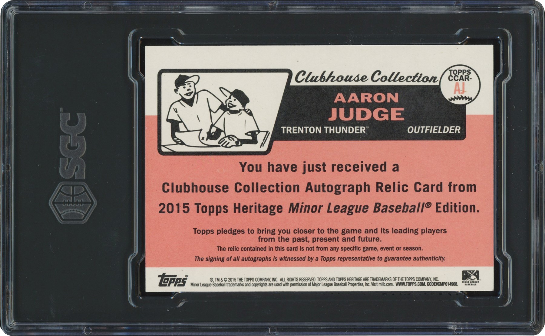 2015 Topps Heritage Minors Clubhouse Collection Autograph CCAR-AJ Aaron Judge Autograph Relic card.  The card has been graded and encapsulated by SGC NM-MT+ 8.5 with an Auto grade of 10.  The autograph was done in blue Sharpie upon a sticker beneath a white jersey swatch.  The card itself has four sharp corners with crisp edges and near perfect centering.  It is #26/50.  The reverse is clean and bright.
