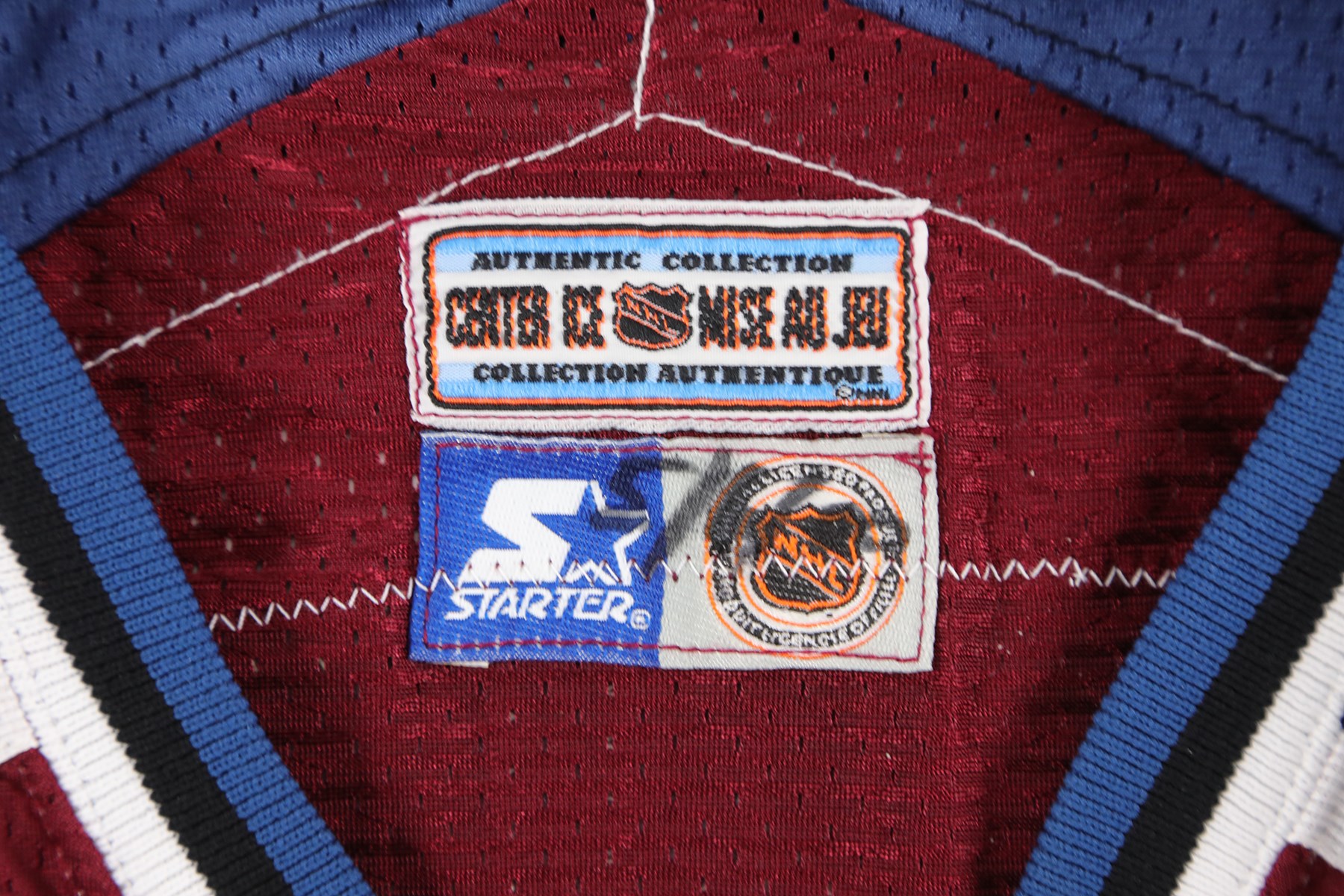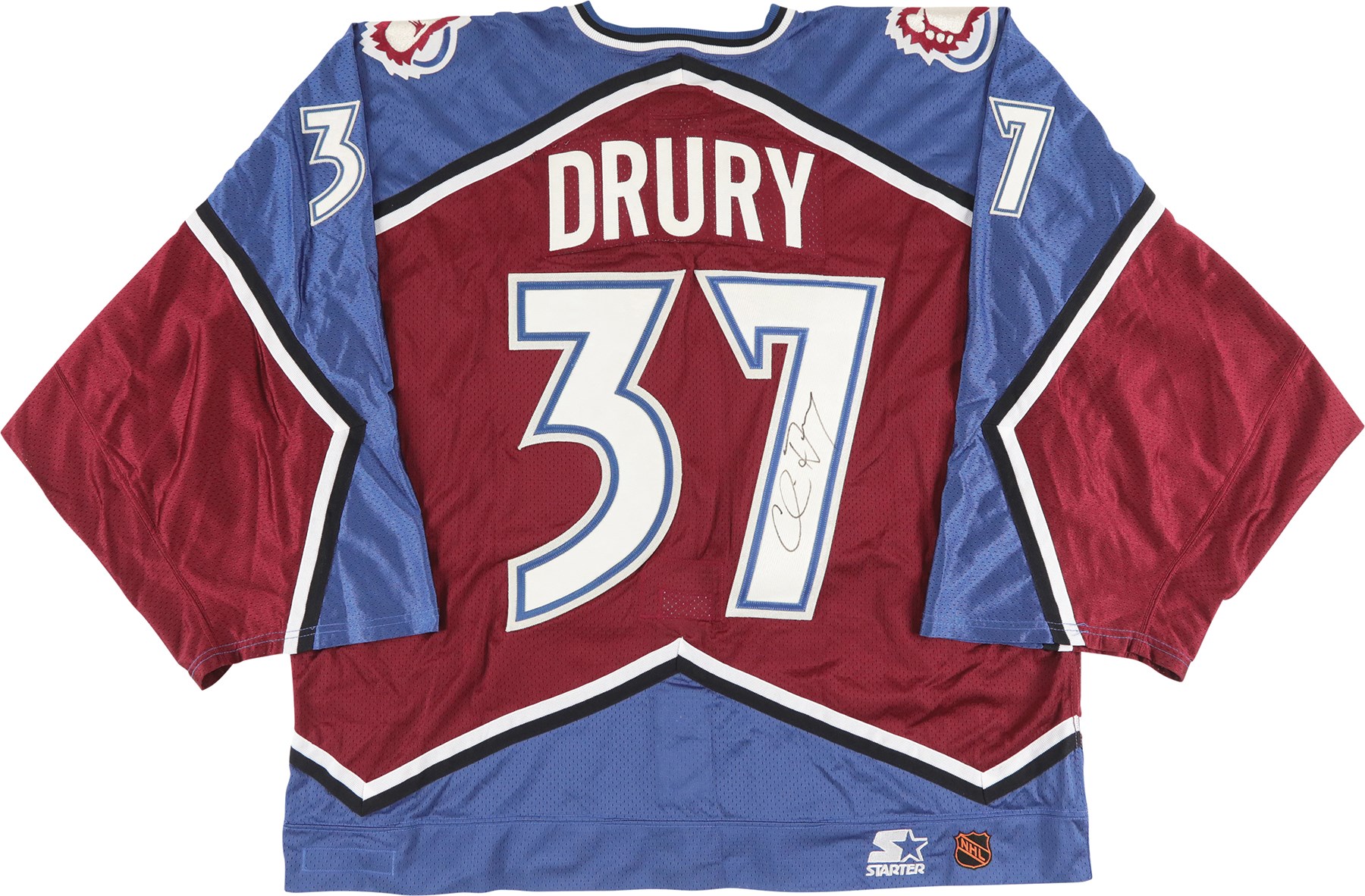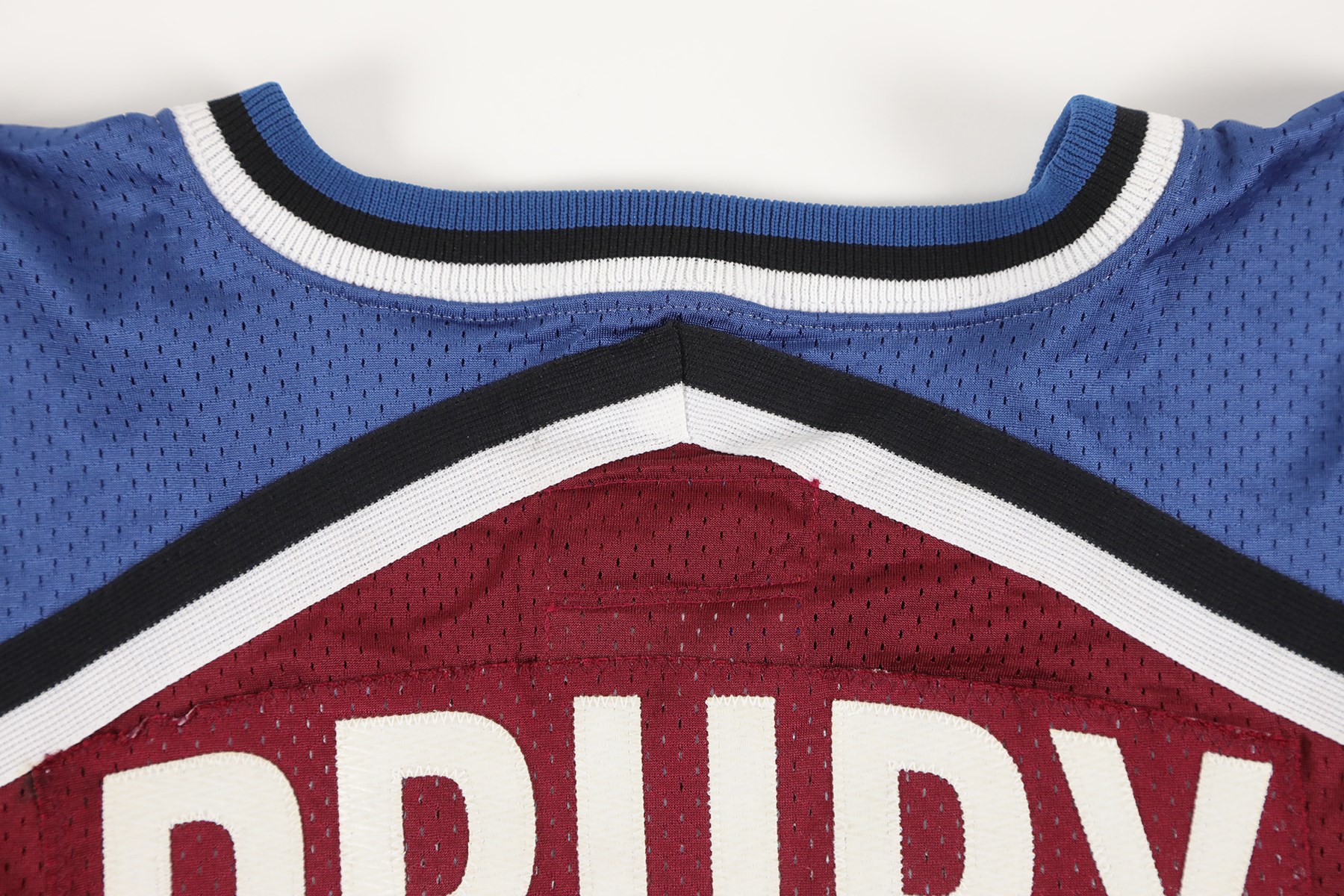 1998-99 Chris Drury Colorado Avalanche signed rookie game jersey. A Center Ice patch is sewn to the inside neck area of the jersey. Below that is a patch with the Starter and NHL logos. There is handwriting on that tag that appears to be a date. However, we cannot decipher what is written. A patch is sewn into the inside back tail that reads, “58G - 1LS11.” Drury signed the back of the jersey on the "7" in "37". A Starter patch and NHL patch are sewn to the bottom back area of the jersey. Drury played for the Avalanche from 1998 to 2002. He wore number 37 for three seasons while playing for the Avalanche, 1998-99, 1999-00, and 2000-01. This jersey could not have been from 1999-00 or 2000-01 since the team wore special patches on the front breast of their uniforms for both years. It also could not have been from after April 20, 1999 as the Avalanche wore a Columbine High School memorial patch.