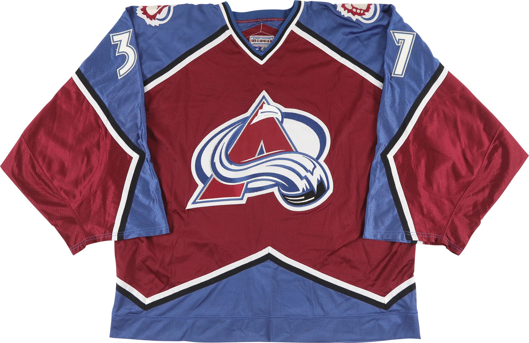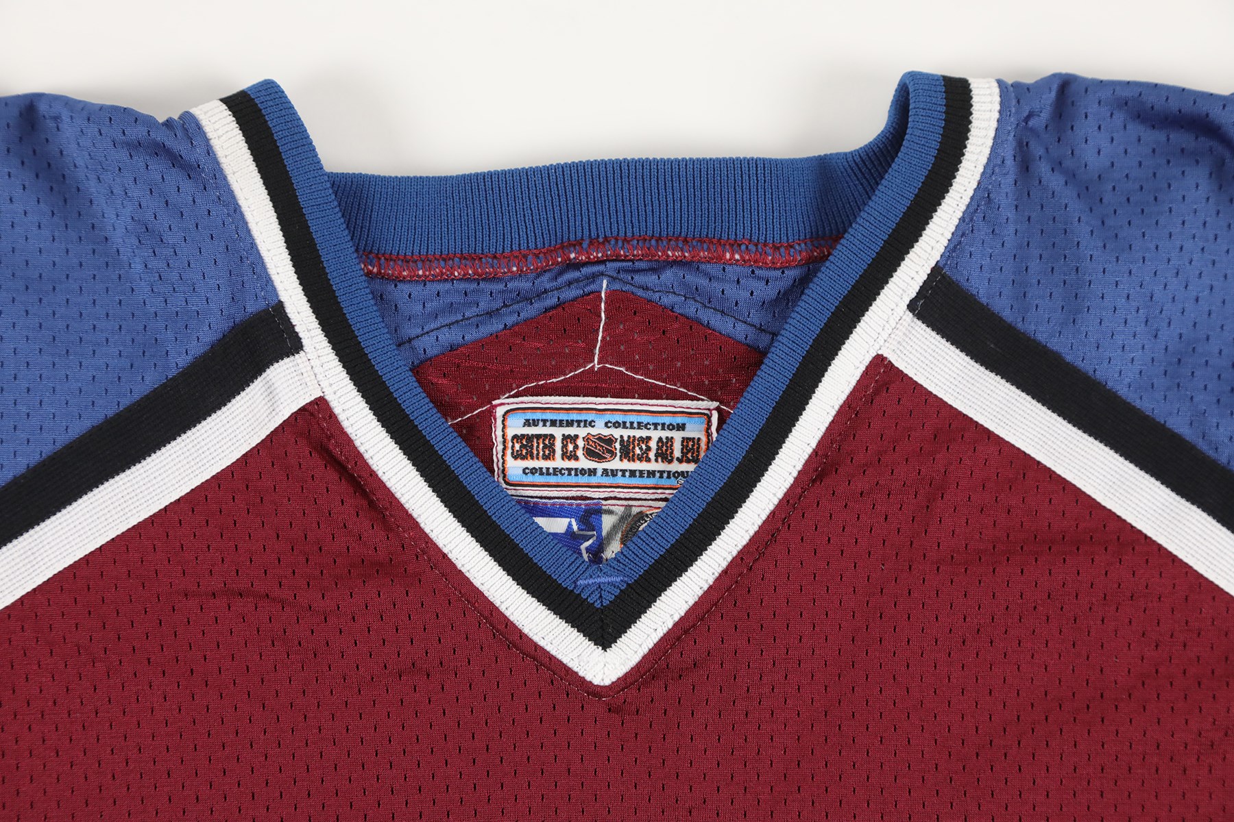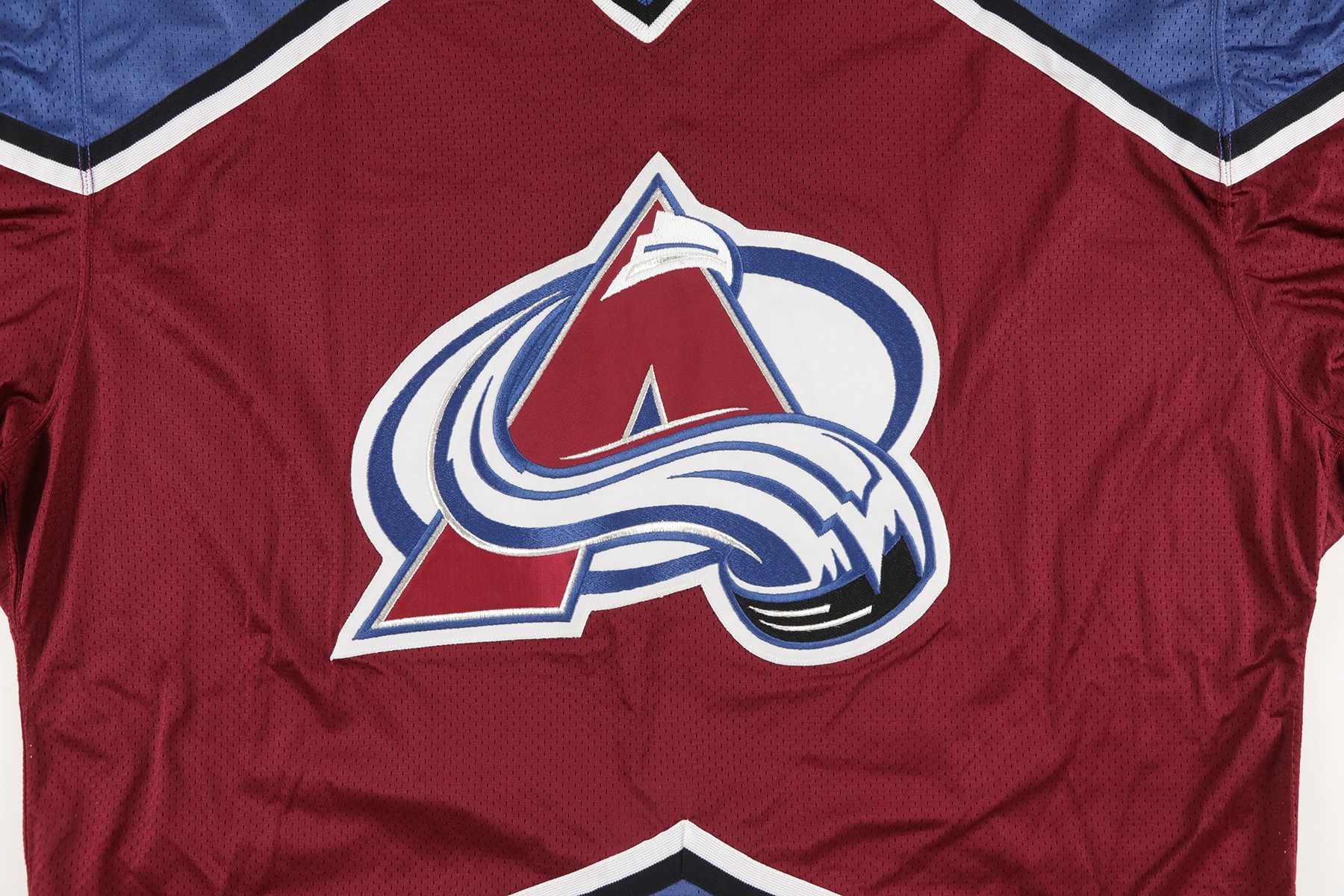 1998-99 Chris Drury Colorado Avalanche signed rookie game jersey. A Center Ice patch is sewn to the inside neck area of the jersey. Below that is a patch with the Starter and NHL logos. There is handwriting on that tag that appears to be a date. However, we cannot decipher what is written. A patch is sewn into the inside back tail that reads, “58G - 1LS11.” Drury signed the back of the jersey on the "7" in "37". A Starter patch and NHL patch are sewn to the bottom back area of the jersey. Drury played for the Avalanche from 1998 to 2002. He wore number 37 for three seasons while playing for the Avalanche, 1998-99, 1999-00, and 2000-01. This jersey could not have been from 1999-00 or 2000-01 since the team wore special patches on the front breast of their uniforms for both years. It also could not have been from after April 20, 1999 as the Avalanche wore a Columbine High School memorial patch.