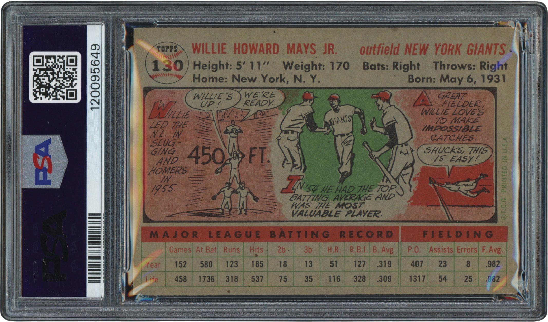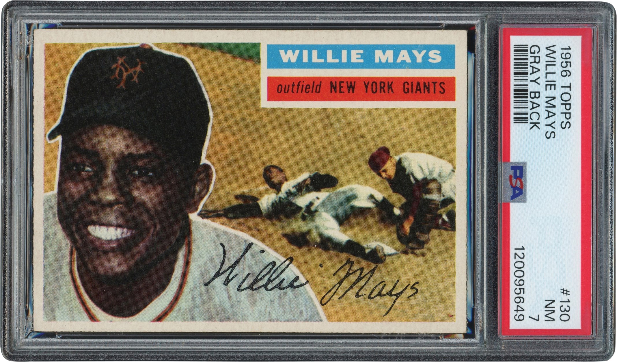 1956 Topps Baseball 130 Willie Mays-Gray Back card. The card has been graded and encapsulated by PSA NM 7. It has a colorful dual image of Mays with a small inset image of Mays sliding into home. The borders remain white while the edges appear crisp. Centering is slightly off top to bottom. The top left corner has a very light touch while the remaining corners are sharp. The reverse is clean and bright.