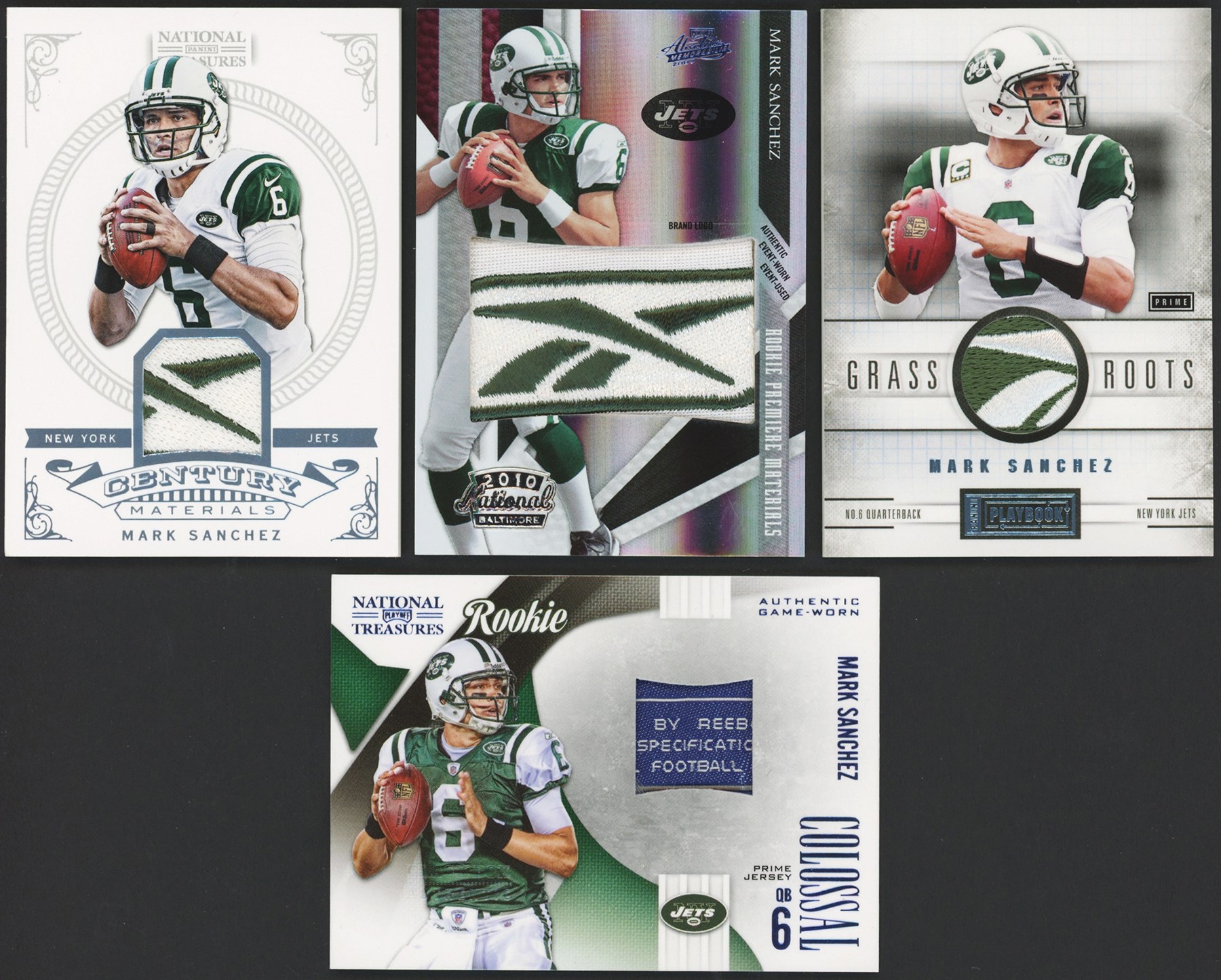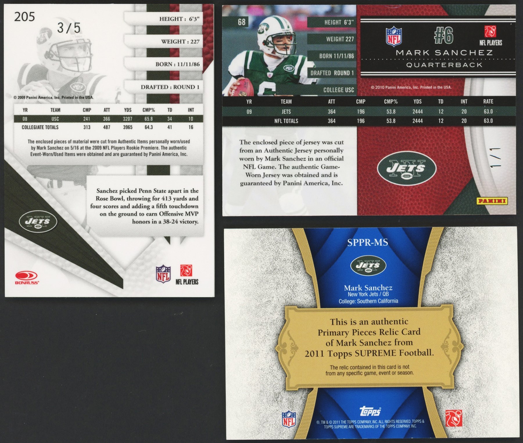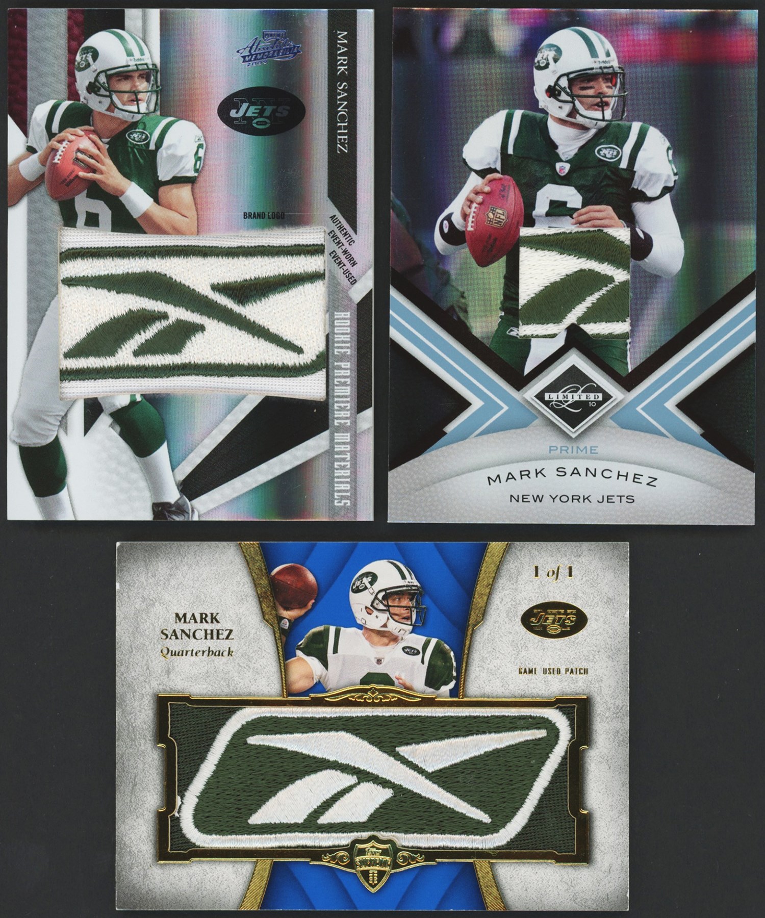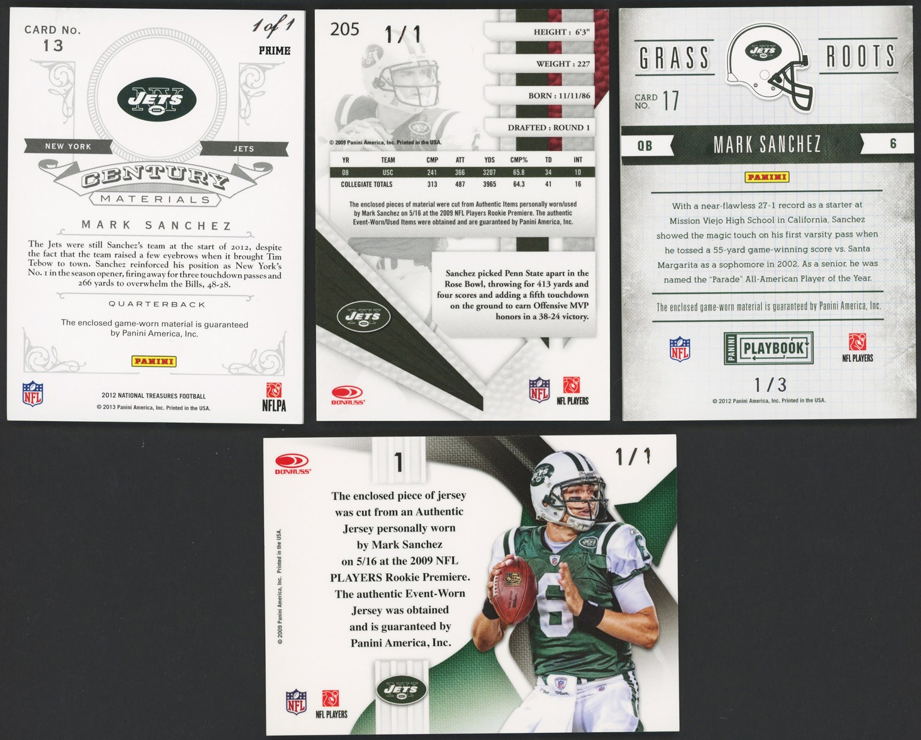 This lot features a collection of (7) 2009-2012 Mark Sanchez Special Jersey Relic cards including 1/1s, Brand Logo Tags, and Laundry Tags. Highlights include: 2009 Panini Absolute #205 Mark Sanchez Rookie Premier Materials Reebok Logo #1/1; 2009 Panini Absolute #205 Mark Sanchez Rookie Premier Materials Reebok Logo #3/5; 2009 Panini National Treasures #1 Mark Sanchez Rookie Colossal Laundry Tag Relic #1/1; 2010 Panini Limited #68 Mark Sanchez Prime Relic #1/1; 2011 Topps Supreme #SPPR-MS Mark Sanchez Primary Pieces Relic #1/1; 2012 Panini National Treasures #17 Mark Sanchez Grass Roots Relic #1/3; and 2012 Panini National Treasures #13 Mark Sanchez Century Materials #1/1