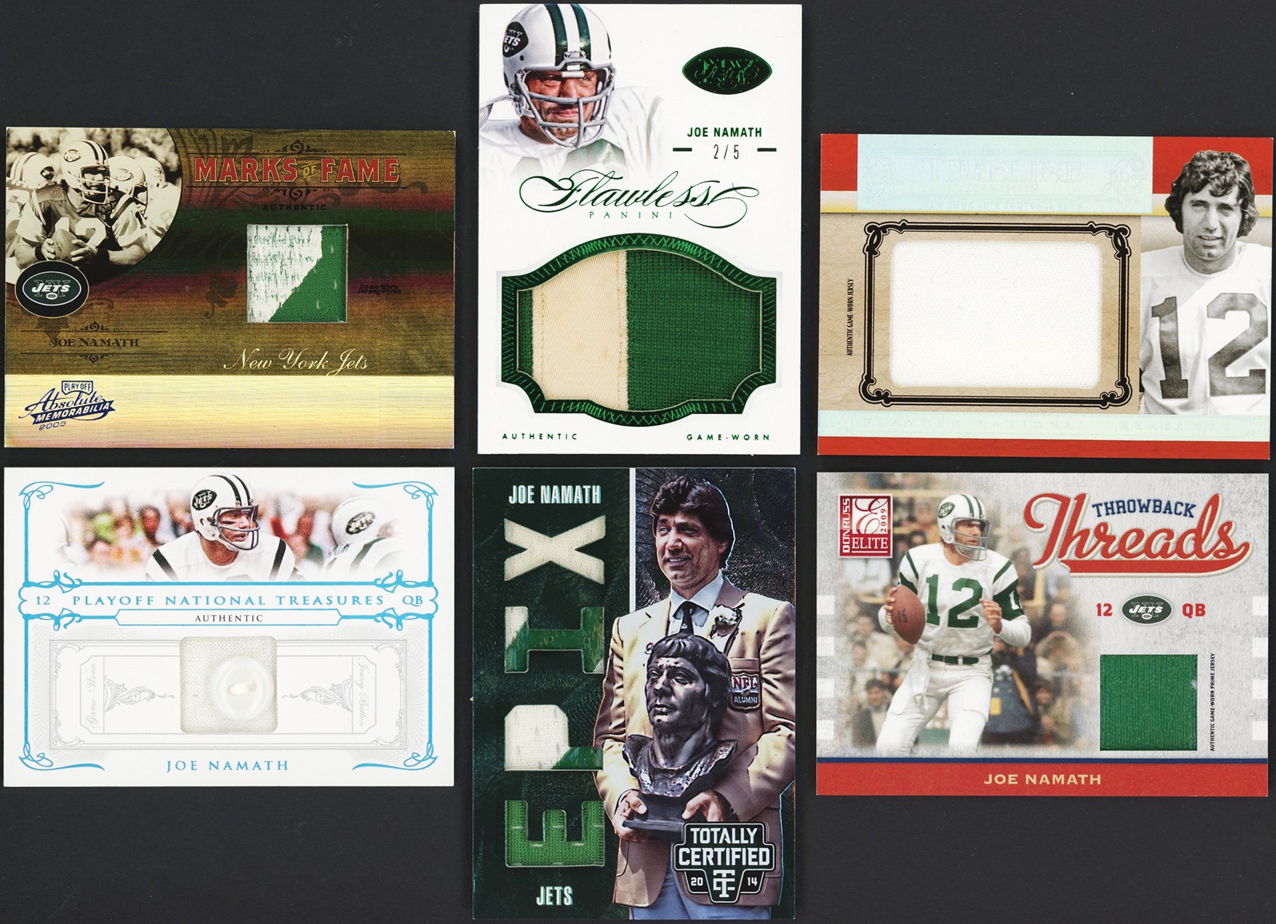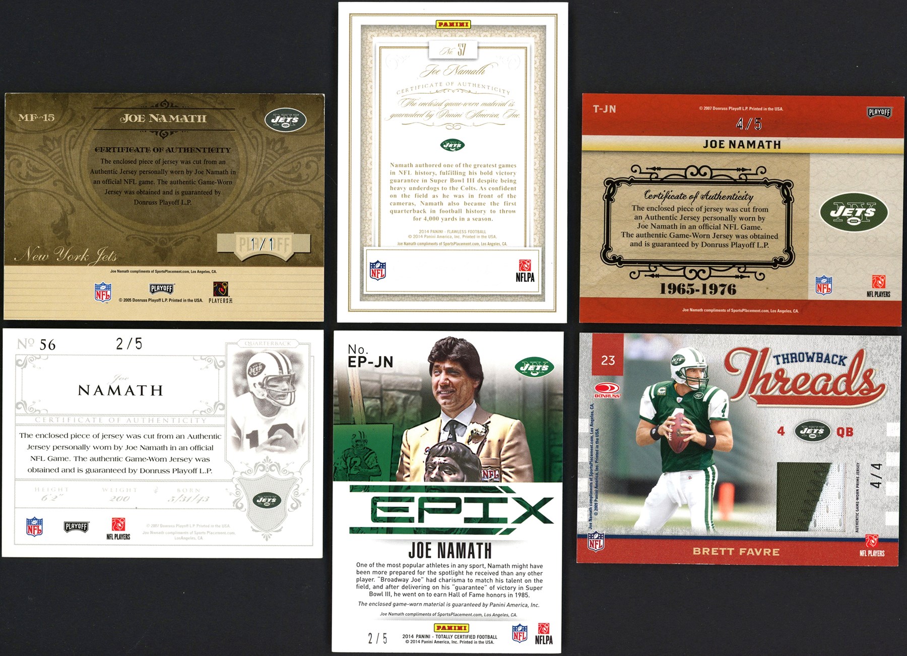 This lot features a collection of (6) 2005-2014 Joe Namath Game Used Relic Cards. All cards are serial numbered #/5 or less including: 2005 Donruss Playoff #MF-15 Joe Namath Marks Of Fame Jersey Relic #1/1; 2007 Donruss Playoff #56 Joe Namath Authentic Jersey Button Relic #2/5; 2007 Donruss Playoff #T-JN Joe Namath Timeline Jersey Relic #4/5; 2009 Panini Donruss Elite #23 Joe Namath/Brett Favre Throwback Threads Dual Relic #4/4; 2014 Panini Totally Certified #EP-JN Joe Namath Epix Jersey Relic #2/5; and 2014 Panini Flawless #37 Joe Namath Authentic Game Worn Jersey Relic #2/5.