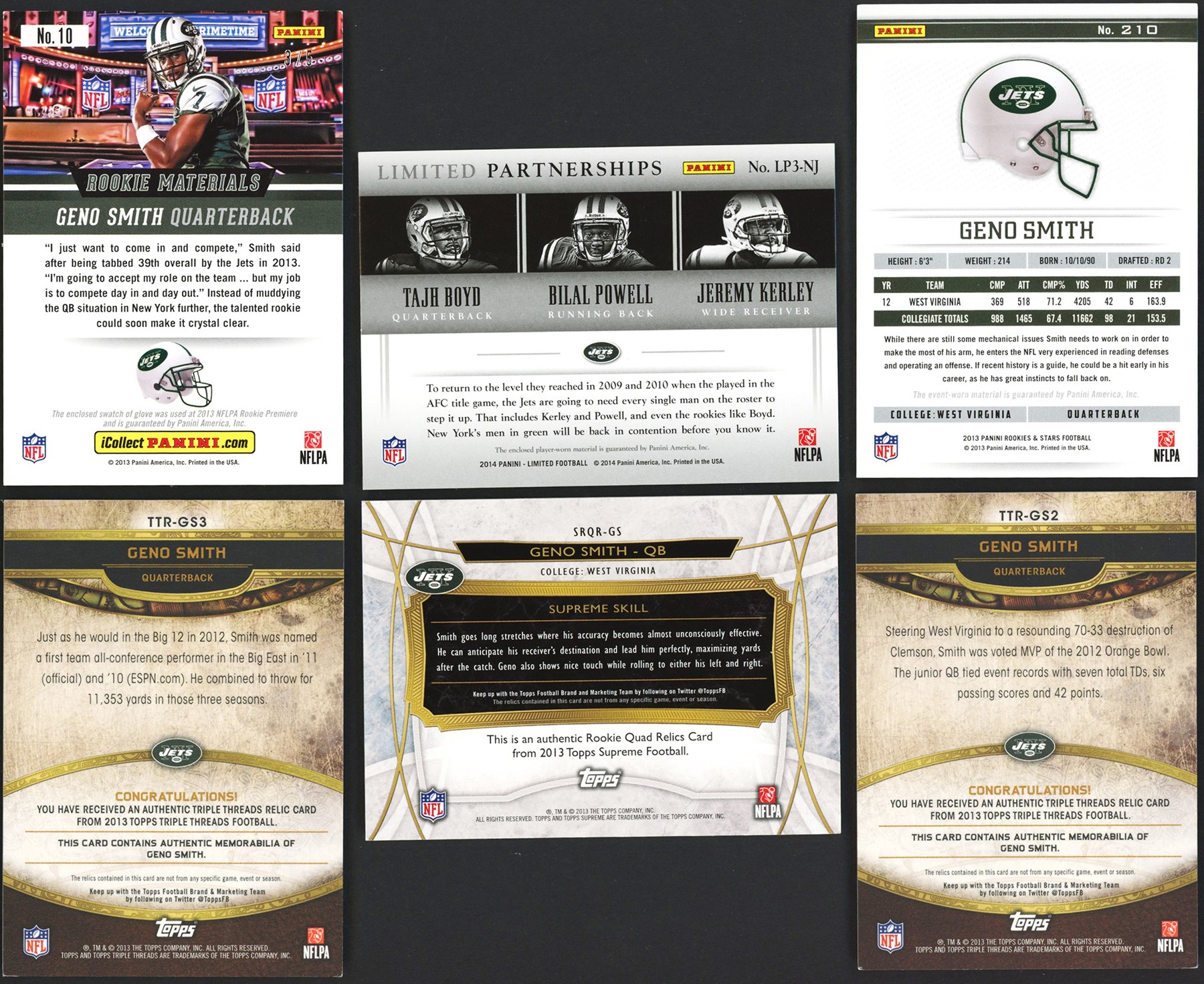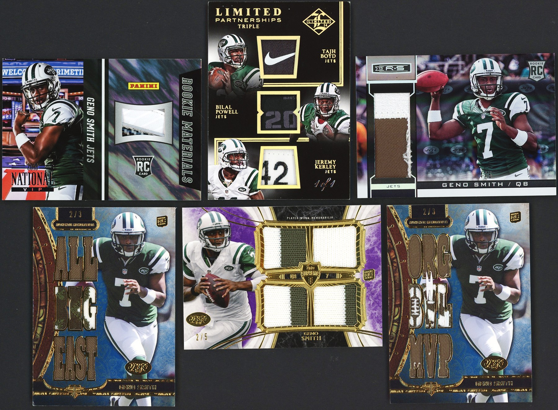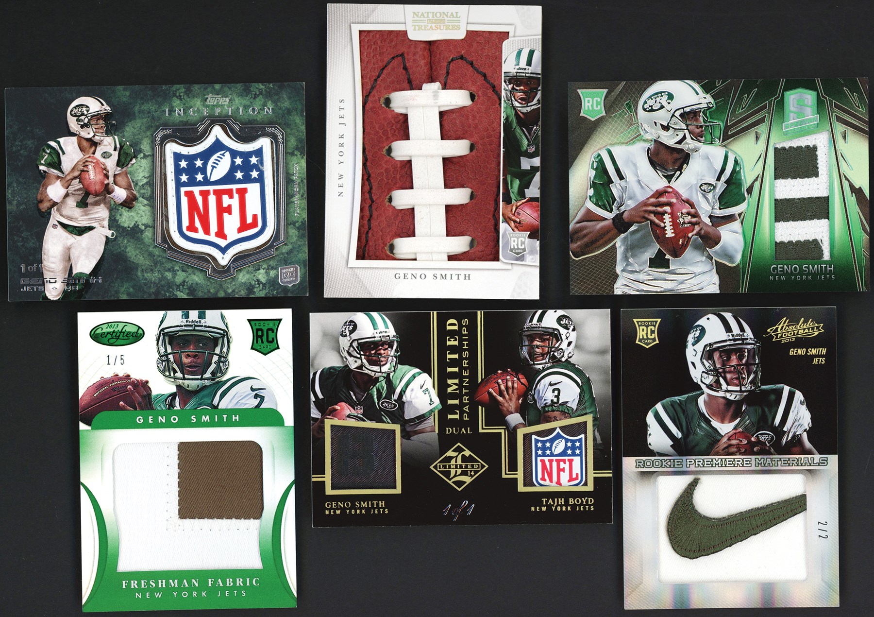 This lot features a collection of (14) 2013-14 Geno Smith Patch & Relic Collection. This lot features 1/1s, NFL Shields, logo patches and other unique patches and relics including: 2013 Panini National Treasures #11 Geno Smith Jumbo Football Material #1/4; 2013 Panini Certified #311 Geno Smith Freshman Fabric Relic #1/5; 2013 Panini Rookies & Stars #210 Geno Smith Jumbo Relic #4/5; 2013 Panini Spectra #211 Geno Smith Prime Relic #5/5; 2013 Panini Absolute #211 Geno Smith Rookie Premier Materials Nike Swoosh Relic #2/2; 2013 Panini National VIP #10 Geno Smith Rookie Materials #3/5; 2013 Topps Inception #RSLP-GS Geno Smith NFL Shield Relic #1/1; 2013 Topps Triple Threads #TTR-GS2 Geno Smith Relic #2/3; 2013 Topps Triple Threads #TTR-GS3 Geno Smith Relic #2/3; 2013 Topps Magic #MRR-GS Geno Smith Authentic Worn Relic #5/5; 2013 Topps Supreme #SRQR-GS Geno Smith Player Worn Quad Patch #2/5; 2013 Topps Five Star #FSJJR-GS Geno Smith Jumbo Jersey Relic #1/5; 2014 Panini Limited #LP2-JT Geno Smith/Tajh Boyd Limited Dual Partnerships NFL Shield/Laundry Tag #1/1; 2014 Panini Limited #LP3-NJ Tajh Boyd/Bilal Powell/Jeremy Kerley Limited Partnerships Triple Relic #1/1.