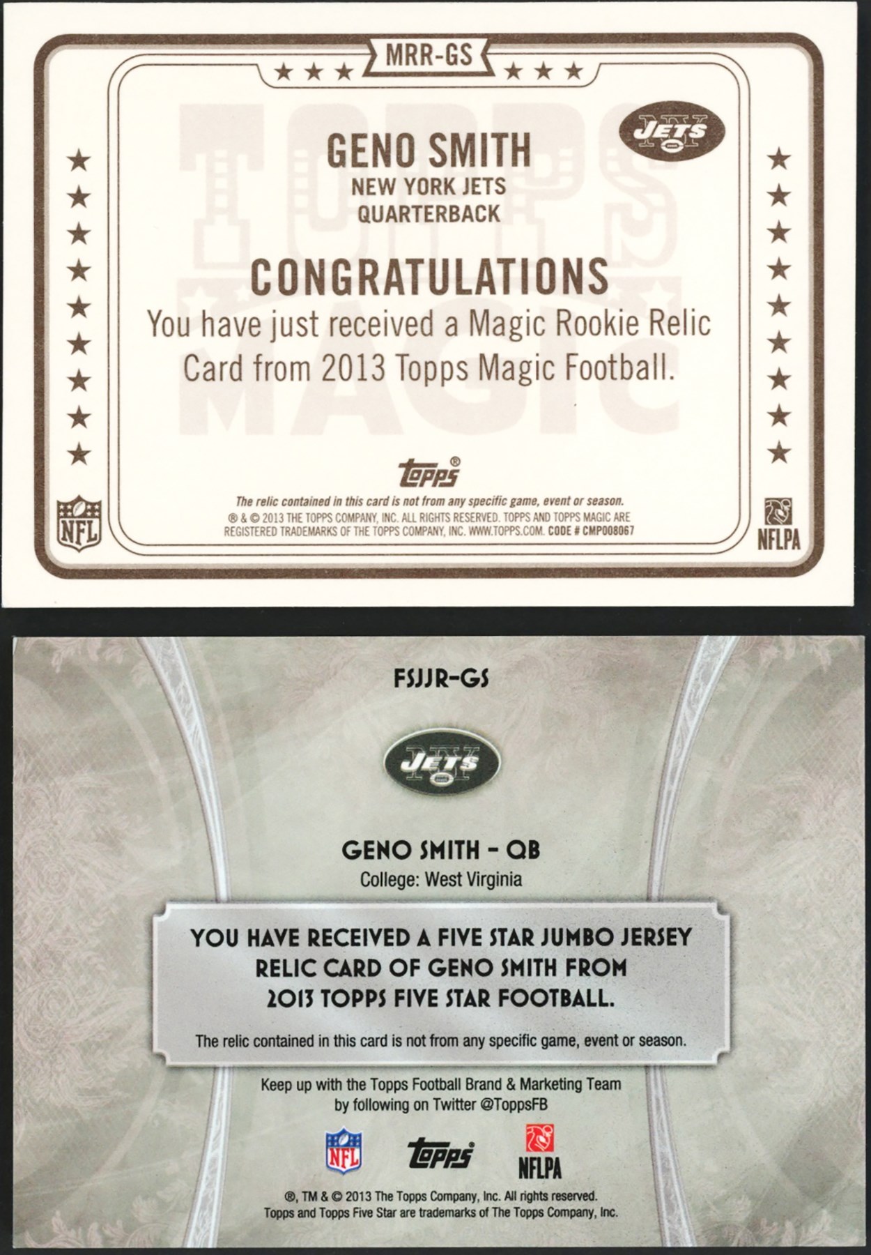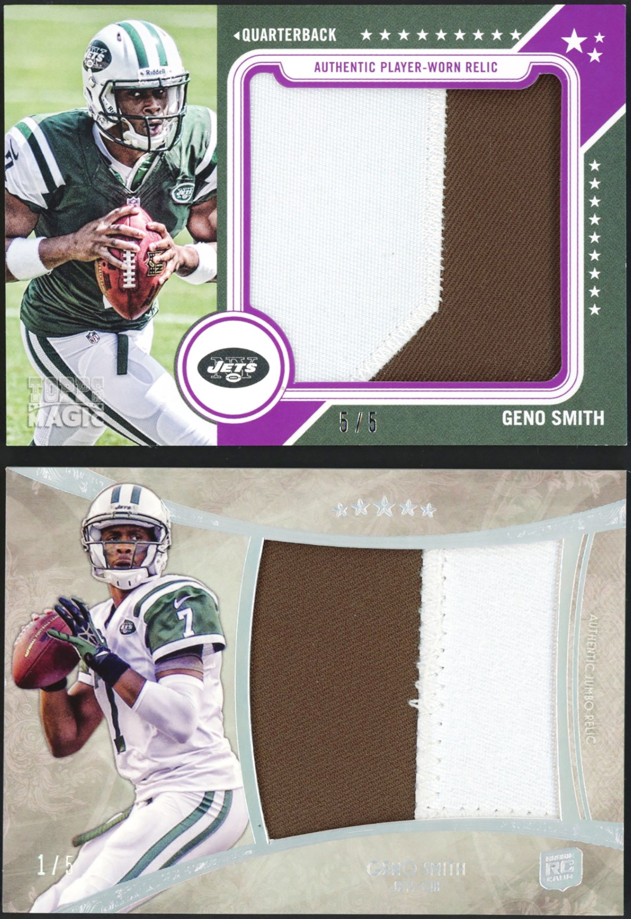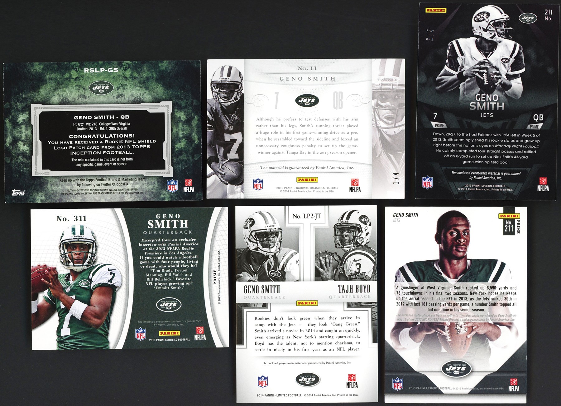 This lot features a collection of (14) 2013-14 Geno Smith Patch & Relic Collection. This lot features 1/1s, NFL Shields, logo patches and other unique patches and relics including: 2013 Panini National Treasures #11 Geno Smith Jumbo Football Material #1/4; 2013 Panini Certified #311 Geno Smith Freshman Fabric Relic #1/5; 2013 Panini Rookies & Stars #210 Geno Smith Jumbo Relic #4/5; 2013 Panini Spectra #211 Geno Smith Prime Relic #5/5; 2013 Panini Absolute #211 Geno Smith Rookie Premier Materials Nike Swoosh Relic #2/2; 2013 Panini National VIP #10 Geno Smith Rookie Materials #3/5; 2013 Topps Inception #RSLP-GS Geno Smith NFL Shield Relic #1/1; 2013 Topps Triple Threads #TTR-GS2 Geno Smith Relic #2/3; 2013 Topps Triple Threads #TTR-GS3 Geno Smith Relic #2/3; 2013 Topps Magic #MRR-GS Geno Smith Authentic Worn Relic #5/5; 2013 Topps Supreme #SRQR-GS Geno Smith Player Worn Quad Patch #2/5; 2013 Topps Five Star #FSJJR-GS Geno Smith Jumbo Jersey Relic #1/5; 2014 Panini Limited #LP2-JT Geno Smith/Tajh Boyd Limited Dual Partnerships NFL Shield/Laundry Tag #1/1; 2014 Panini Limited #LP3-NJ Tajh Boyd/Bilal Powell/Jeremy Kerley Limited Partnerships Triple Relic #1/1.