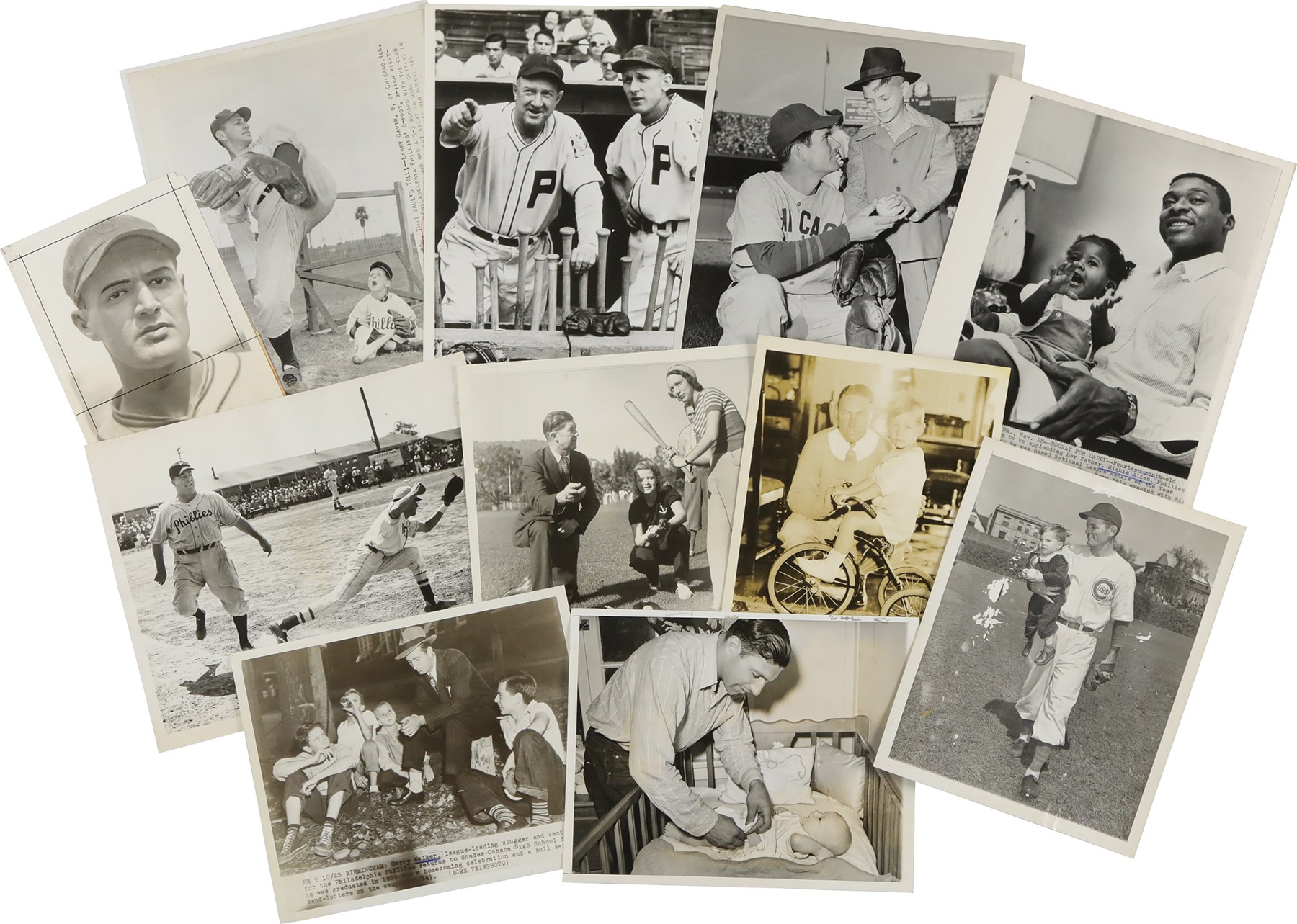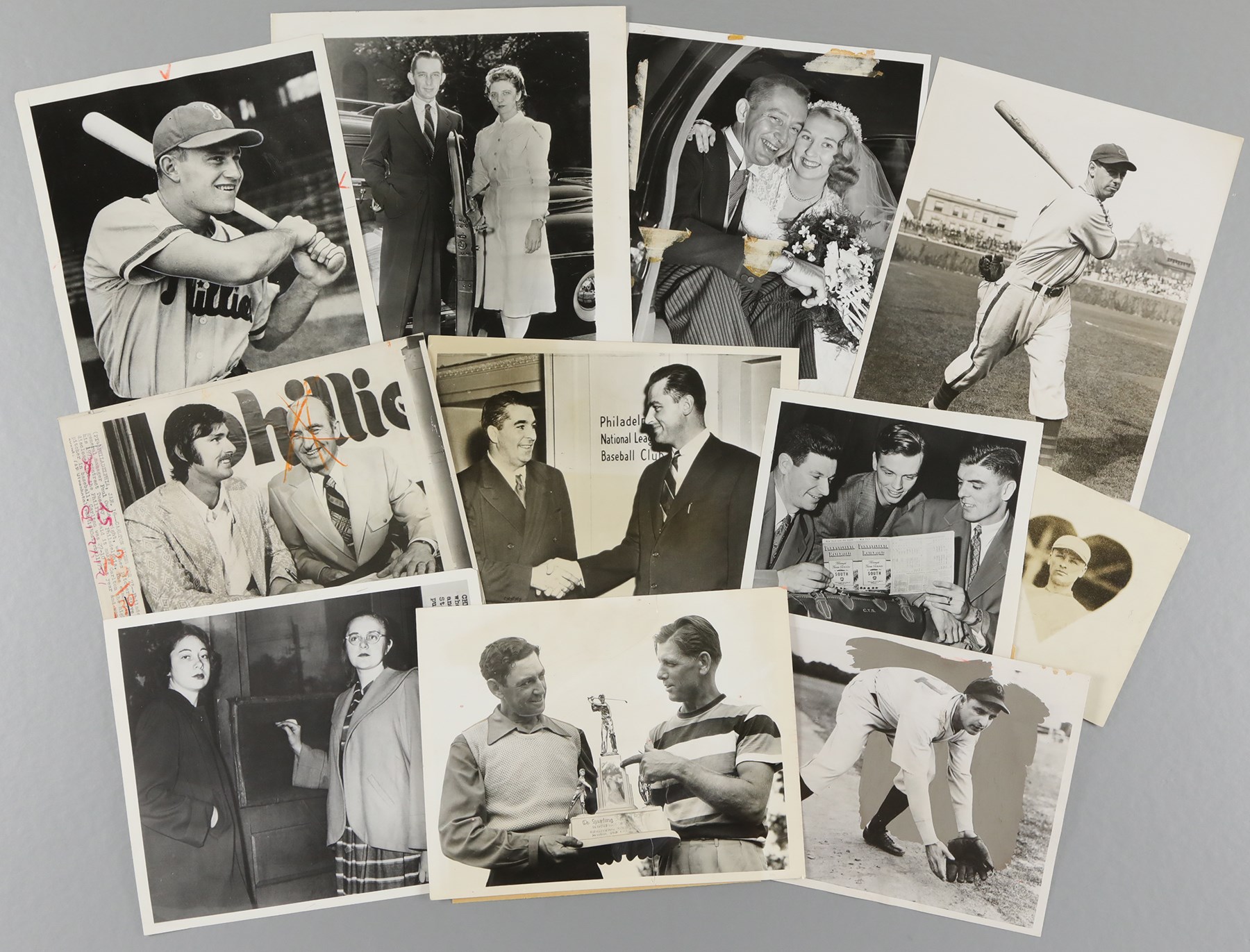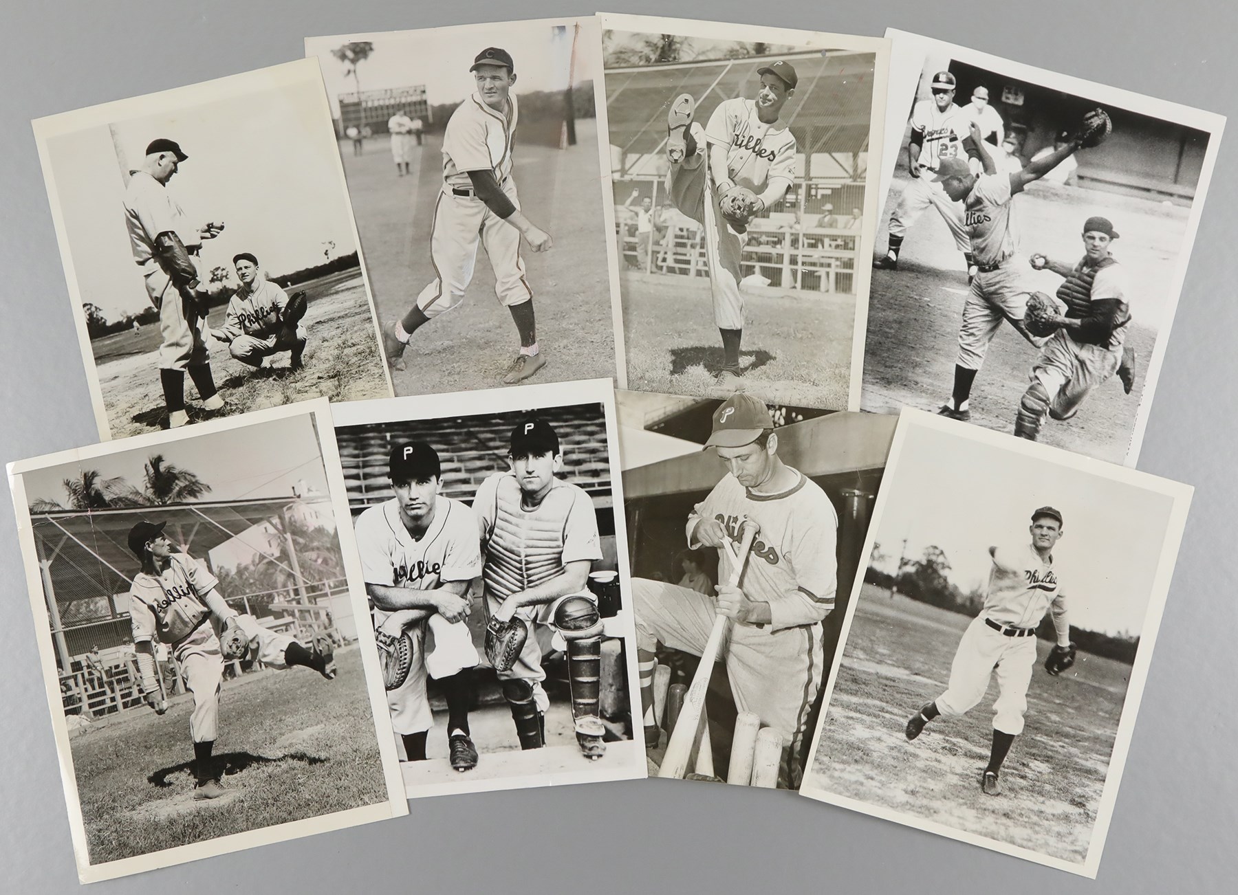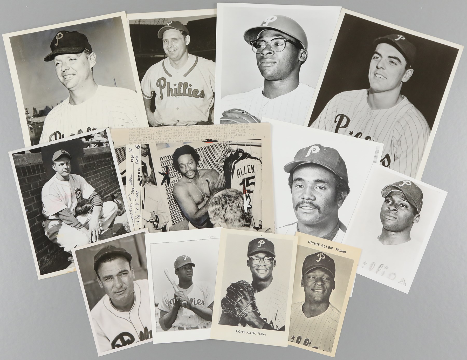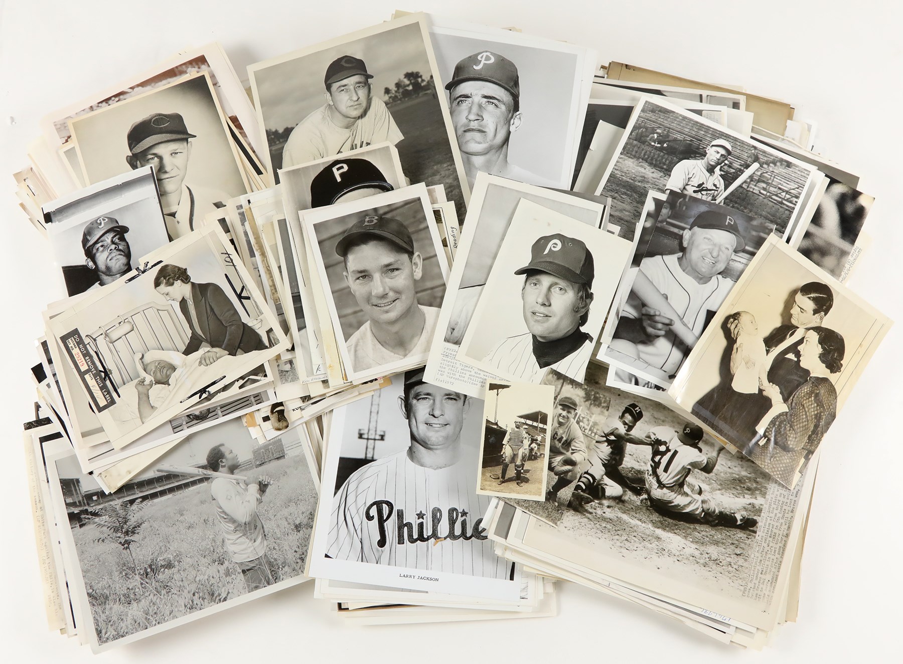 Large collection of approximately 1,350 photos, nearly all of which picture individuals who played with the Philadelphia Phillies at some point in their career. Most of the photos picture the player in a Phillies uniform, but some are pictured as a member of another club, either before or after they played with the Phillies. The majority of the photos picture players whose careers spanned the years 1940 through 1980. Although many news photos are represented here, the vast majority of the photos are second or third-generation prints, including team publicity stills. Many photos picture the player or players off field, either at home, in the hospital, or at various events with their wives. Included in the collection are also premium photos (such as those issued by Baseball Magazine), as well as some magazine and periodical photos. Many players are represented more than once, either in different poses, or as actual duplicate photos. Approximately half the photos measure 8x10", with the remainder in various smaller sizes (mainly 7x9" or 5x7"). Approximately 20% of the photos have been trimmed to their current dimensions. Condition ranges from Poor to Excellent, averaging Good.