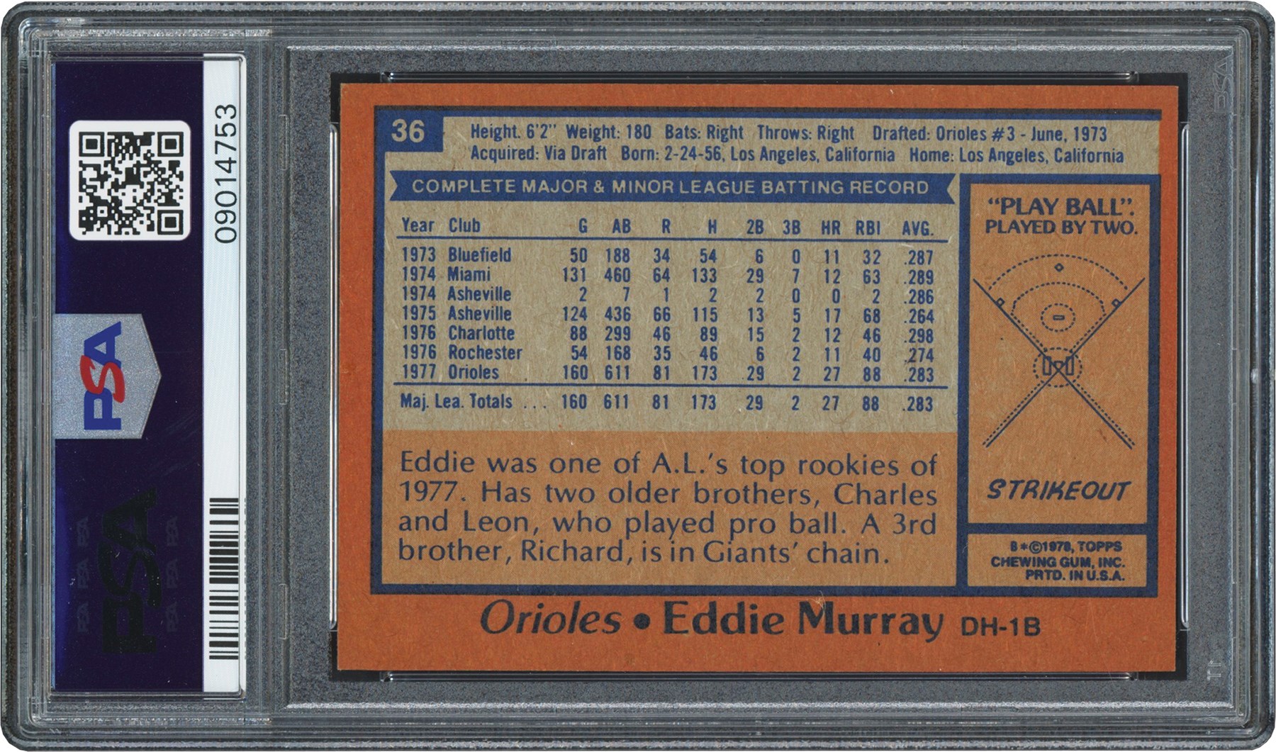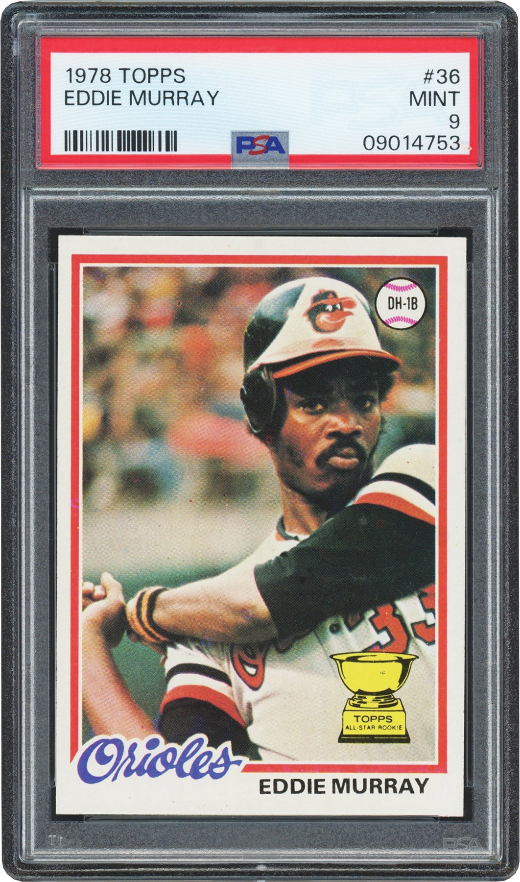 1978 Topps Baseball 36 Eddie Murray (R) card. The card has been graded and encapsulated by PSA MINT 9. It has a clear image of a swinging Murray with a stadium background. The borders remain bright white while the edges are crisp All four corners are sharp. Centering is good. The reverse is clean and bright.