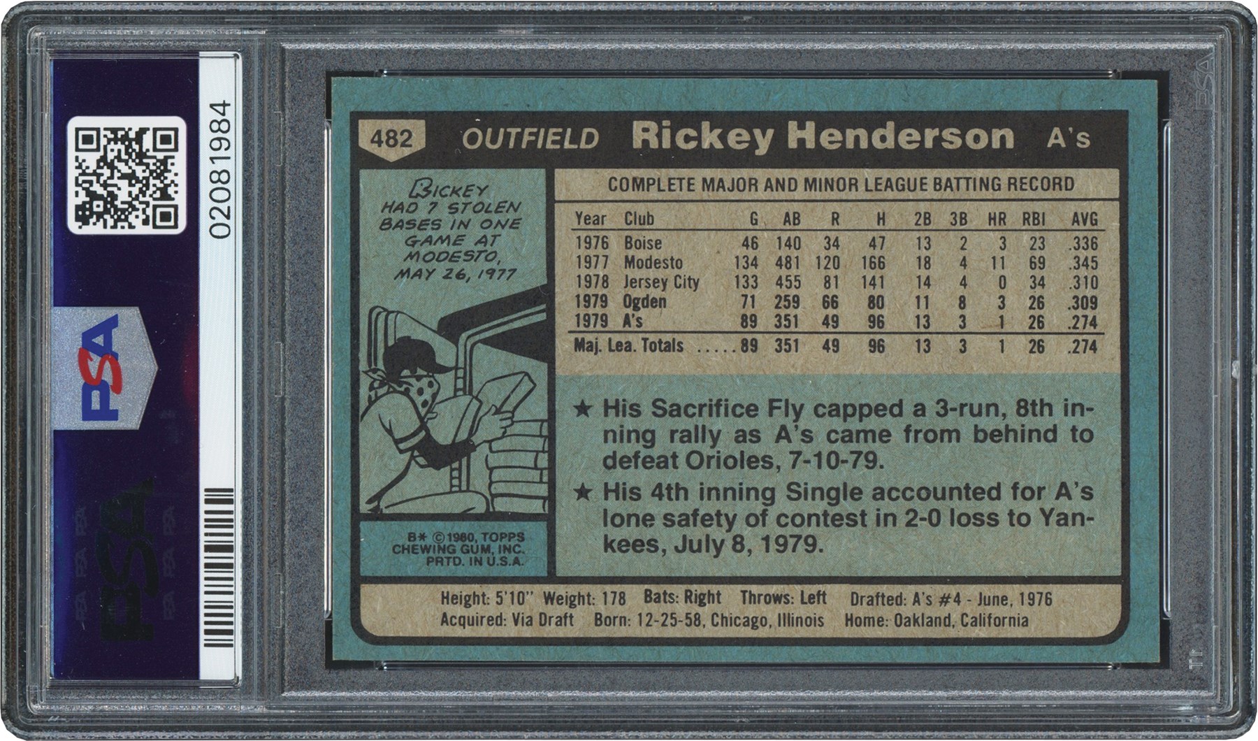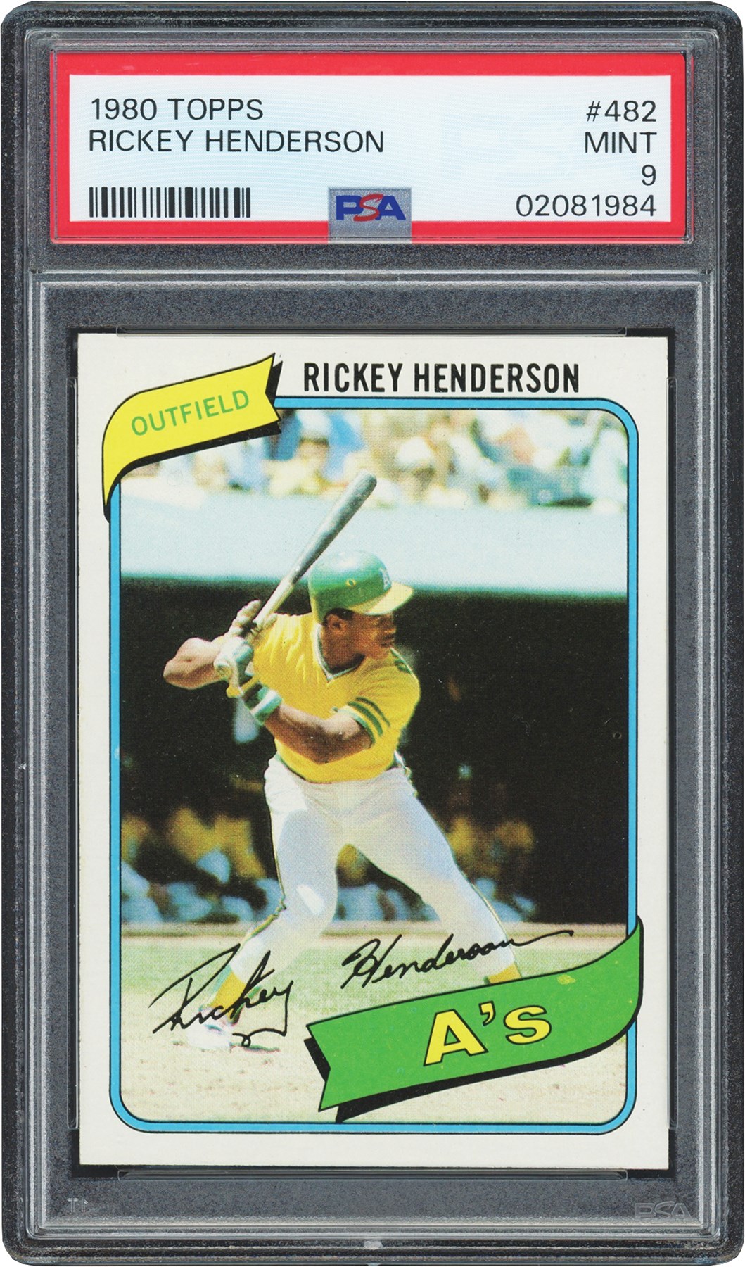 1980 Topps Baseball 482 Rickey Henderson (R) card. The card has been graded and encapsulated by PS MINT 9. It has a colorful image of Henderson at bat set against a stadium background. The borders remain bright white while the edges are crisp. Centering appears excellent while all four corners are sharp. The reverse is clean.