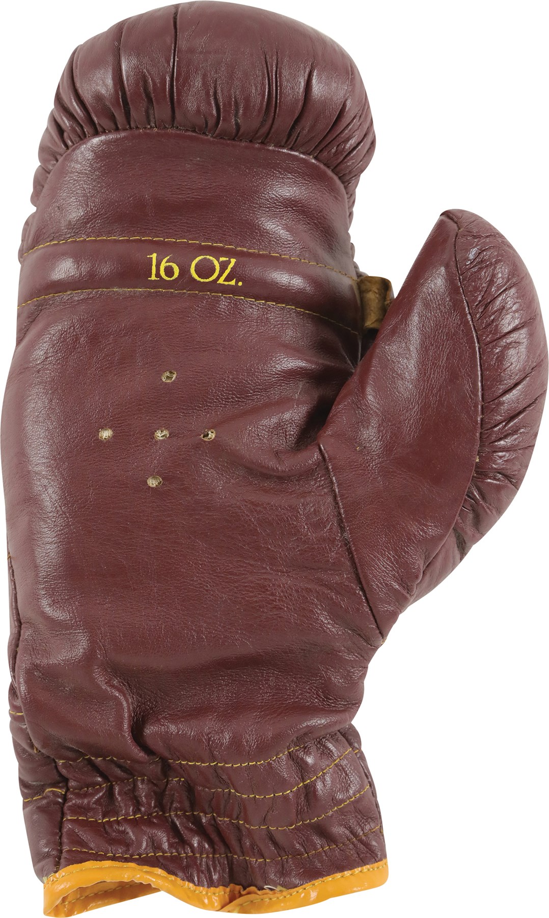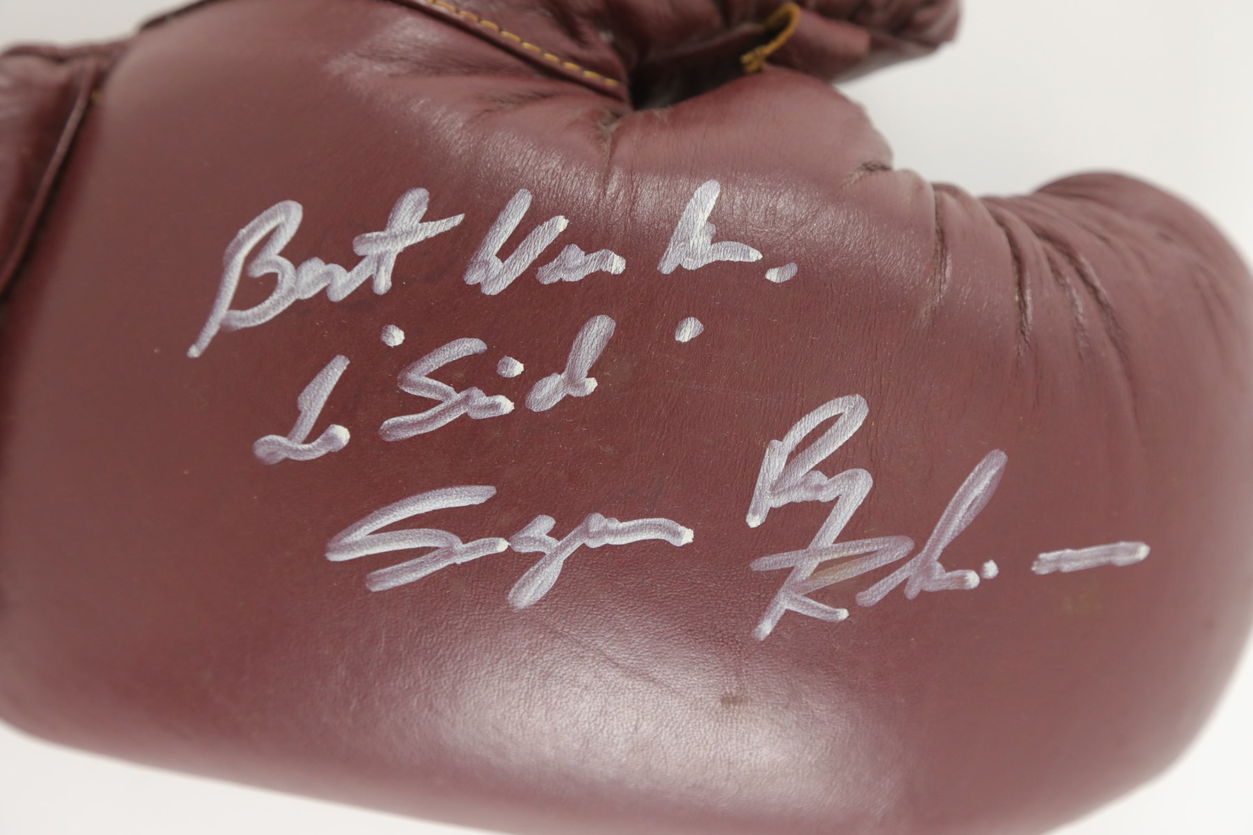 Sugar Ray Robinson signed Everlast boxing glove. Robinson signed this 16 oz., right-handed glove with a silver Sharpie marker. He included "Best wishes" with his signature. The glove is in excellent condition. Robinson is considered by many to be the best pound-for-pound fighter of all time. He was inducted into the International Boxing Hall of Fame in 1990. Includes a full LOA from PSA.