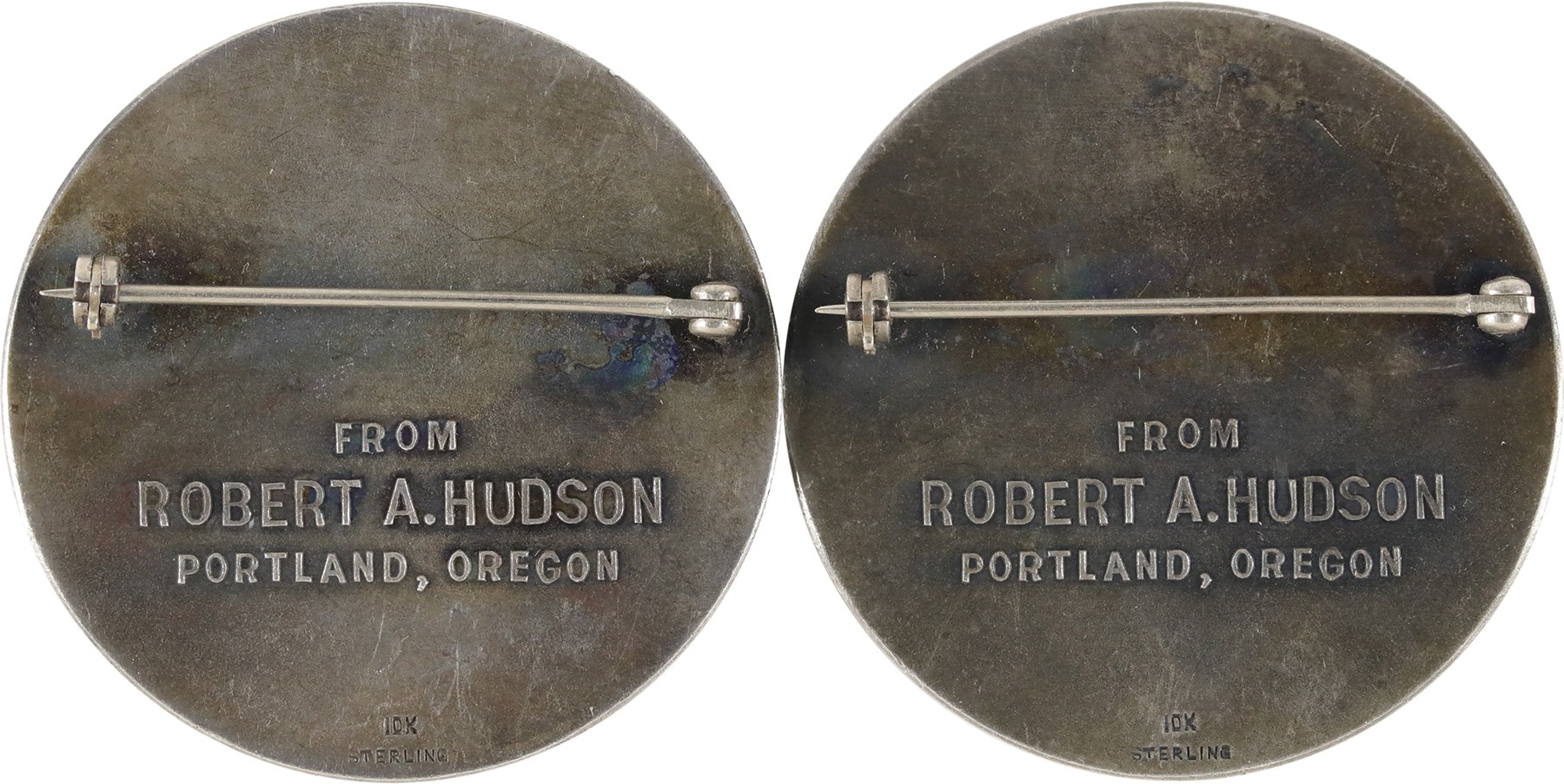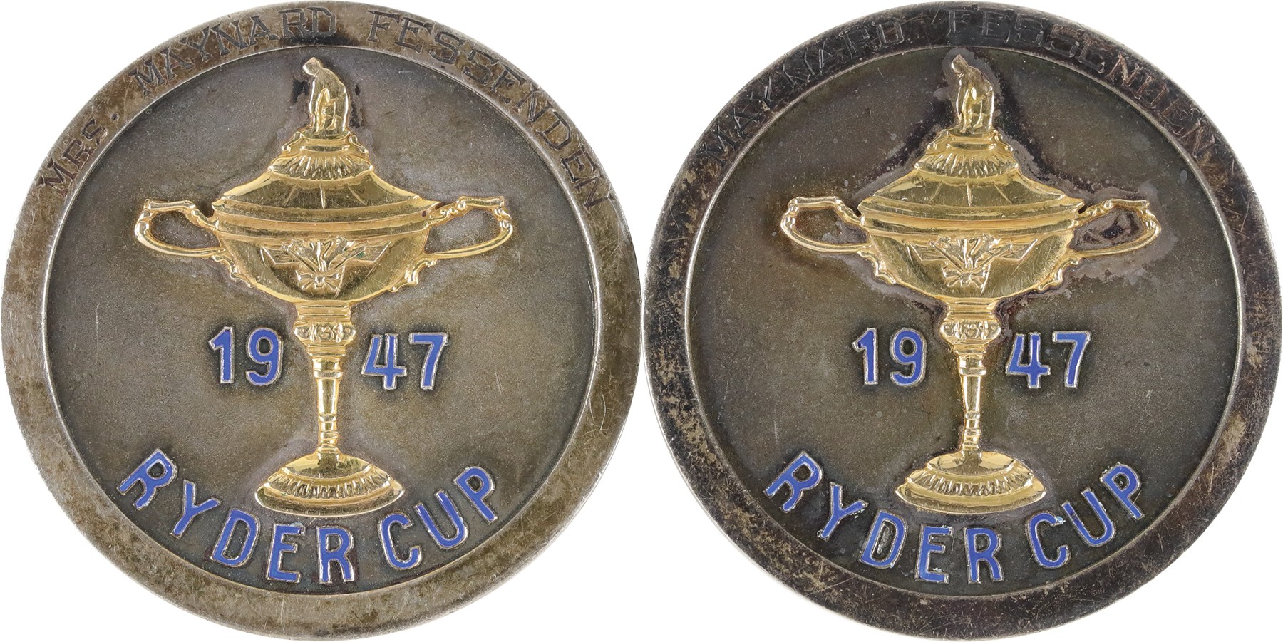 Lot of two 1947 Ryder Cup badges. Each badge measures 1.5" in diameter and features a gold-colored Ryder Cup trophy on the front. "RYDER CUP" and "1947" is on the front of the badge in blue. "MAYNARD FESSENDEN" is engraved on the outer edge of one of the badges, and "MRS. MAYNARD FESSENDEN" is engraved on the other. A pin is present on the back of the badges, and "FROM ROBERT A. HUDSON, PORTLAND, OREGON" is visible below the pin. These badges belonged to Maynard Fessenden and his wife. Maynard was the president of the Chicago District Golf Association, and is widely known around the golf world.